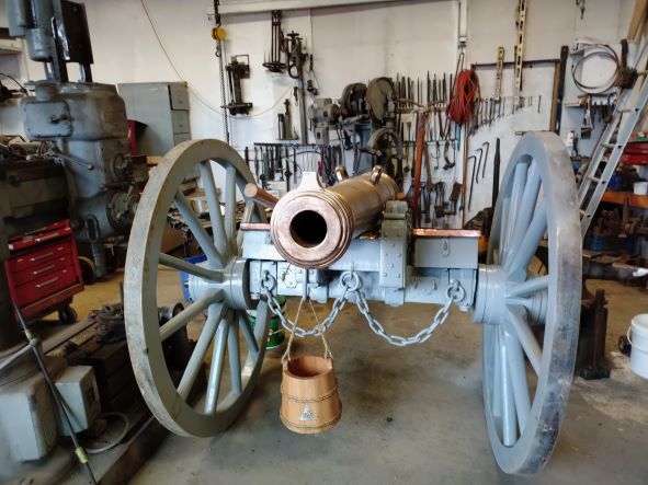 Bronze 9-pounder Smoothbore Muzzleloading Gun, weight 1,539 lbs, 1822, Serial No. 744, 1858 carriage, recently restored.