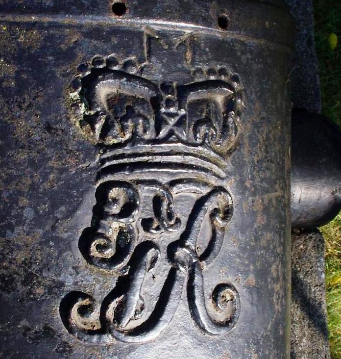 SBML probable Borgard 6-pounder Gun of 1716, weight 18-2-23 (2,095 lbs), Queen Anne cypher (1702 – 1714), resting on the remains of a 6-pounder iron garrison carriage, weight 14-3-25 (1,677 lbs) K, (Serial No. 23).  Discovery Harbour.
