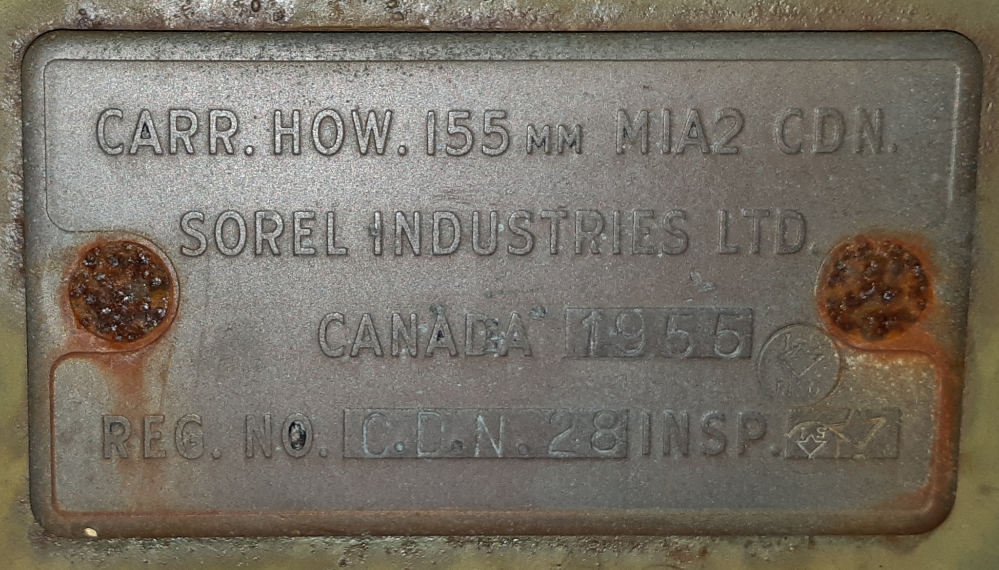 155-mm C1 (M1A2) Medium Howitzer on M1A2 Carriage, aka M114, manufactured at Sorel Industries Limited in Quebec, Queen Elizabeth II cypher.  CFR 34421.  The carriage plate reads: CARR. HOW. 155MM M1A2 CDN. SOREL INDUSTRIES LTD. CANADA 1955, REG. NO. CDN 28, INSP (Symbol).  This Gun is located on the Southeast side of the Highway entering the village.  (Author Photo)