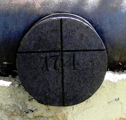 Blomefield SBML 12-pounder replica Gun, weight 31-3-21 (3,577 lbs), 1808, King George III cypher, broad arrow mark, mounted on a wood naval gun carriage. This gun is located on the ramparts of the North-East bastion.