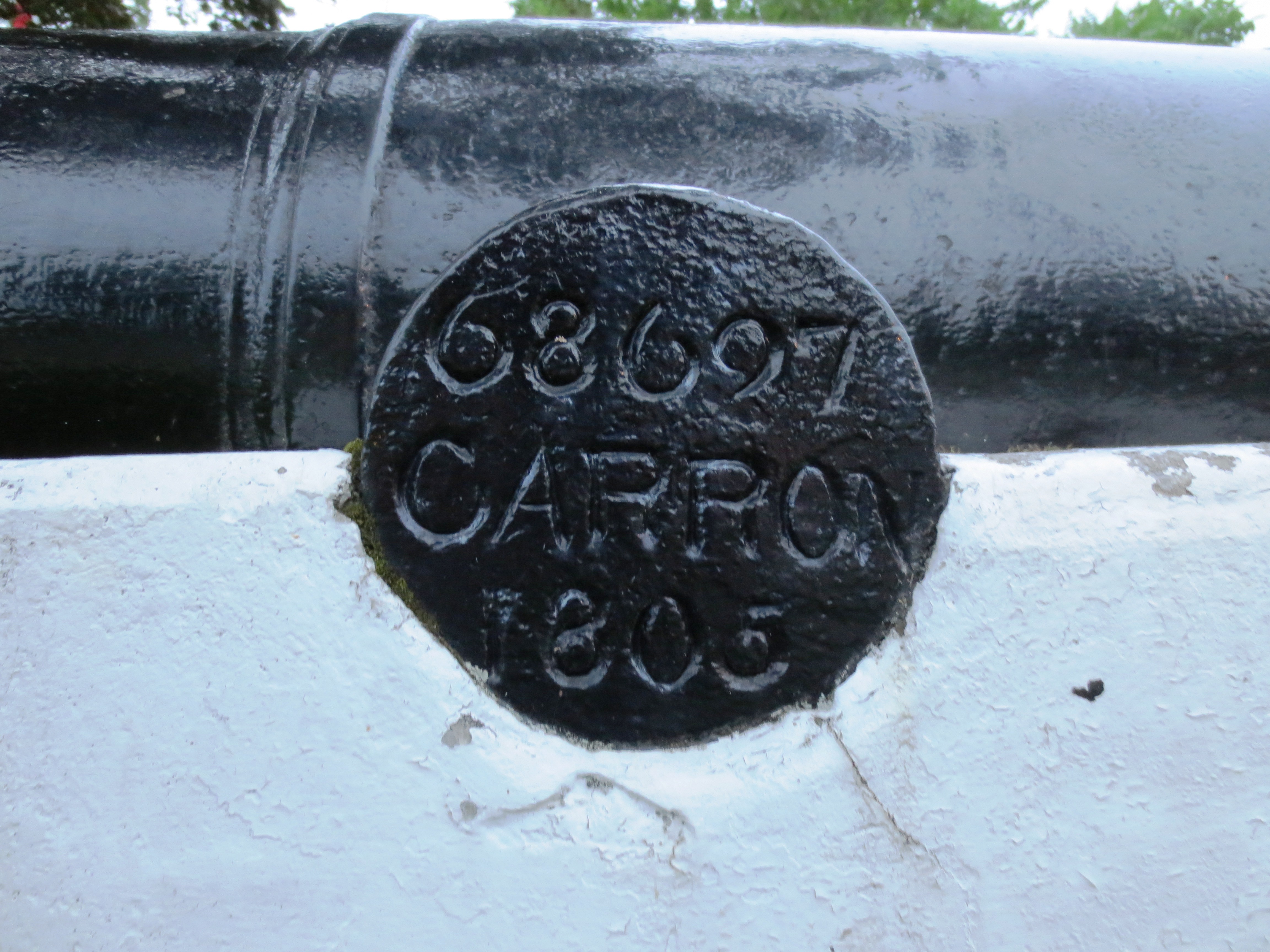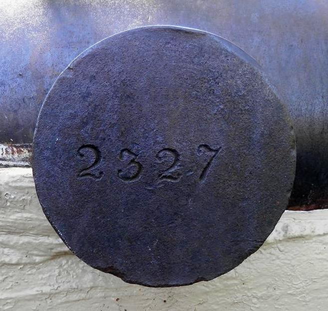Cast Iron 32-pounder 17-cwt Smoothbore Muzzleloading Carronade with Blomefield pattern breeching ring, weight 17-0-9 (1,913 lbs), (Serial No. 9, CARRON) beside the BO mark. CV, NC, Q stamped on the cascabel. This Carronade is located in front of the Visitor Centre.