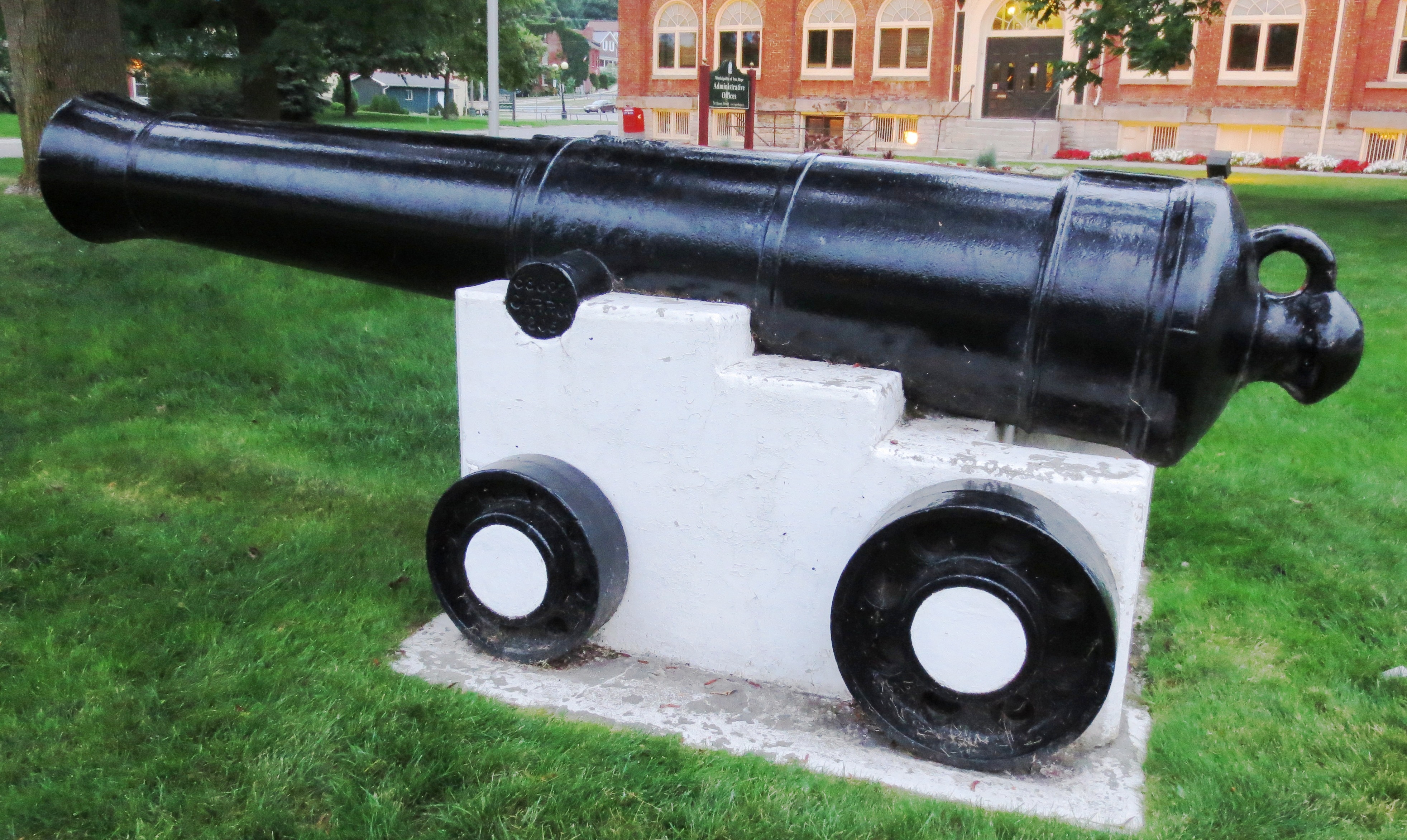 SBML 18-pounder 10-cwt Carronade with a Blomefield pattern breeching ring, weight TBC, mounted on a wood Naval Gun carriage, Powell Park (corner of Main Street and Park Street), behind the cenotaph.