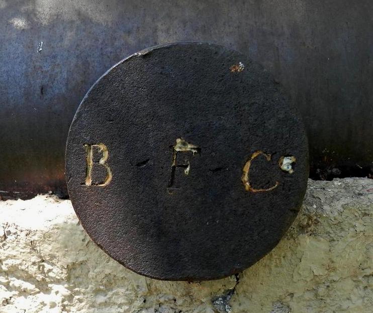 SBML 10-inch Land Service Mortar, weight 16-2-6 (1,854 lbs), BO, broad arrow mark, two dolphin handles. No. 1, southeast of the Blockhouse.