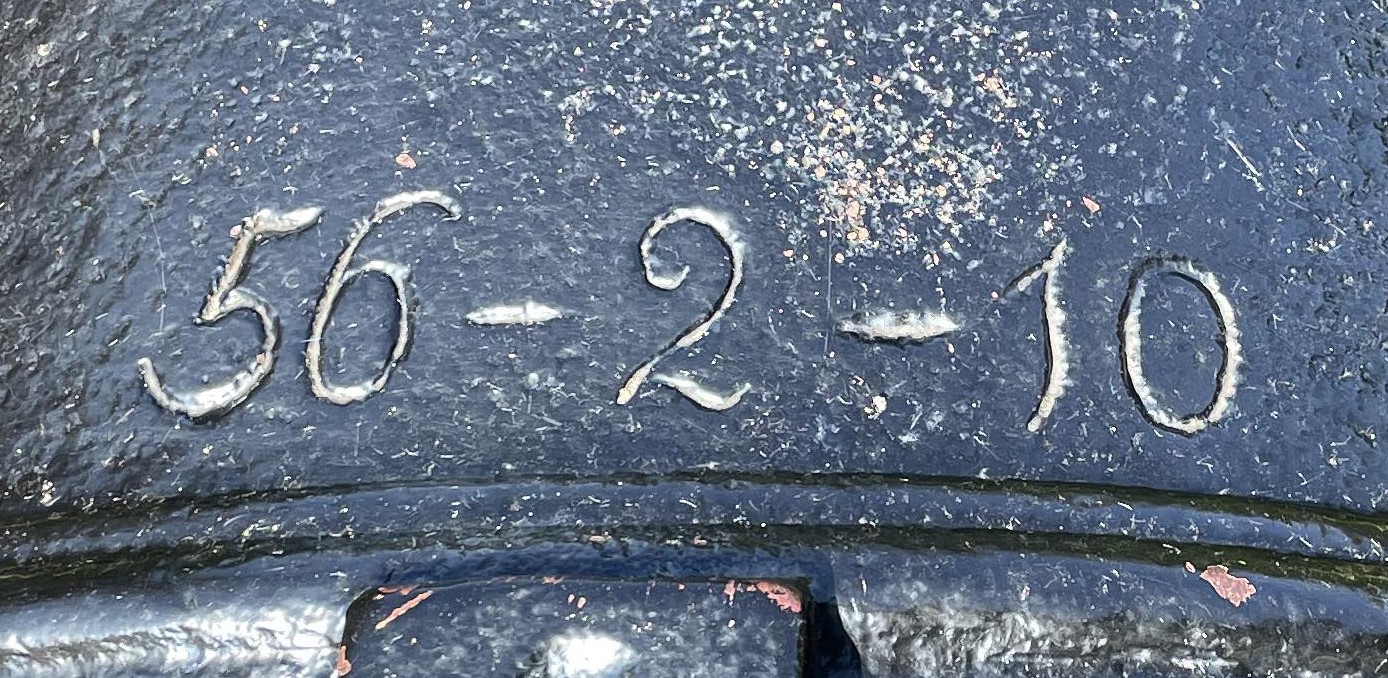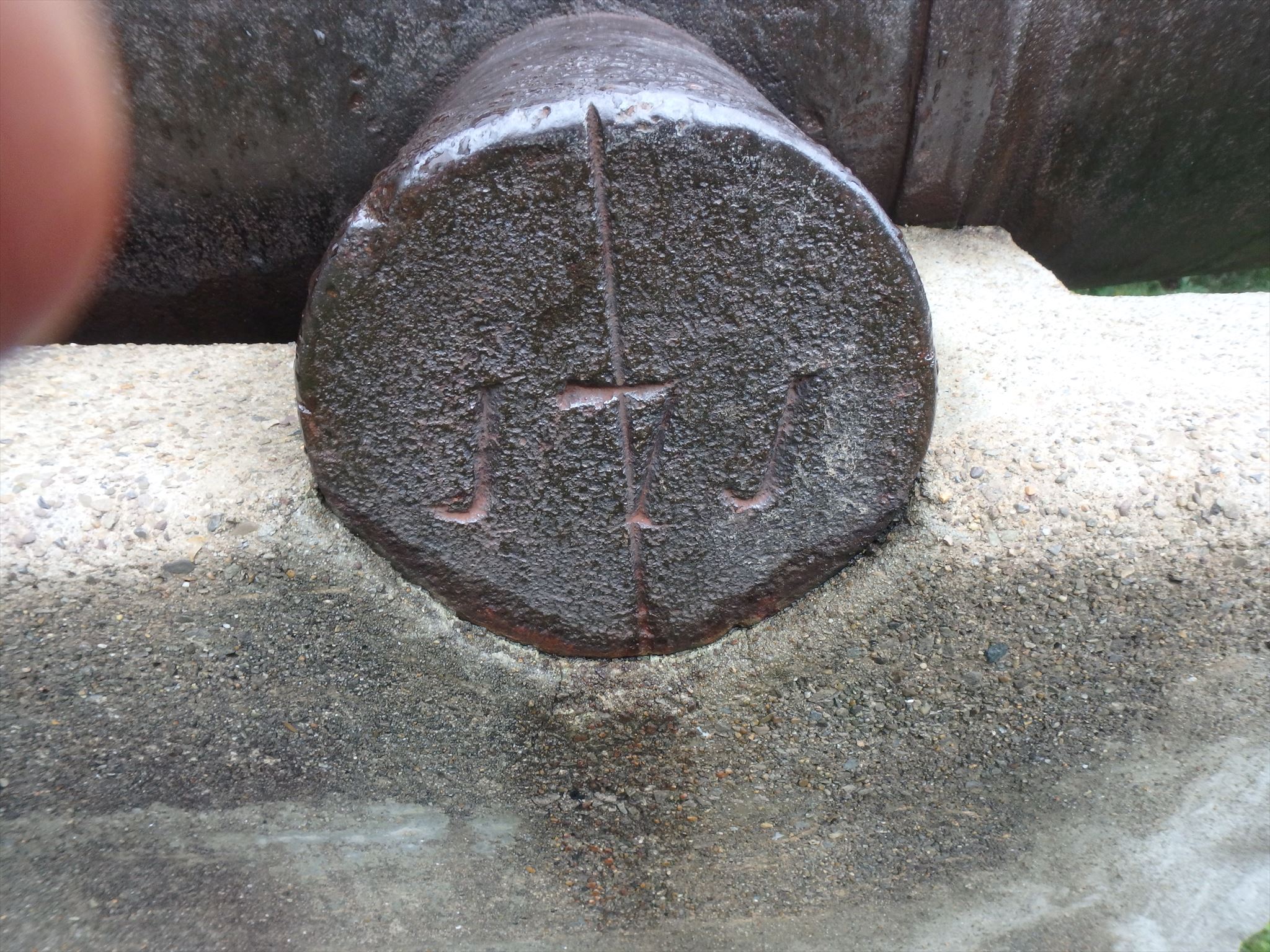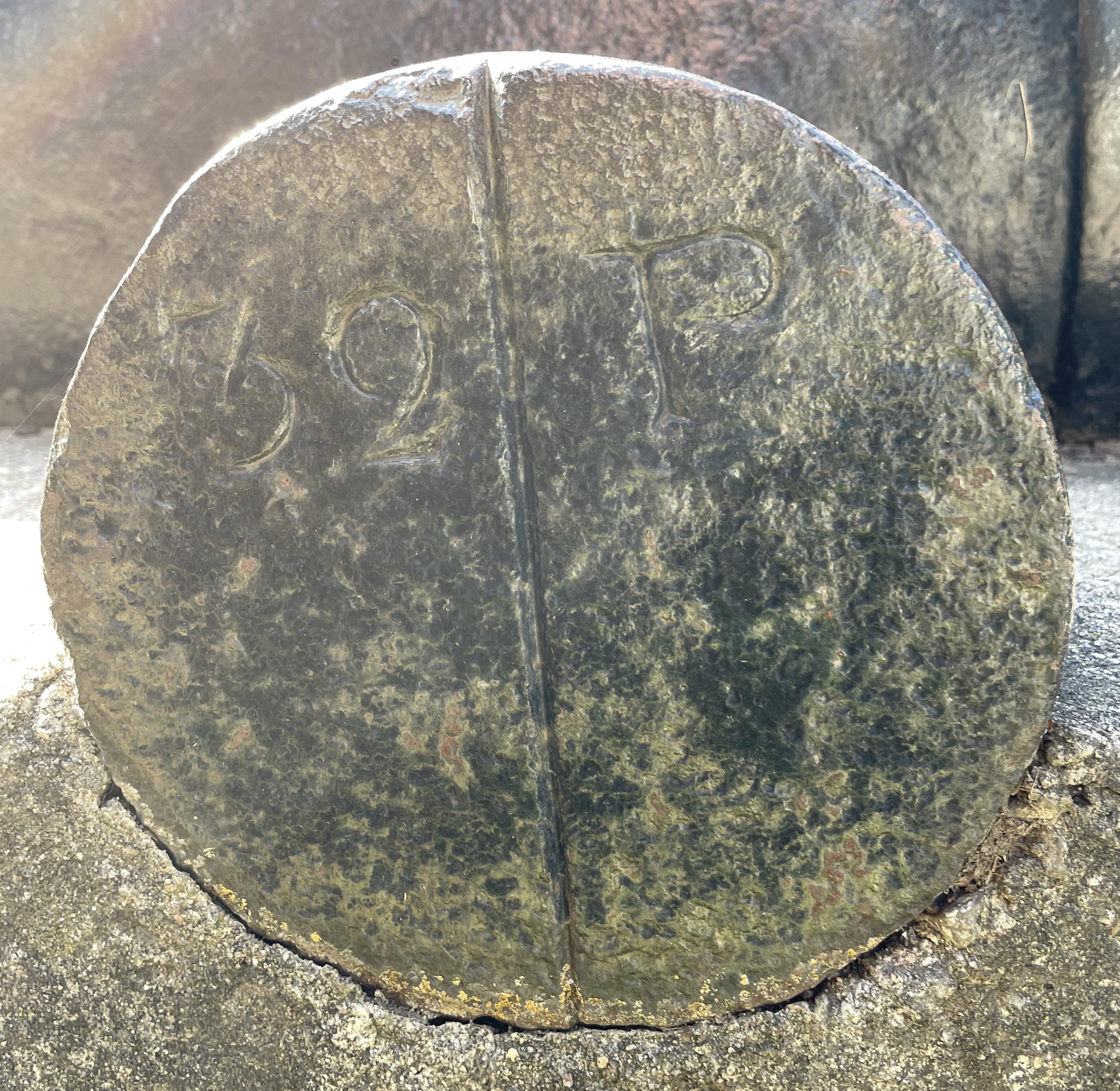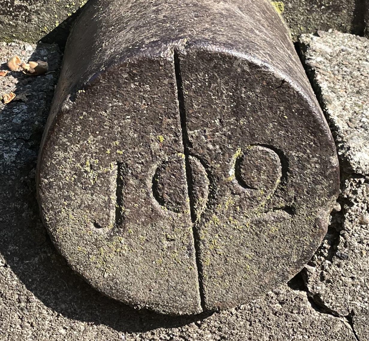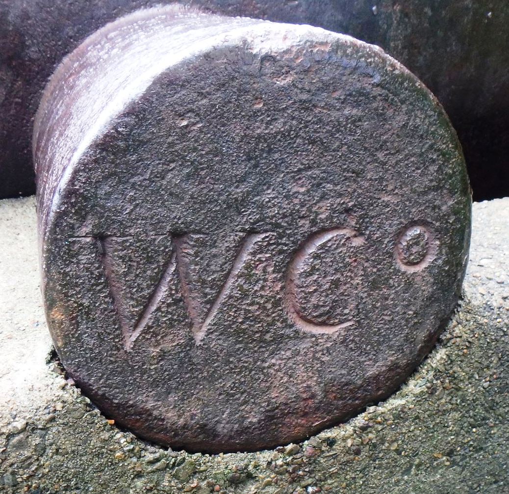 Blomefield Cast Iron 24-pounder 50-cwt Smoothbore Muzzleloading Gun, weight 48-0-22 (5,510 lbs), (WCo) (Walker & Company) on left trunnion, (Serial No. 163) on right trunnion, King George III cypher, broad arrow mark, mounted on a wood naval gun carriage.  No. 2 of 2 beside the Smith’s Knoll Monument.