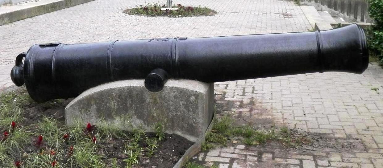 Blomefield Cast Iron 24-pounder 50-cwt Smoothbore Muzzleloading Gun, weight TBC, (Serial No. 37) on left trunnion, (L) on right trunnion, Lowmoor, no cypher, broad arrow mark.  Battlefield House near Historical Plaque.