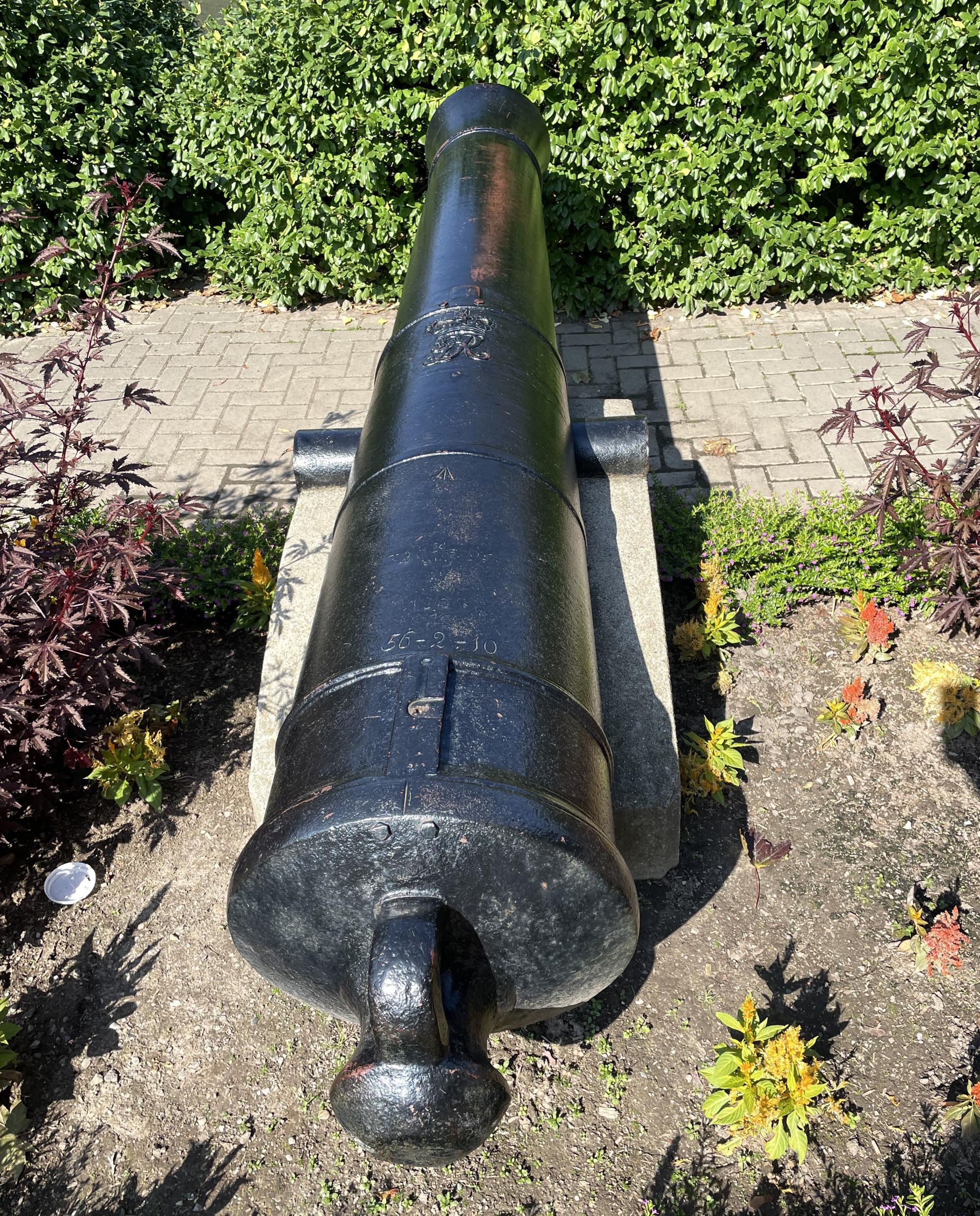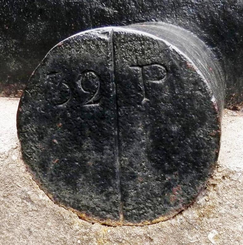 Blomefield Cast Iron 32-pounder 56-cwt Smoothbore Muzzleloading Gun, weight 56-2-10 (6,338 lbs) above the vent, (Serial No. 71661, CARRON, 1807) on left trunnion, (32P) on right trunnion, King George III cypher, broad arrow mark.  Located near the city cenotaph. No. 1 of 2 guns.