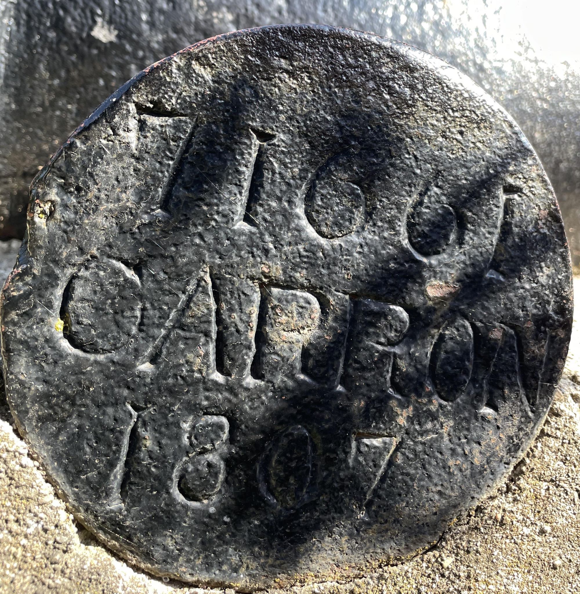 Blomefield Cast Iron 24-pounder 50-cwt Smoothbore Muzzleloading Gun, weight 49-3-21 (5,593 lbs), (WCo) (Walker & Company) on left trunnion, (Serial No. 145) on right trunnion, King George III cypher, broad arrow mark, mounted on a wood naval gun carriage.   No. 1 of 2 beside the Smith’s Knoll Monument.