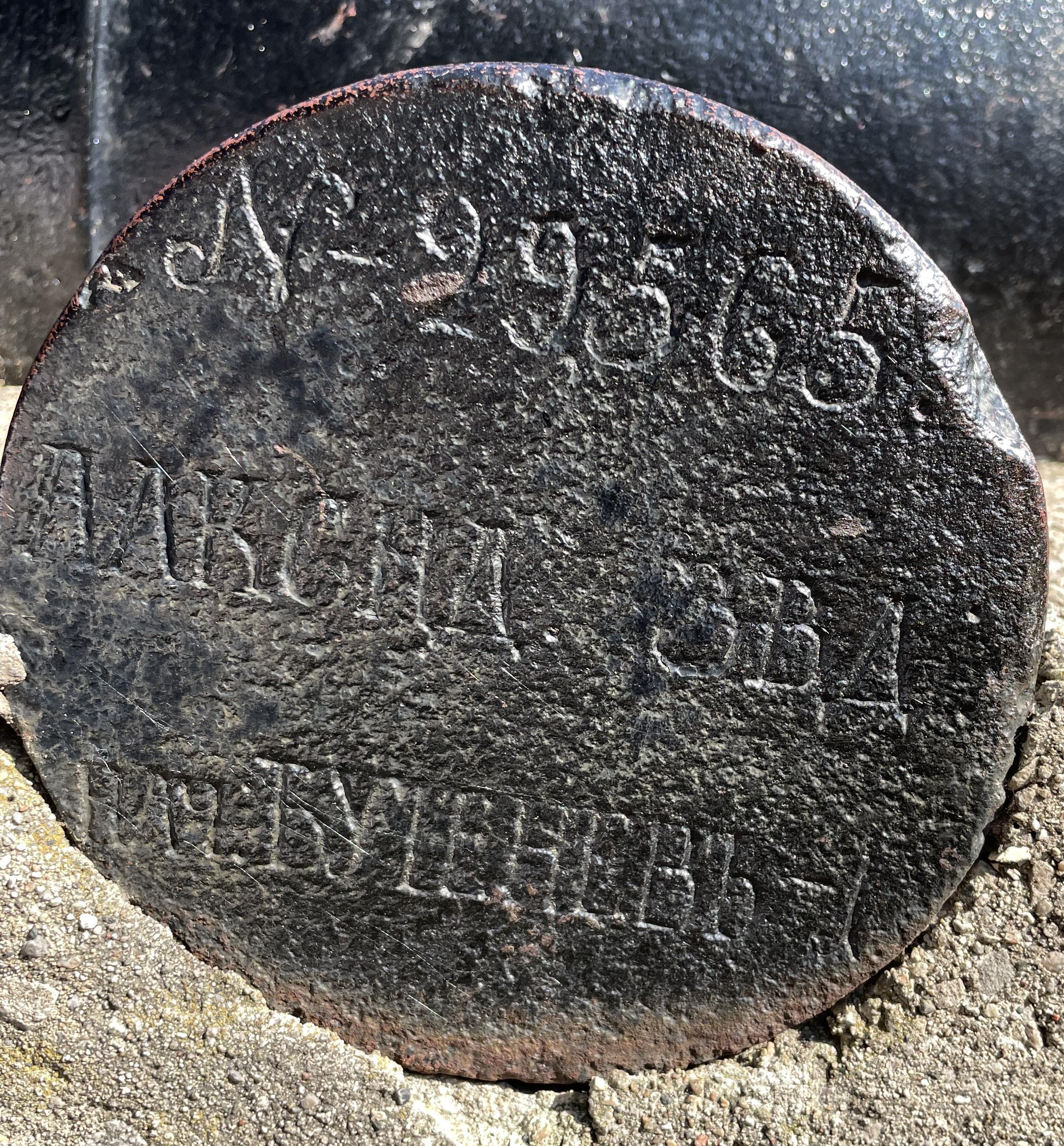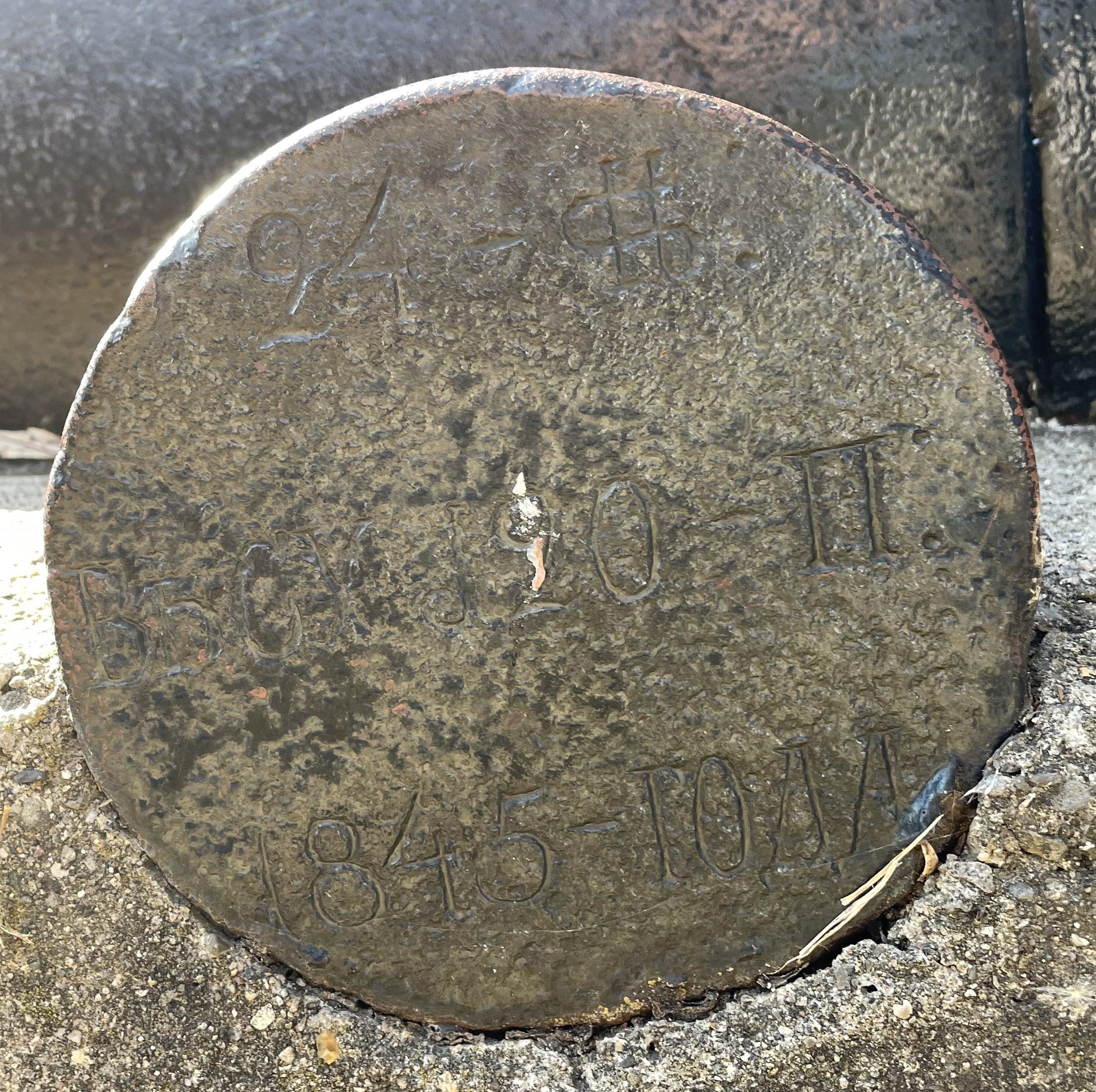 Russian Millar pattern Cast Iron 24-pounder 50-cwt Smoothbore Muzzleloading Gun, (Serial No. 29565), forged by Armstrong at Alexandrovski, with double-headed Eagle, Crimean War trophy, stamped 1845, MA on breech, tv, ck.  Located near the city cenotaph.  The swell on the muzzle is broken. No. 2 of 2 guns.
