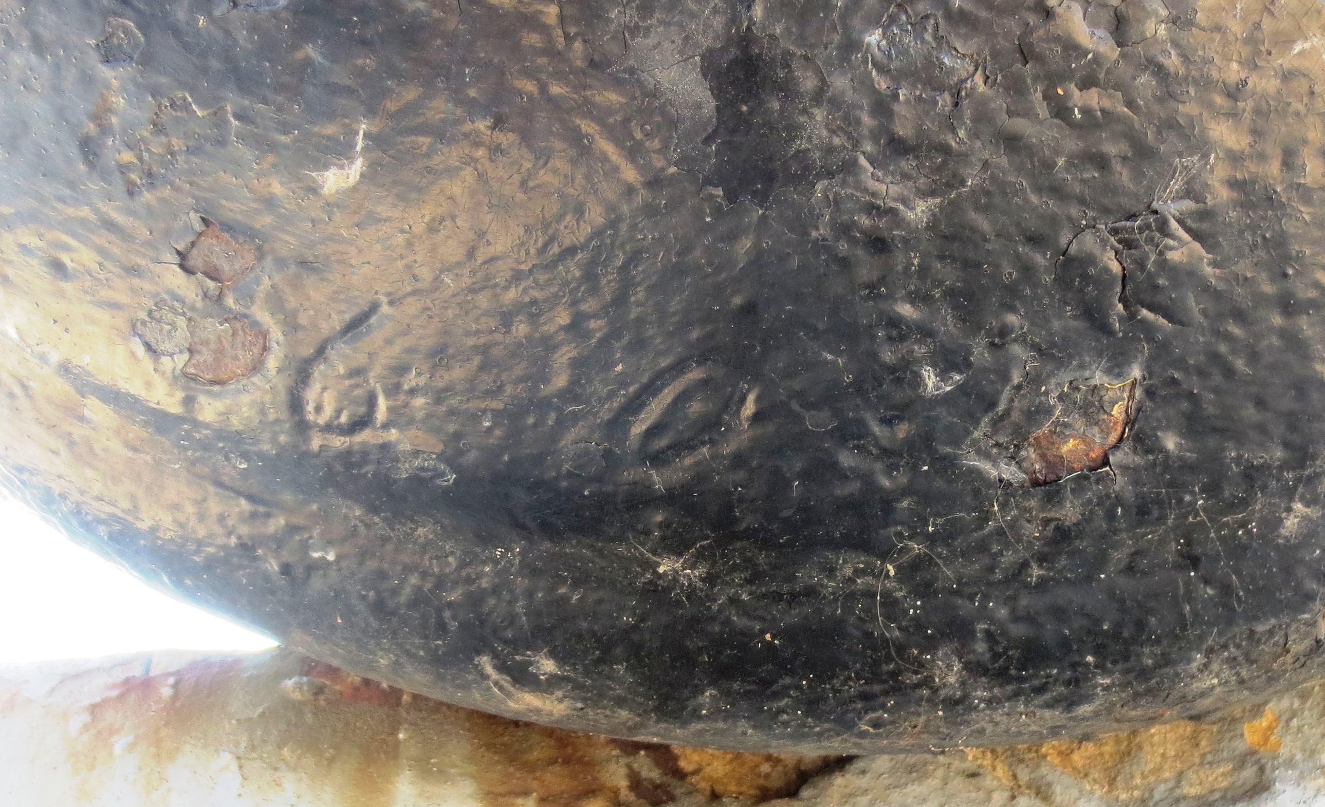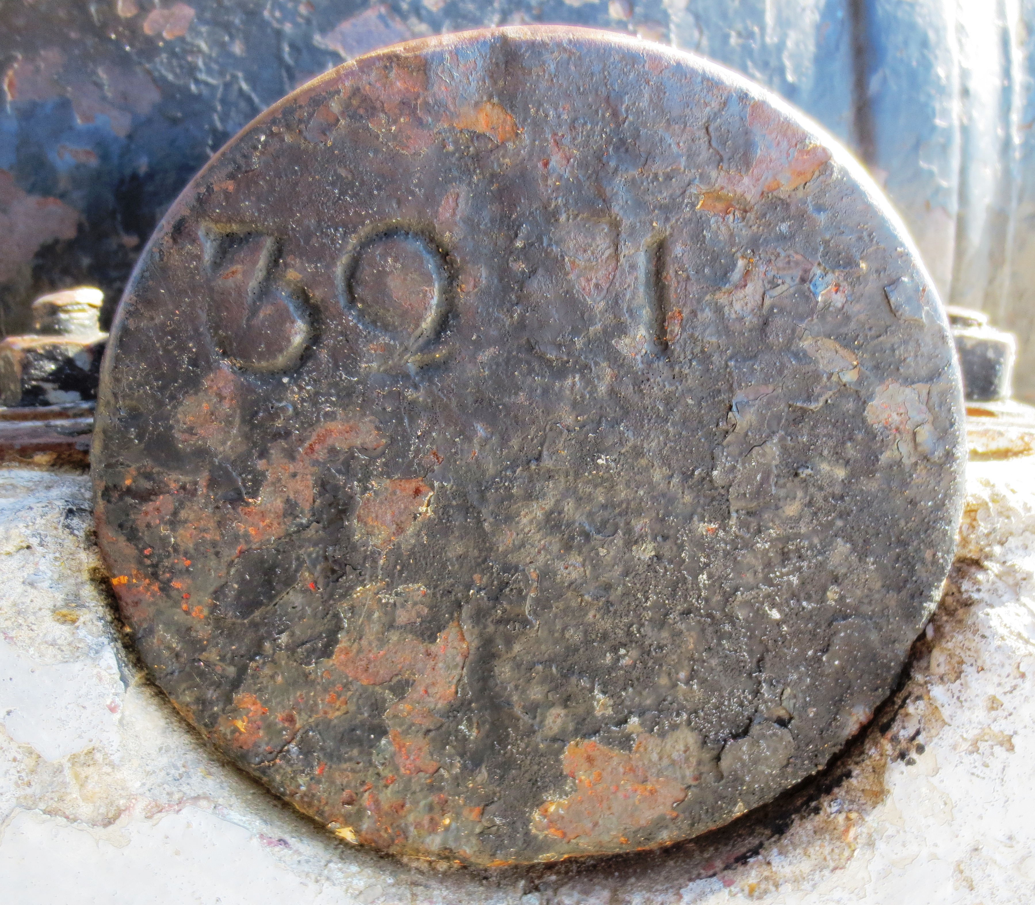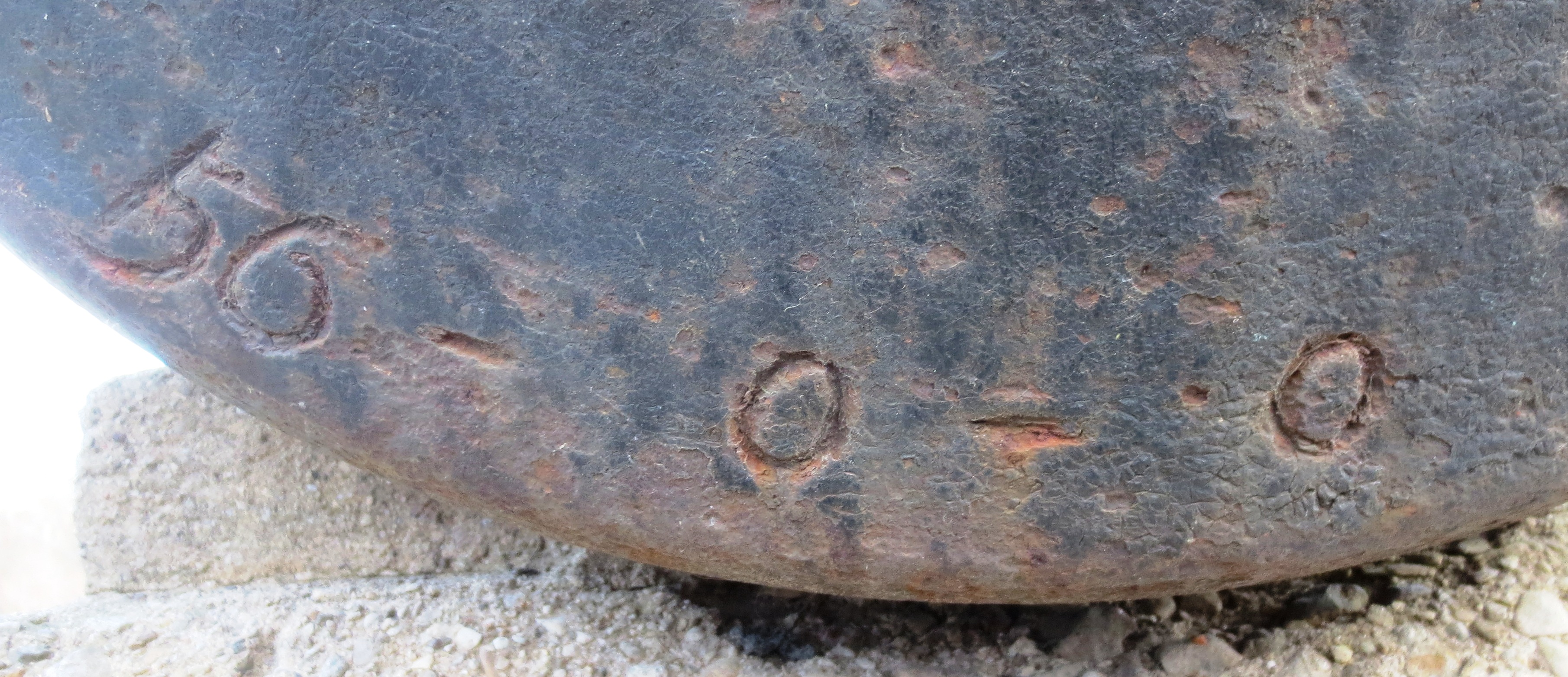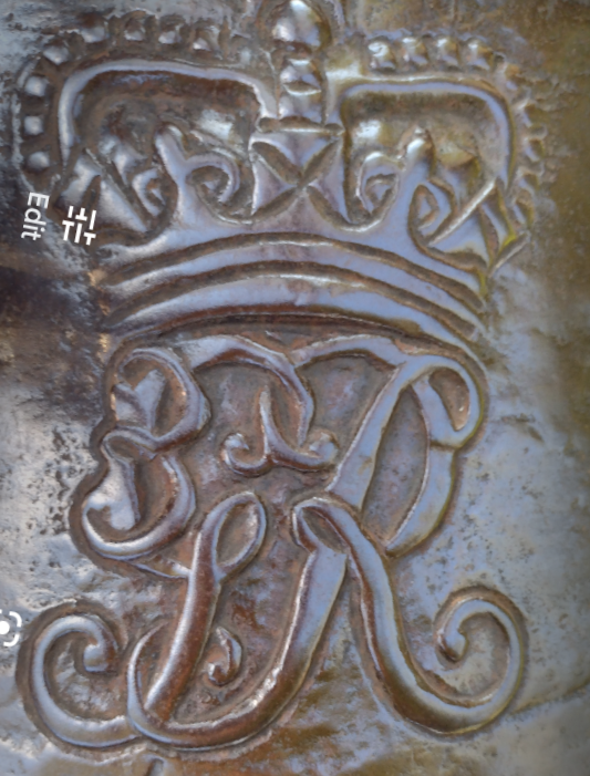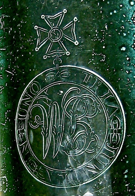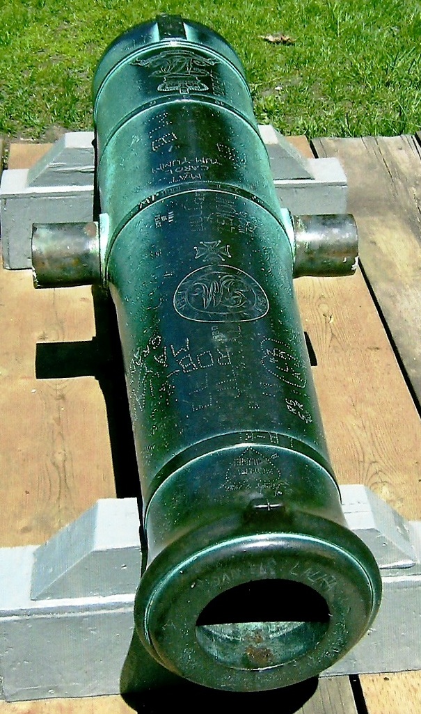 Guns marked wit the Crowned P:   After Wheatley and Company were given permission to proof guns for the East India ships, the Board of Ordnance decided on 3 November 1749, that all guns “which pass the King’s proof for the future, and for the Merchants’ Service, be marked with a Crown and the letter P” (WO 47/34, 422v).  In the next few years increasing numbers of East India Company guns were proofed and in 1755 the Company insisted that all guns for its use had to be proofed at Woolwich.  Robert Davidson at Woolwich was paid for cutting crowned Ps for India ships on guns.  This mark was also used for guns of a semi-official nature, such as those cast by John Fuller for the Sardinian government.  It was used for the civilian branch of the government, such as for troop ships, armed transports and post office packets.  Theform of crowned P on guns like this one suggests an 18th century date, possibly something for a transport in the Seven Years War or American Wars.  This type of gun vanishes with the introduction of the carronade.