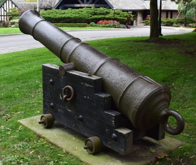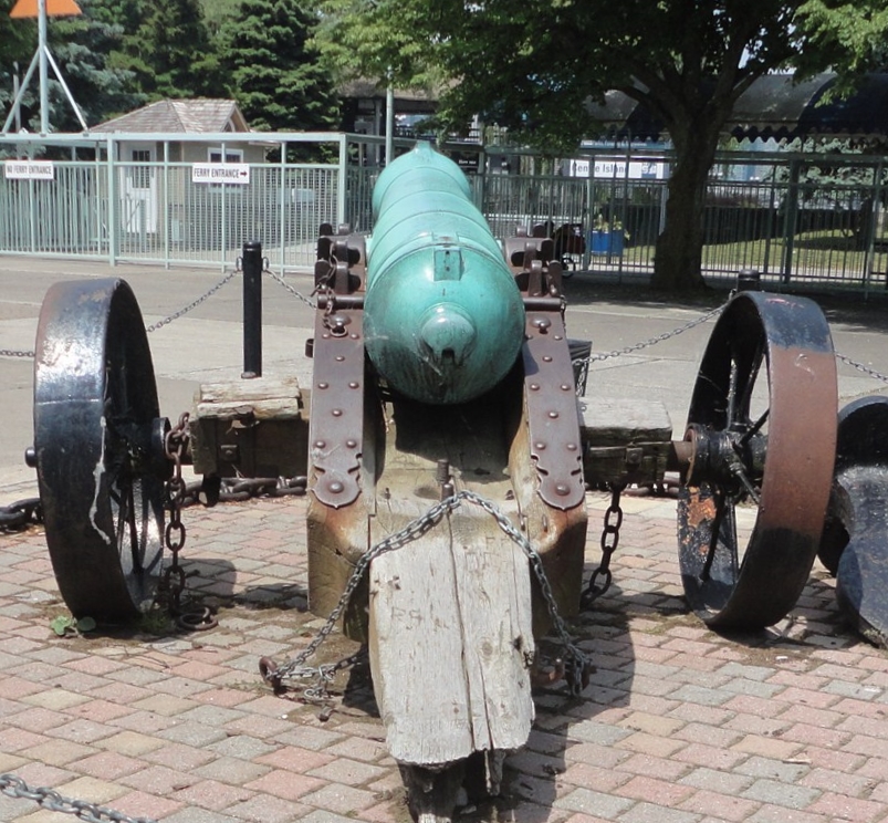 Bronze 24-pounder 13-cwt SBML Howitzer, mounted on a wood carriage with iron wheels at the ferry landing site on Island Park.  Queen Victoria cypher and the cypher of Baron Richard Hussey Vivian Master General of the Board of Ordnance from 1835-1841, on the barrel.  According to the report to parliament in 1878, there were eleven 24-pounder howitzers in Canada, including three in the Toronto area. This is the only one presently known.