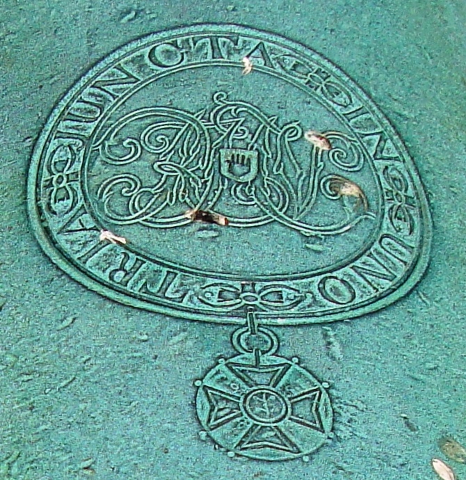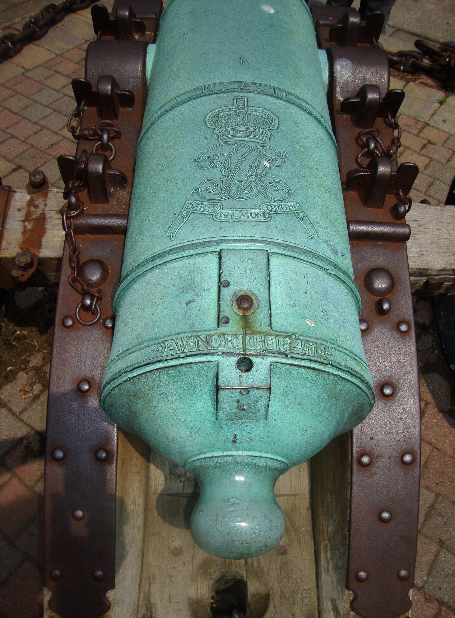 Bronze 24-pounder 12-cwt Smoothbore Muzzleloading Gun, weight 12-3-6 (1 ,434 lbs), W. North, 1843, Queen Victoria cypher, GM monogram in a garter suspending a Maltese cross, the garter is engraved TRIA JUNCTA IN UNO on the chase, button broken off, mounted on wood rails in front of Colborne Lodge, High Park.