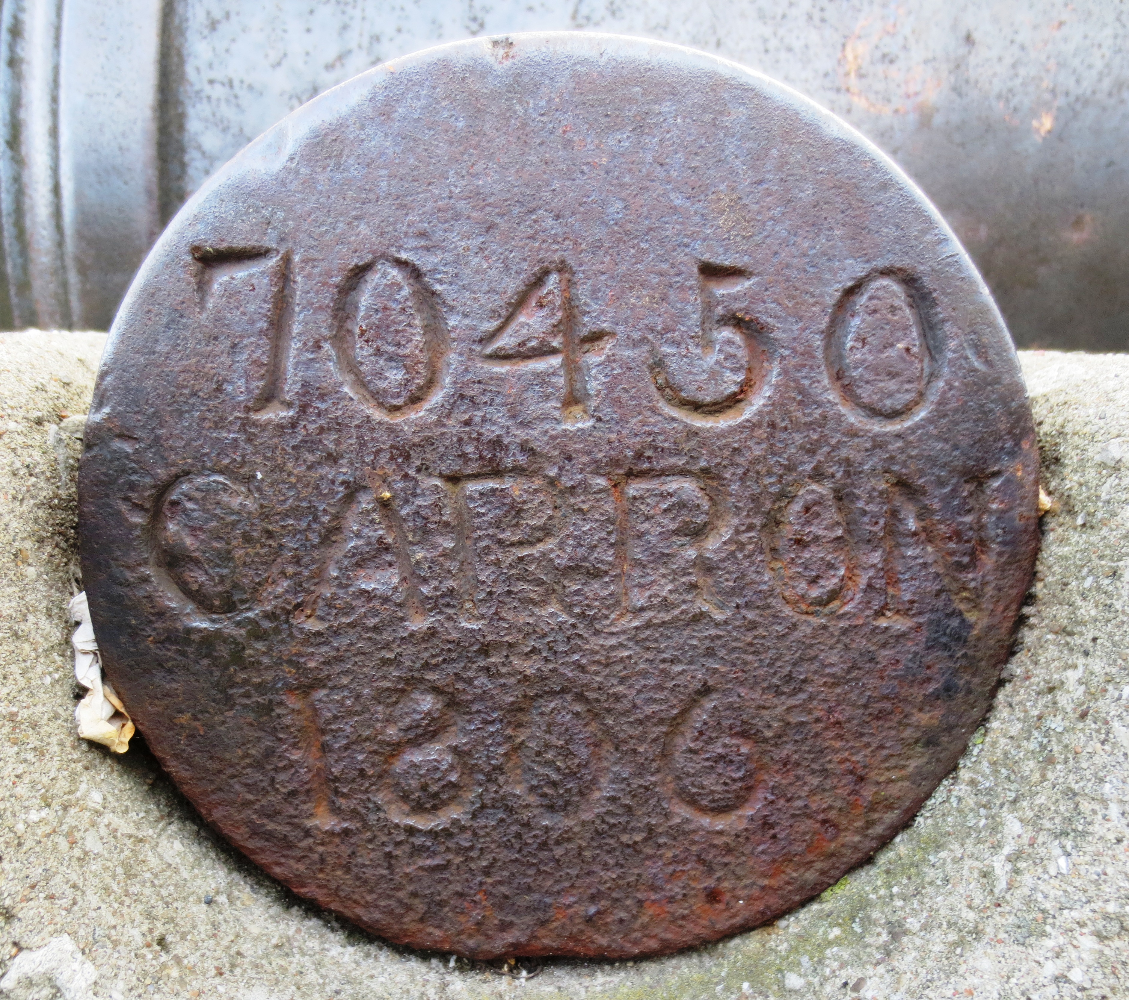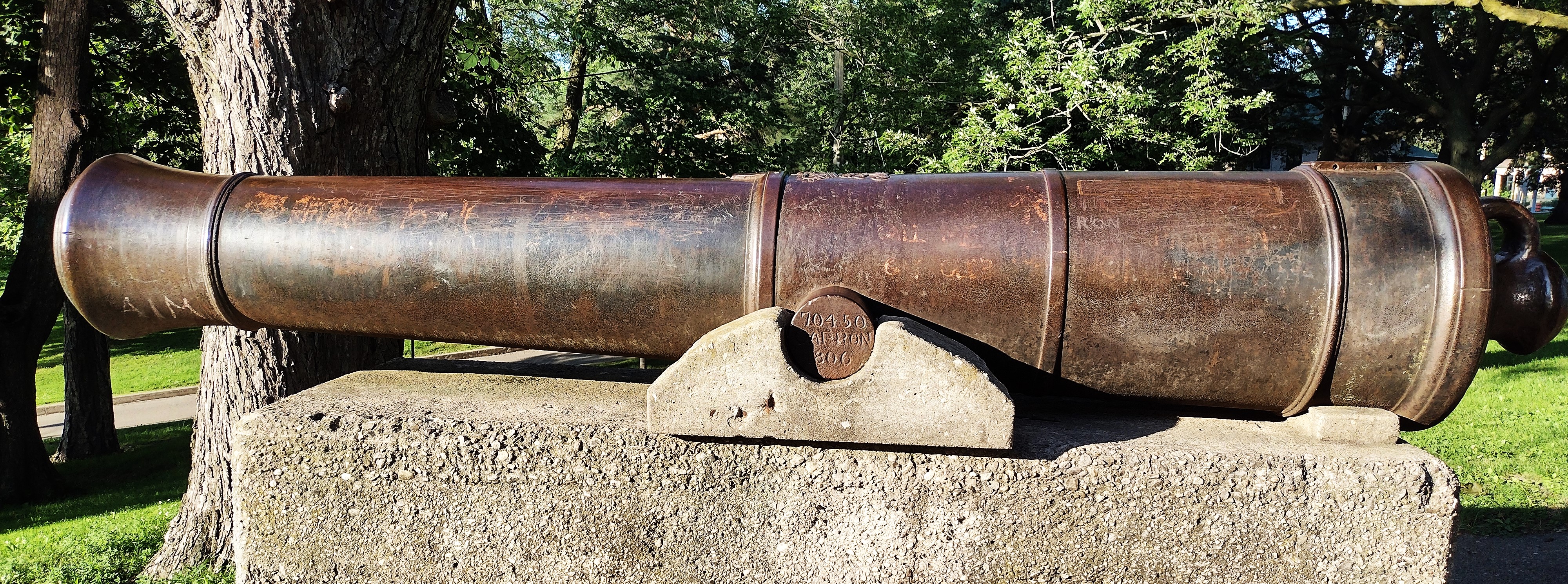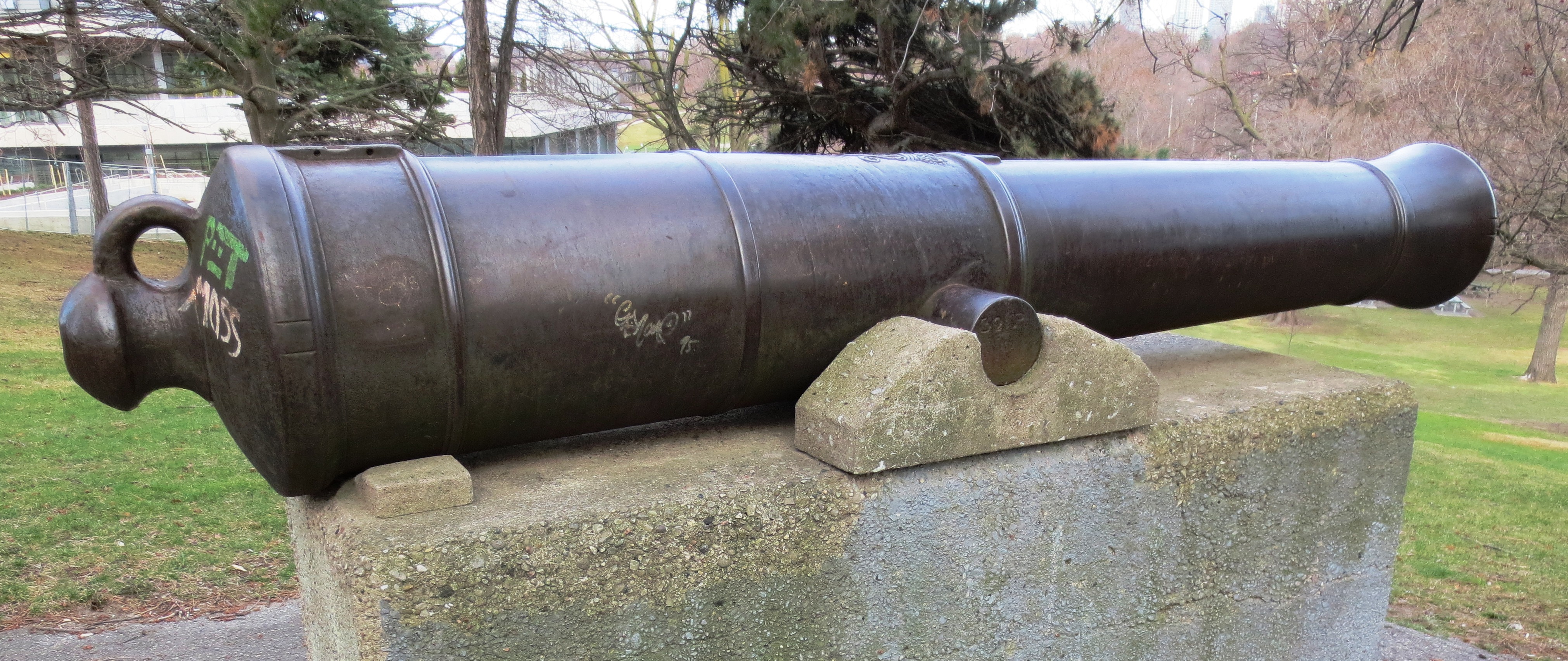 Blomefield Cast Iron 32-pounder 56-cwt Smoothbore Muzzleloading Gun, weight 56-0-0 (6,272 lbs) under the cascabel, The Carron Company of Falkirk, Scotland (Serial No. 70450, CARRON, 1806) on left trunnion, (32P) on right trunnion, King George III cypher, broad arrow mark, mounted on a concrete stand.  Riverdale Park East.