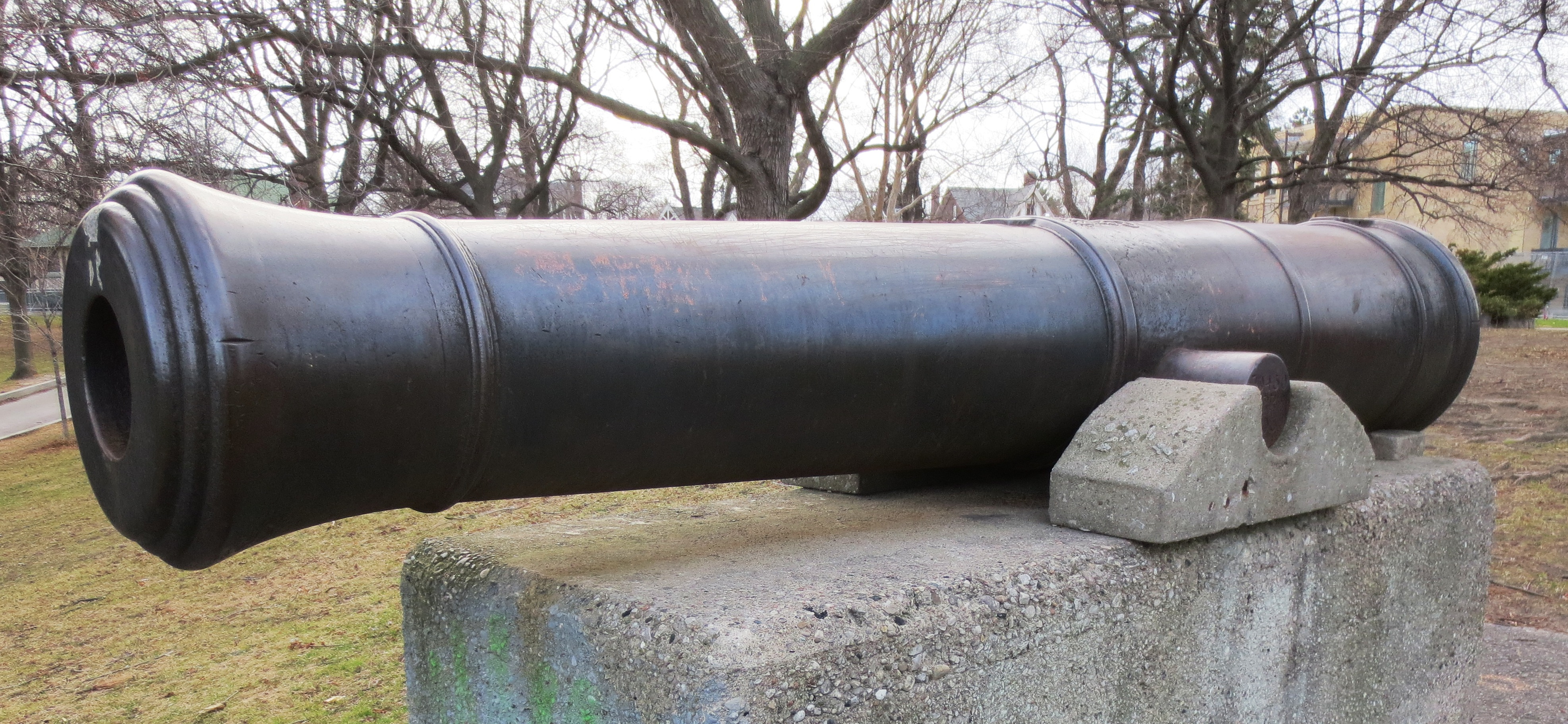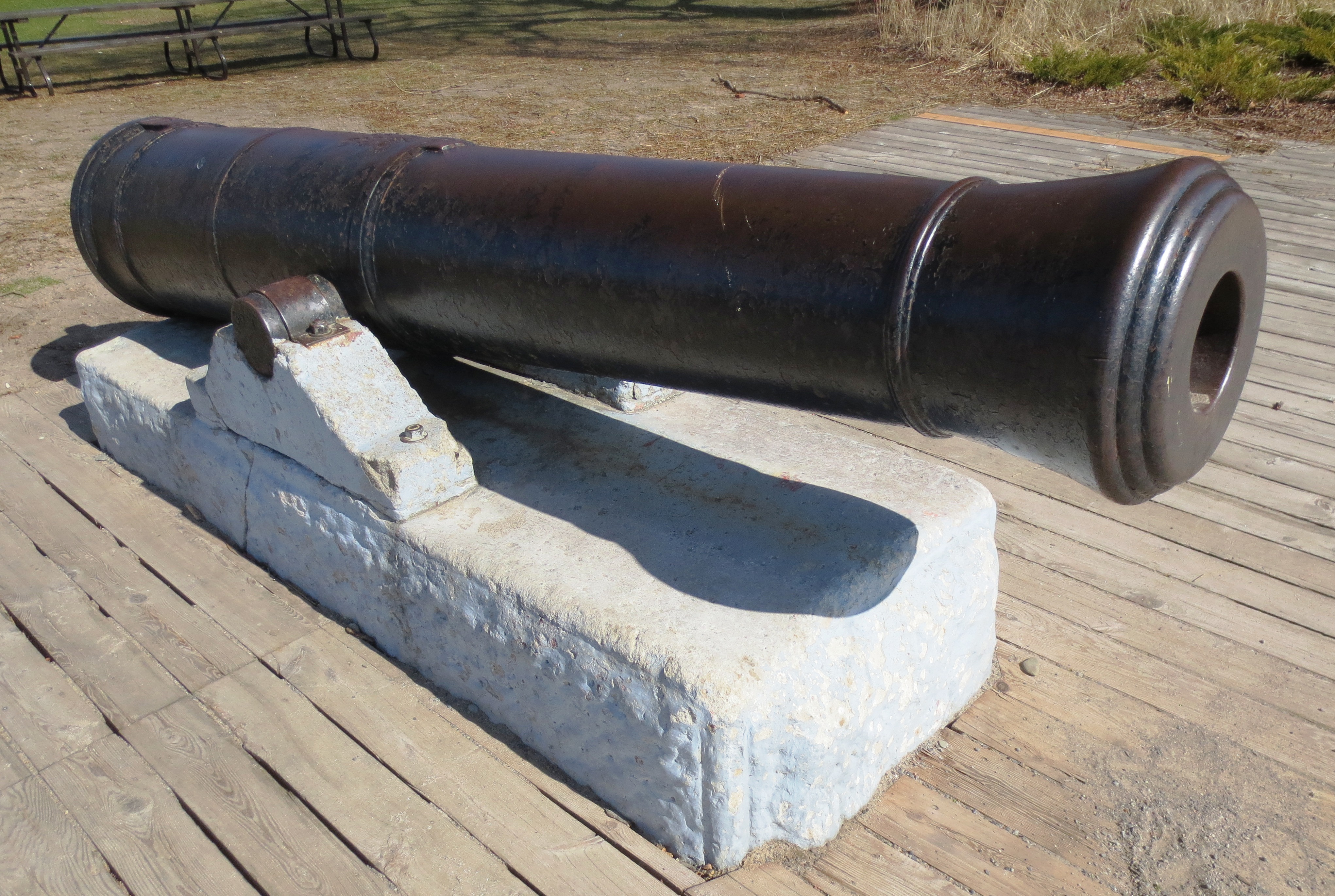 Blomefield Cast Iron 32-pounder 56-cwt Smoothbore Muzzleloading Gun, weight 56-0-27 (6,299 lbs) under the cascabel, (Serial No. 03660, CARRON, 1803) Carron of Falkirk, Scotland, on the left trunnion, (32P) on the right trunnion, No. 43 on the astragal ahead of the trunnions, King George III cypher, broad arrow mark, located on the waterfront of Marie Curtis Park.