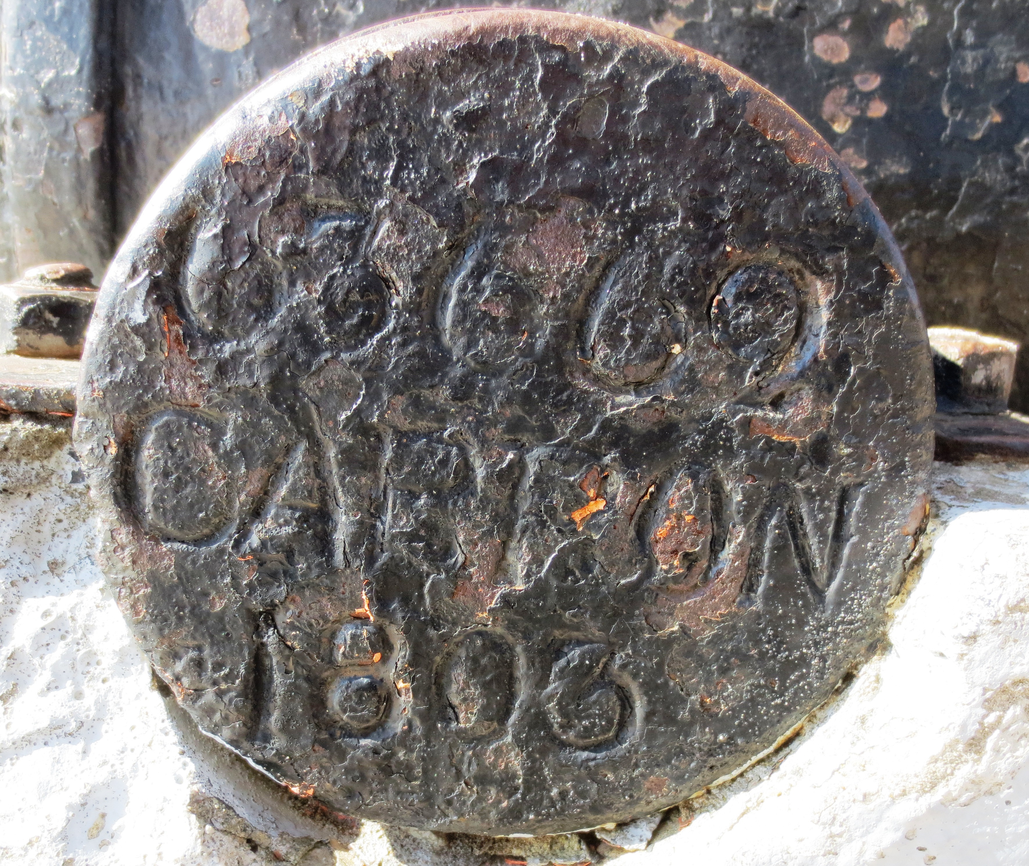 Cast Iron 6-pounder Smoothbore Muzzleloading Gun, weight 23-1-8 (2,612 lbs), crown over P, carriage disintegrating. Old Mill.