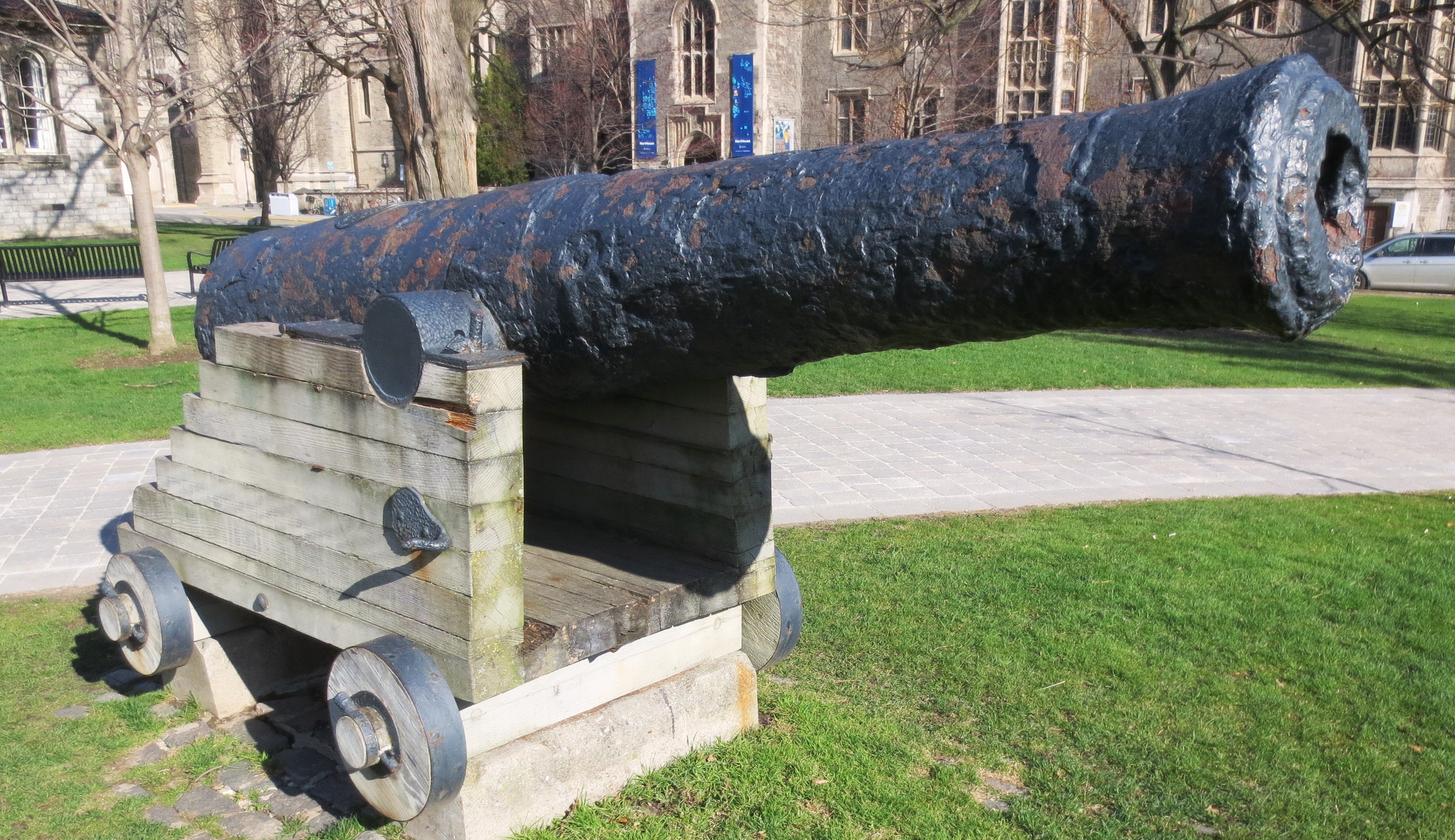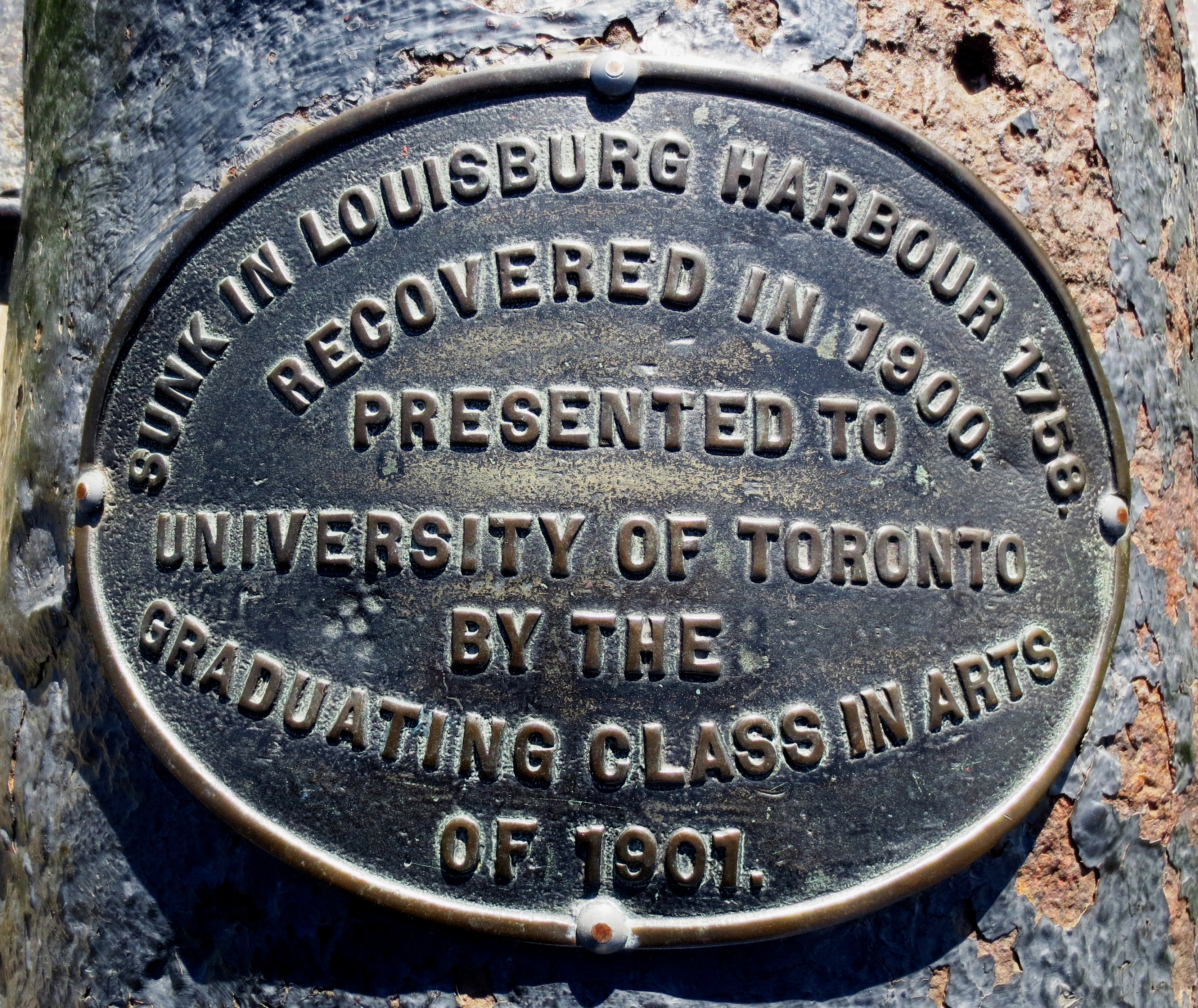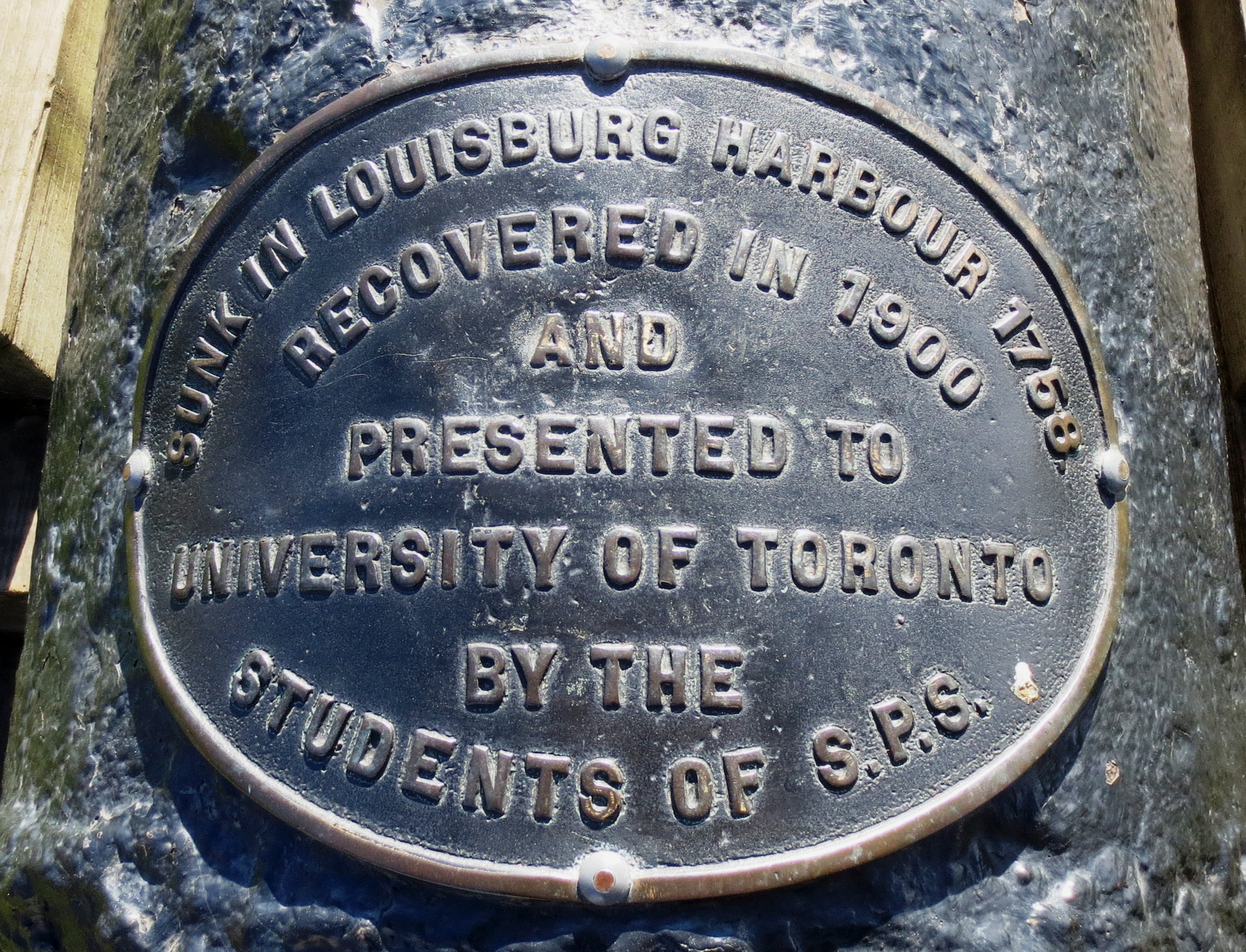 Cast Iron 32-pounder smoothbore muzzleloading cannon, mounted on a wood gun carriage. This cannon was recovered from Louisbourg Harbour, Nova Scotia. It is No. 1 of 2 on the grounds of the University of Toronto, King’s College Circle.