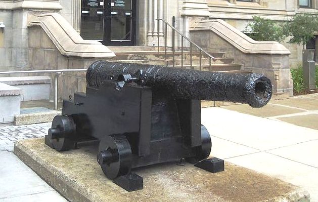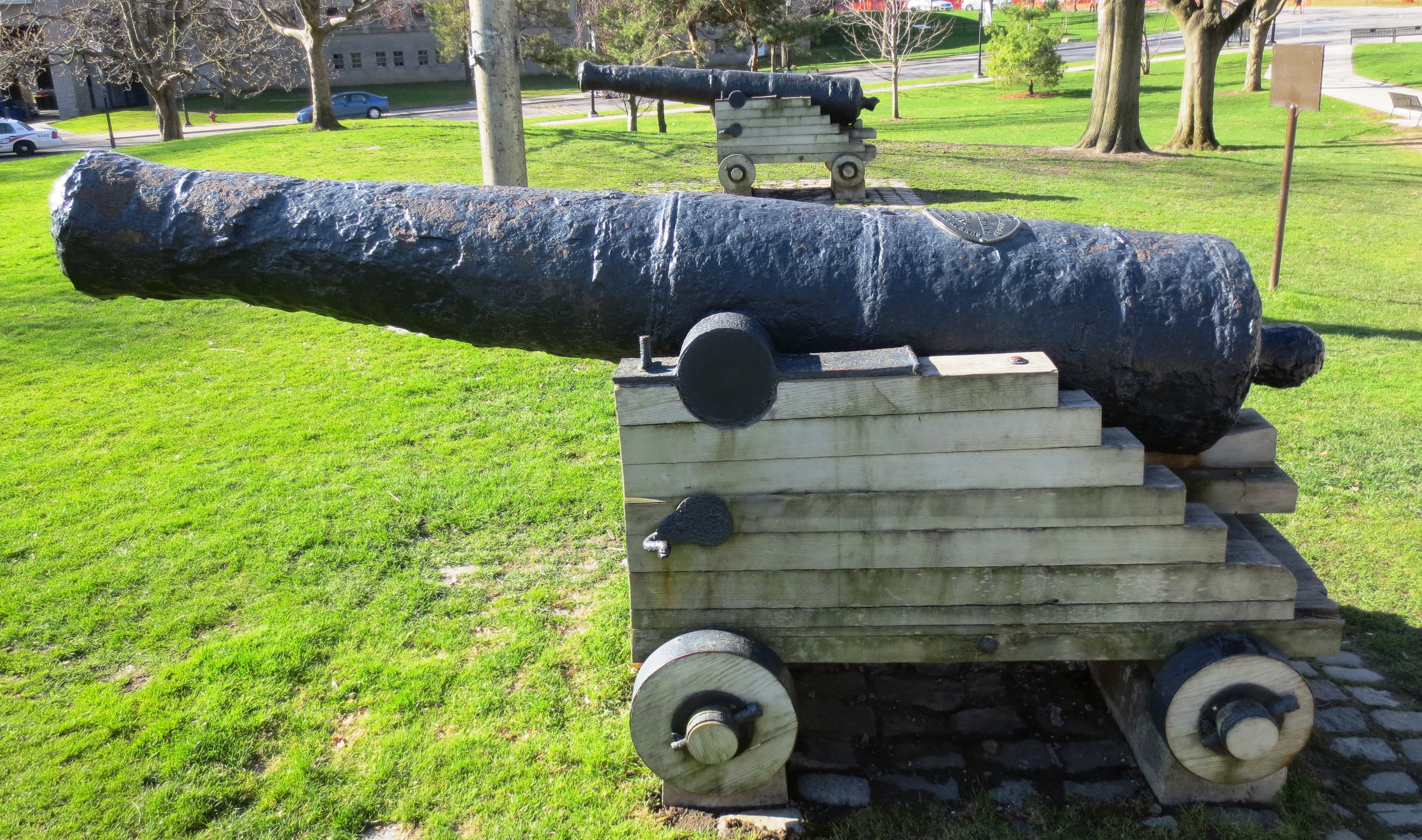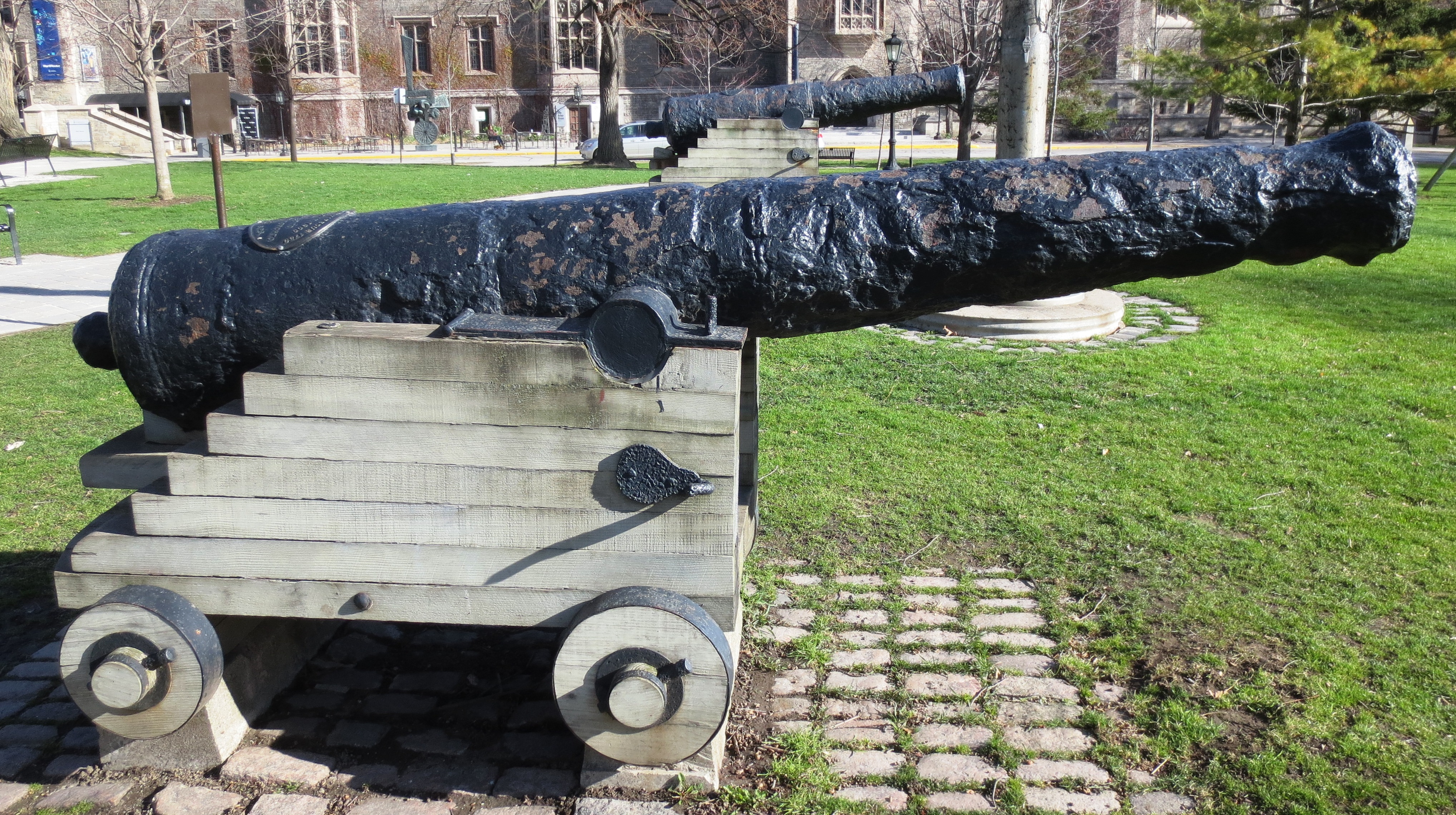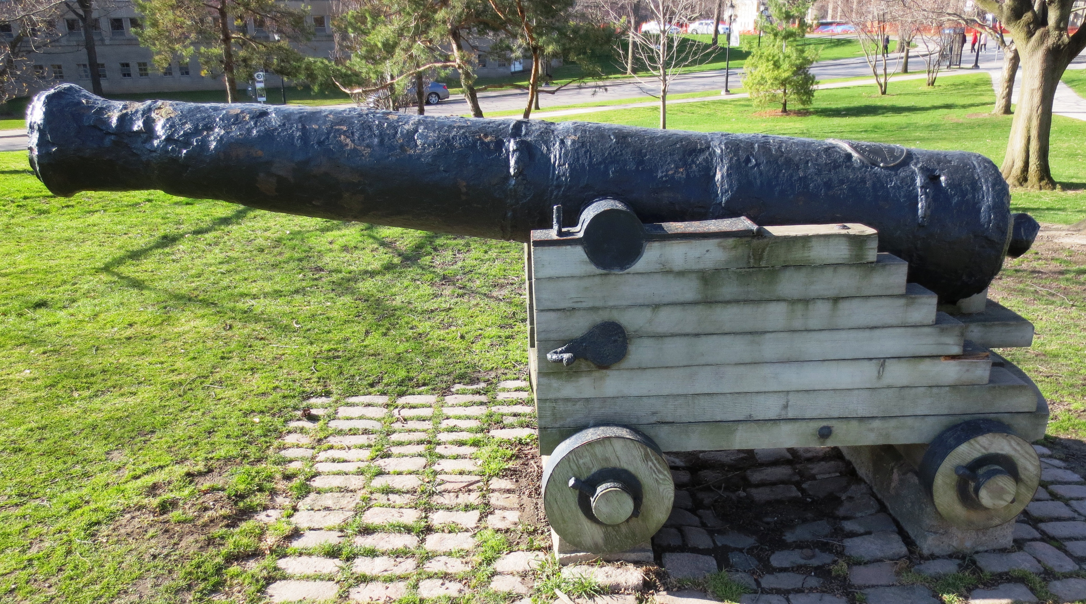 Cast Iron 32-pounder smoothbore muzzleloading cannon, mounted on a wood gun carriage. This cannon was recovered from Louisbourg Harbour, Nova Scotia. It is No. 1 of 2 on the grounds of the University of Toronto, King’s College Circle.