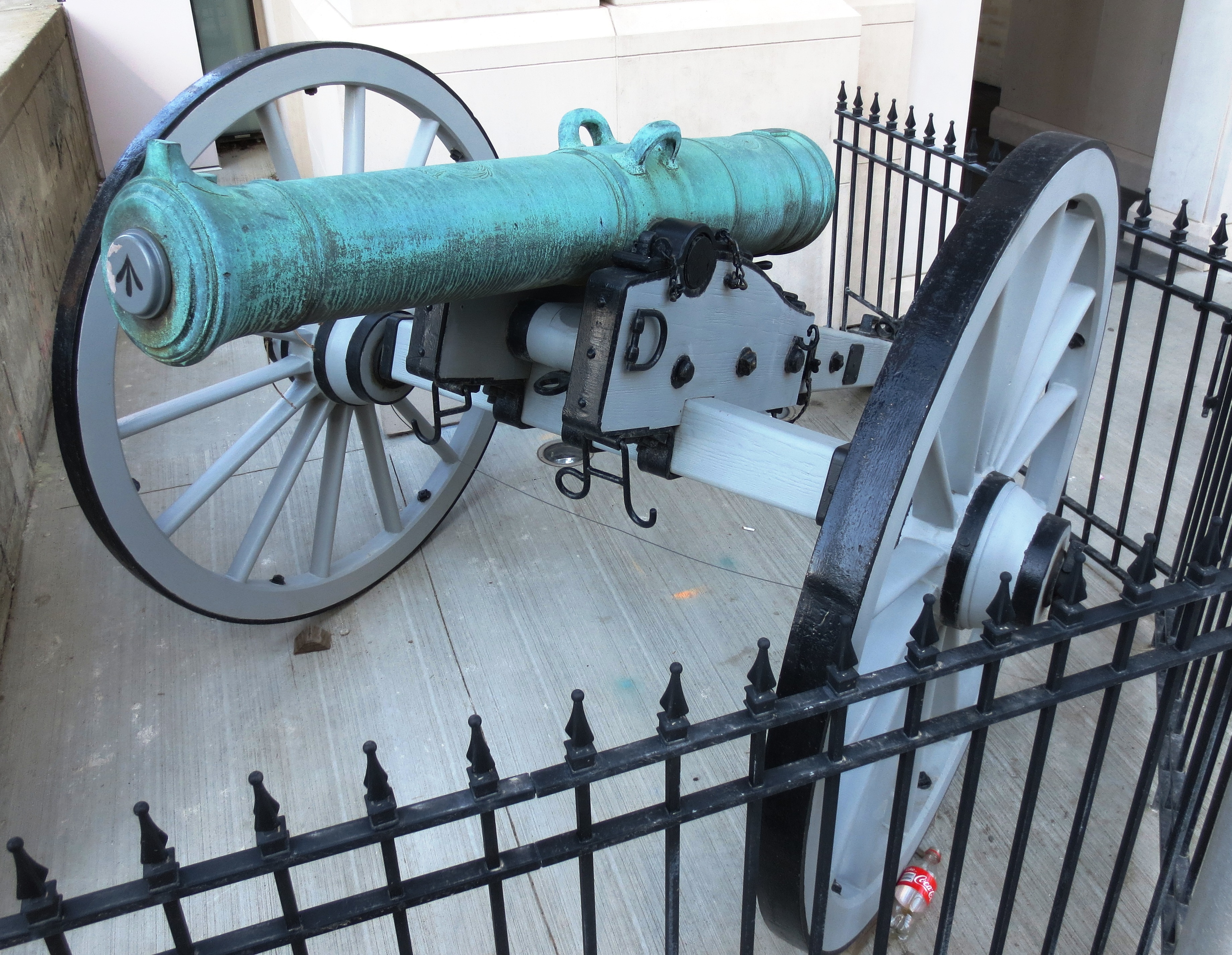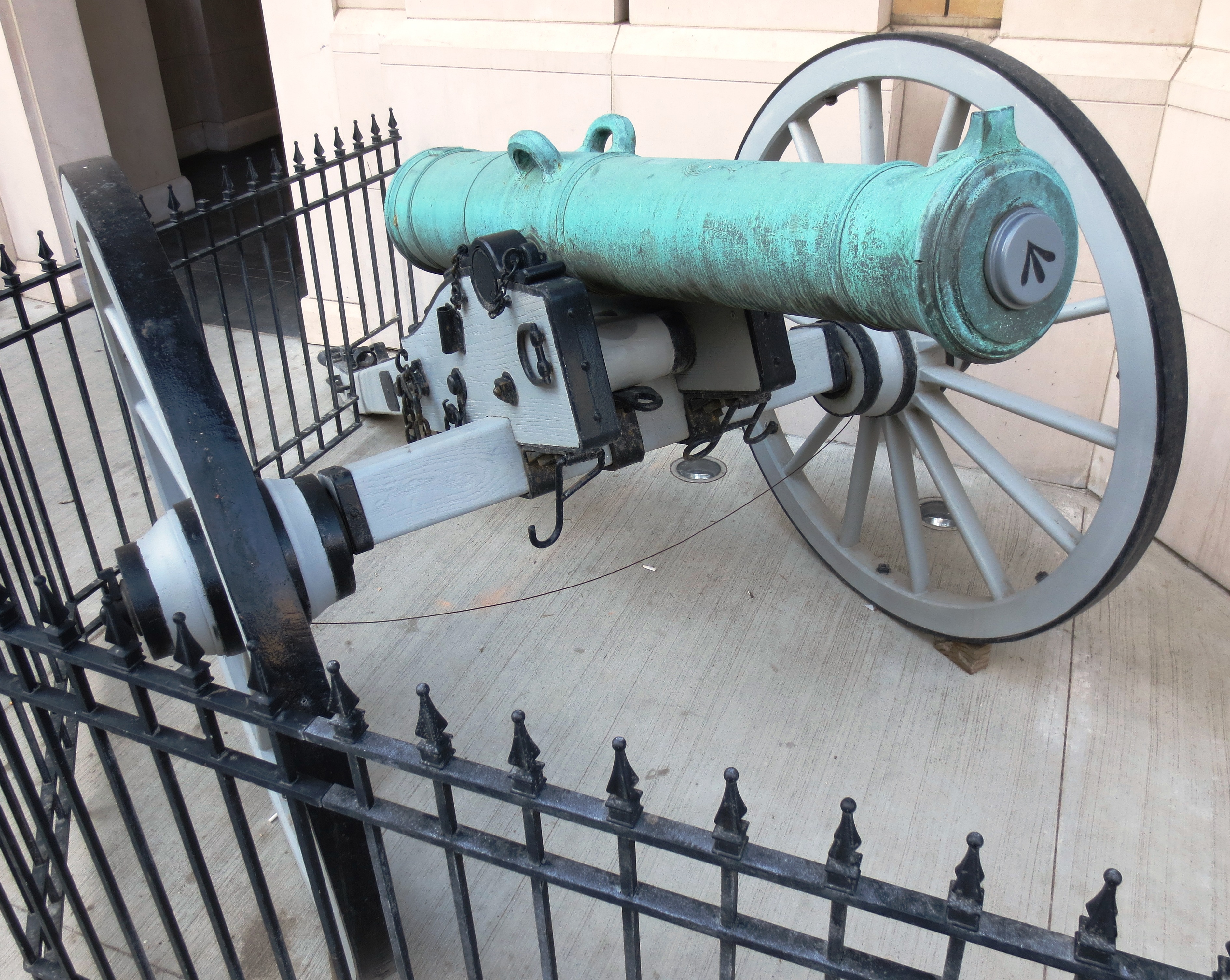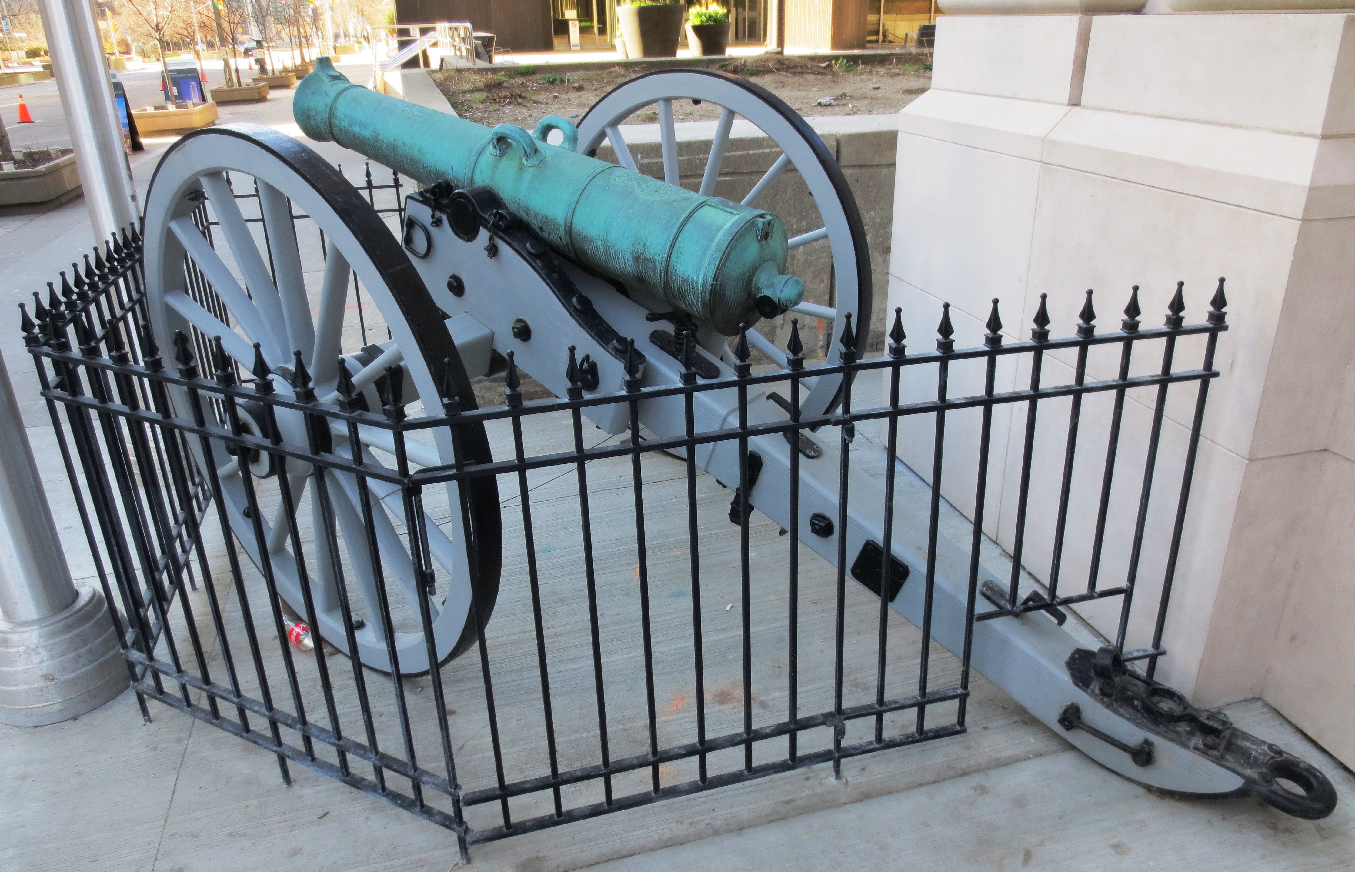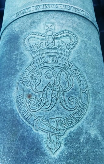 Bronze 9-pounder 13-1/2-cwt Smoothbore Muzzleloading Gun, weight 13-3-6 (1,546 lbs) under the cascabel, C.H. King, 1813-1815, King George III cypher, mounted on an iron wheeled wood gun carriage. Royal Canadian Military Institute, 426 University Ave.