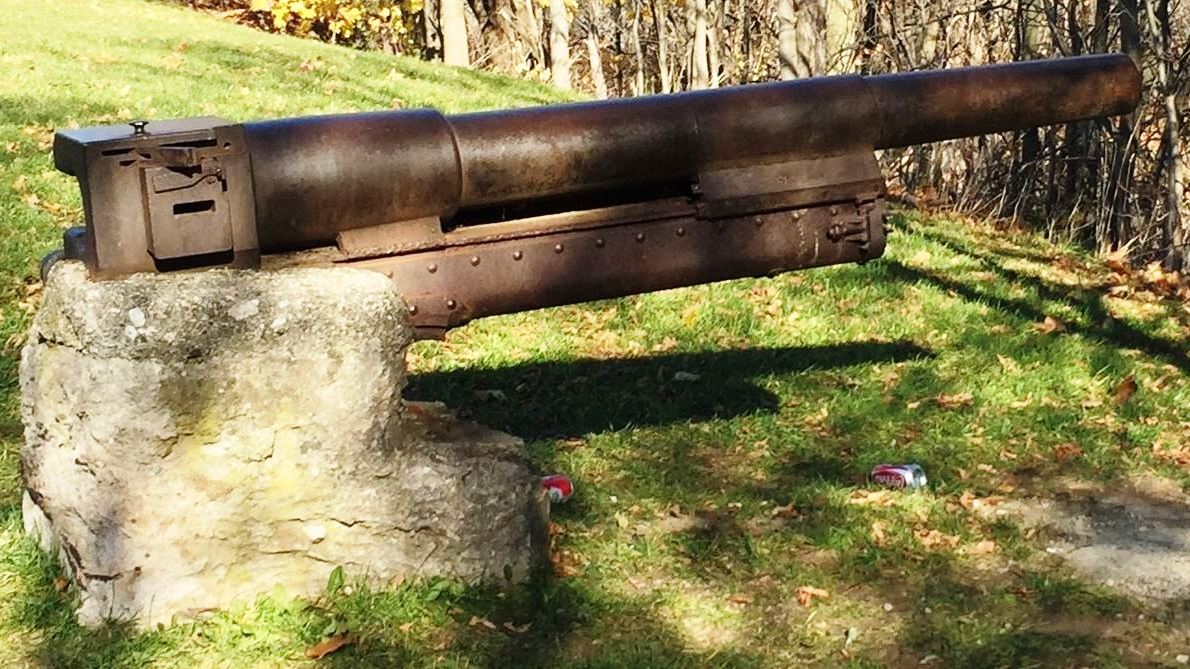 9-pounder 8-cwt Muzzleloading Rifle, weight >900 lbs, Reg. No. unknown, this type of gun was used in the NW Rebellion, 1885.   Sir John Johnson House.