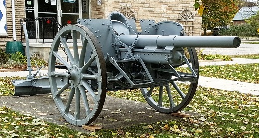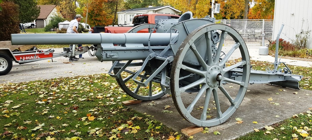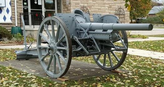 German First World War 7.7-cm Feldkanone 16 (7.7-cm FK 16), (Serial Nr. 12602), 1917, in front of the Royal Canadian Legion Branch No. 180, at 183 Victoria Street W.  This gun was captured  by the 10th Canadian Infantry Battalion, Canadian Expeditionary Force, during  the Battle of Drocourt-Queant on 2 August 1918.  It was given to the town of  Wingham as part of the post-First World War trophy redistribution  program.