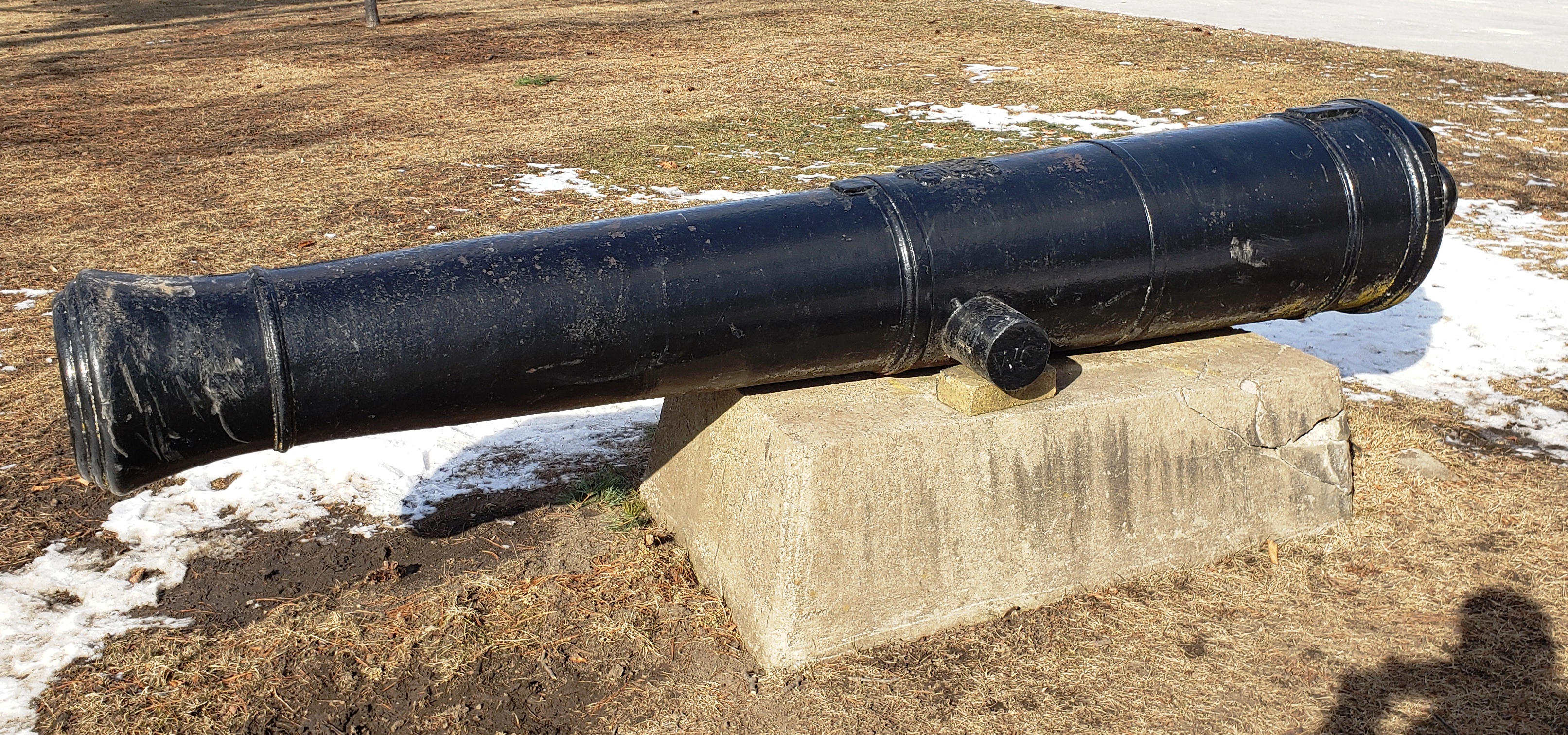 Russian Cast Iron 24-pounder 50-cwt Smoothbore Muzzleloading Gun, forged by Armstrong at Alexandrovski, with double-headed Eagle, Crimean War trophy with trunnions intact, mounted on a concrete stand in Assumption Park, on the riverfront.
