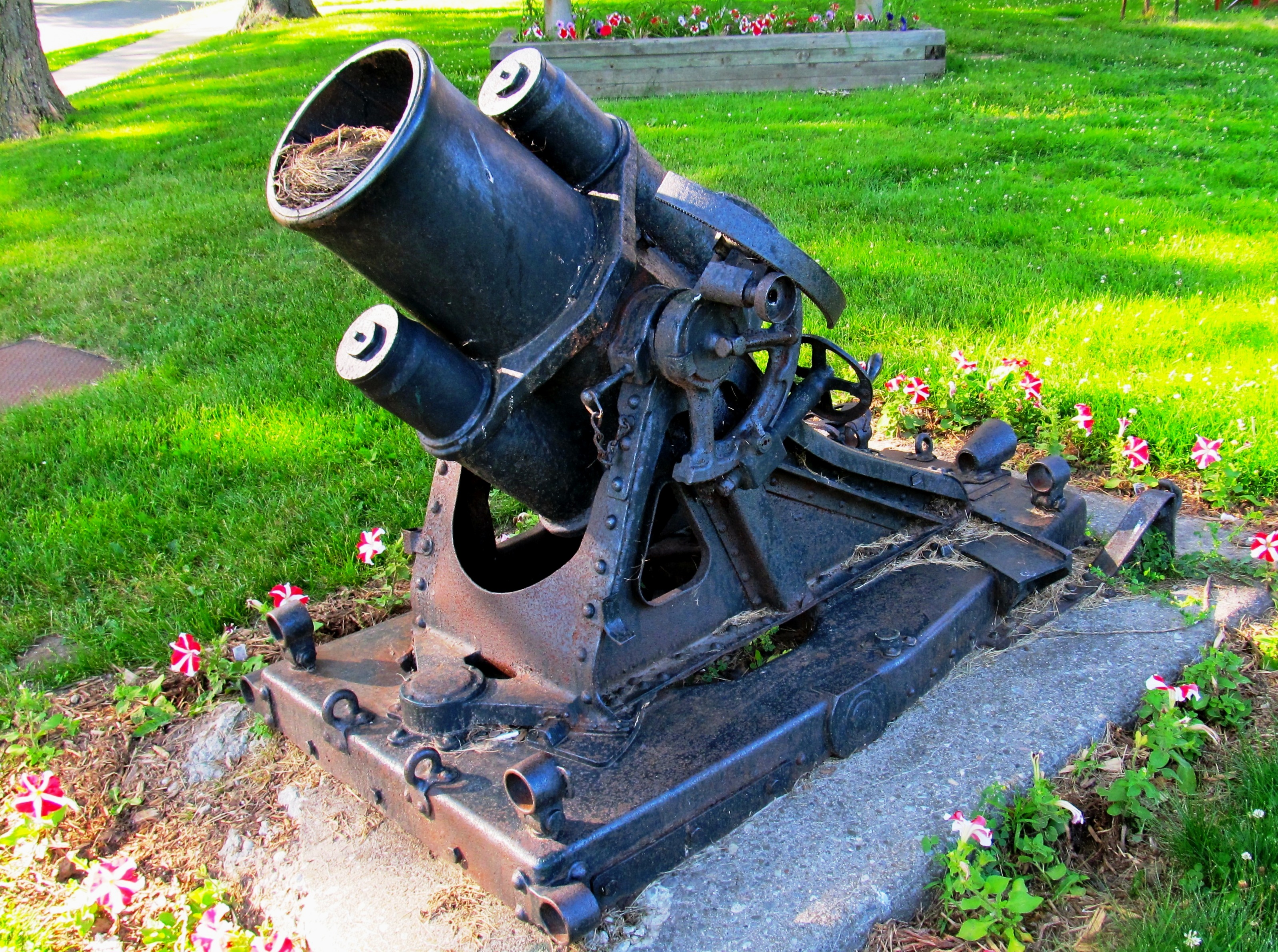 German First World War 25-cm schwerer Minenwerfer alt Art 25-cm sMW), (Serial Nr. 1930), TBC, captured by 9th Field Company, Canadian Engineers at Vimy Ridge, 9 April 1917.  This mortar stands beside a monument in front of High School.
