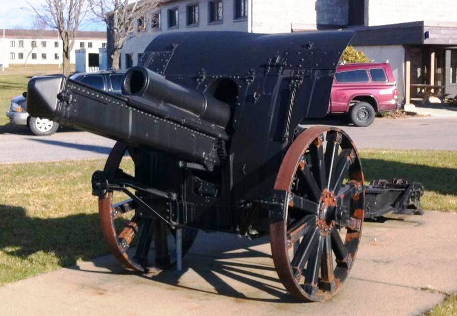 German First World War 15-cm schwere Feldhaubitze 13 (15-cm sFH 13), (Serial Nr. 1098), 1916, 788 M.V. This gun was captured on 27 Aug 1918 by the Royal 22nd Regiment, 5th Infantry Brigade, 2nd Canadian Division, Canadian Expeditionary Force (CEF), near Cherisy, France. This gun is on display beside the Garrison Officer’s Mess. The barrel of the gun is in the recoil position.