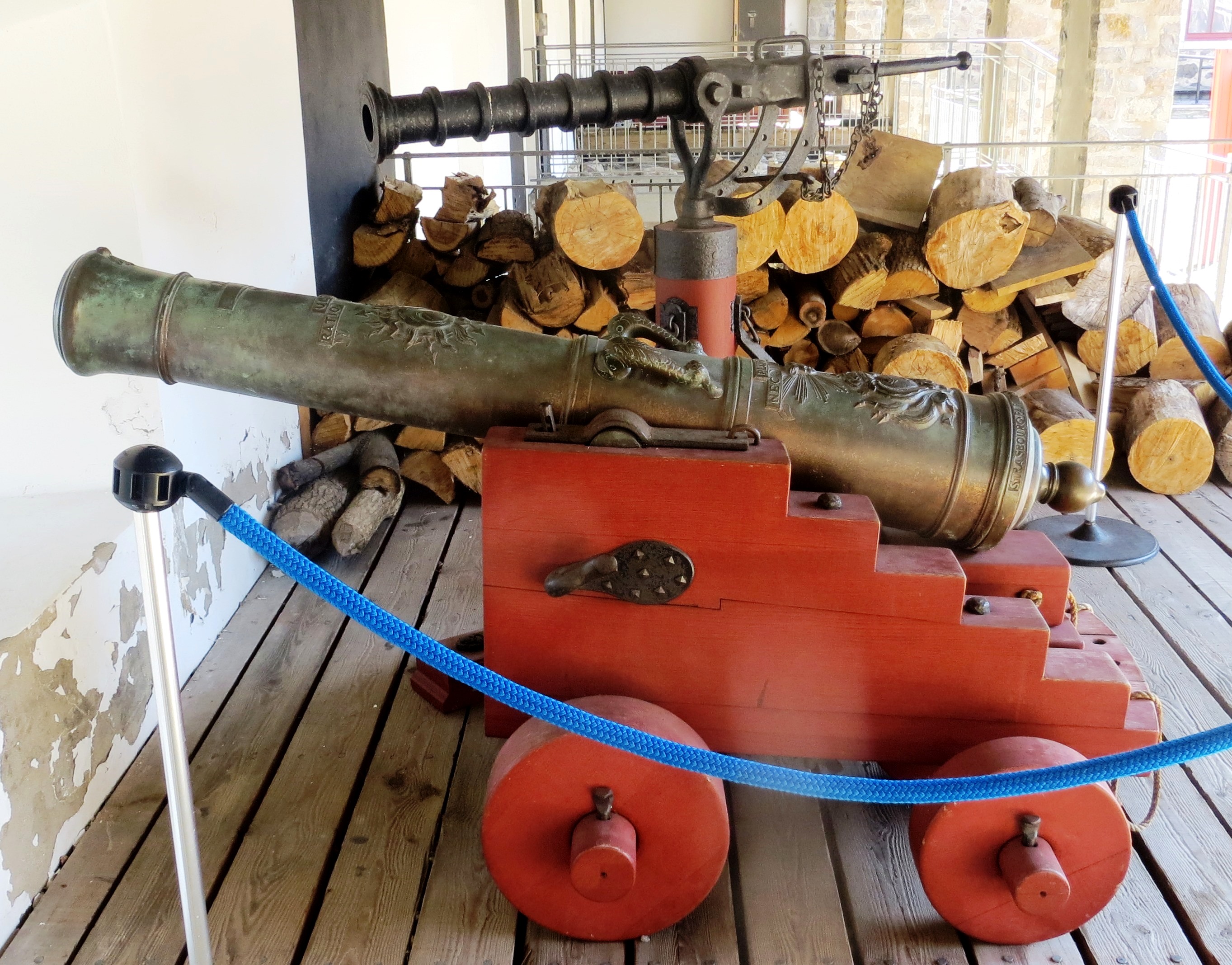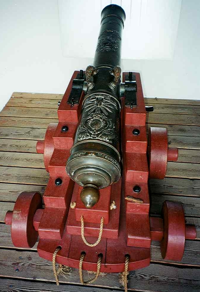 Bronze possibly 3-pounder Smoothbore Muzzleloading Gun, heavily decorated, with dolphin carrying handles mounted on a wood naval gun carriage and set inside a firing embrasure inside the fort.
