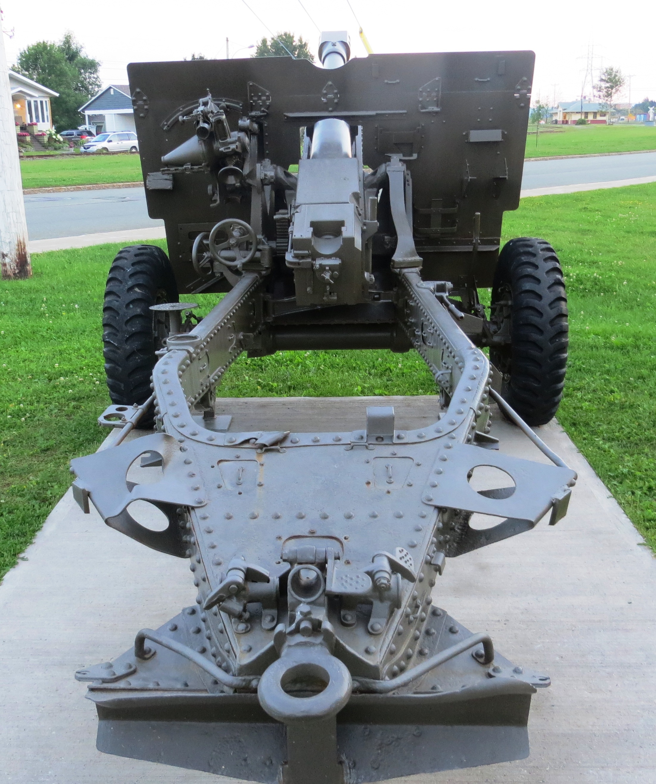 Obusier moyen C1 (M1A2) de 155 mm sur chariot M1A2, alias M114, fabriqué chez Sorel Industries Limited au Québec, chiffre Queen Elizabeth II CFR 34409. La plaque du chariot indique: CARR. COMMENT. 155MM M1A2 CDN. SOREL INDUSTRIES LTD. CANADA (année inconnue), REG. NON. CDN 181, INSP (symbole). Filiale no 99 de la Légion royale canadienne.