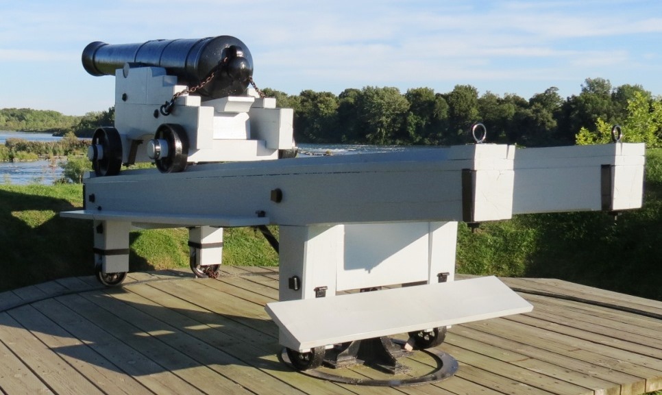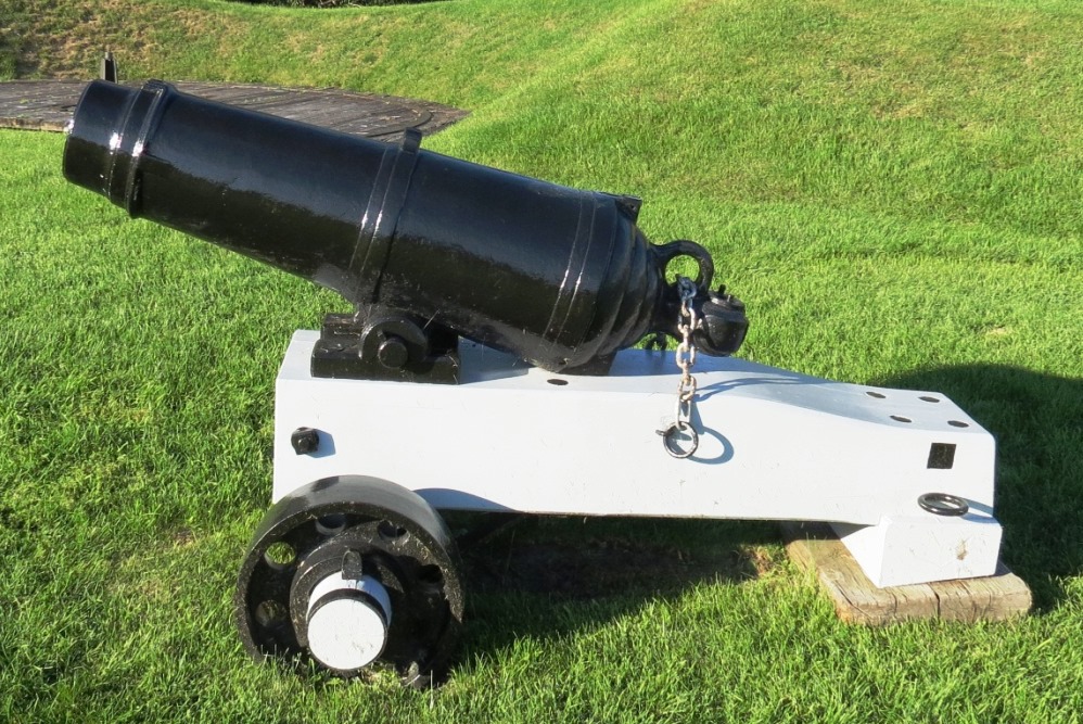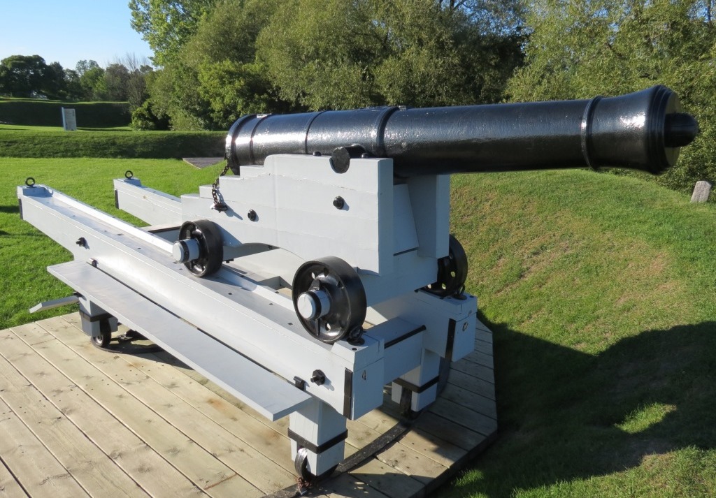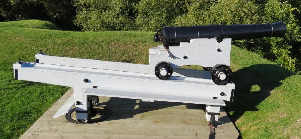 Blomefield Cast Iron 24-pounder Smoothbore Muzzleloading Gun, poids, fabricant et numéro de série inconnus, monté sur un chariot de canon naval en bois, face à l’eau.