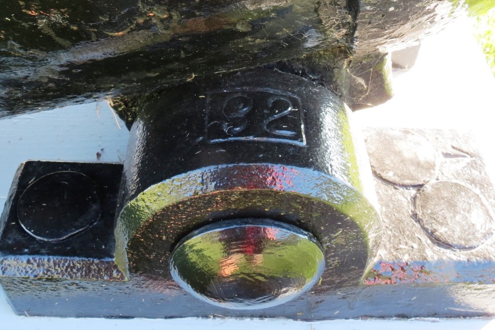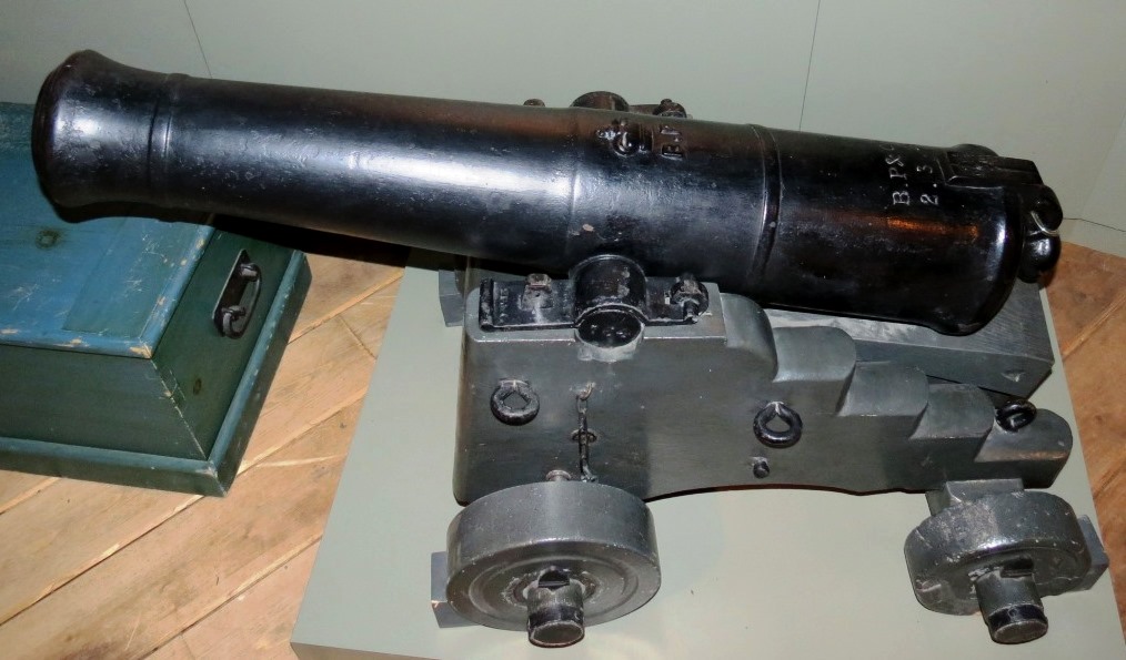 2-pounder smoothbore muzzleloading cannon, weight 2-3-25 (333 lbs), possibly number 764 on left trunion, royal cypher with B.P. & Co., mounted on wood naval gun carriage. No. 4 of 4.
