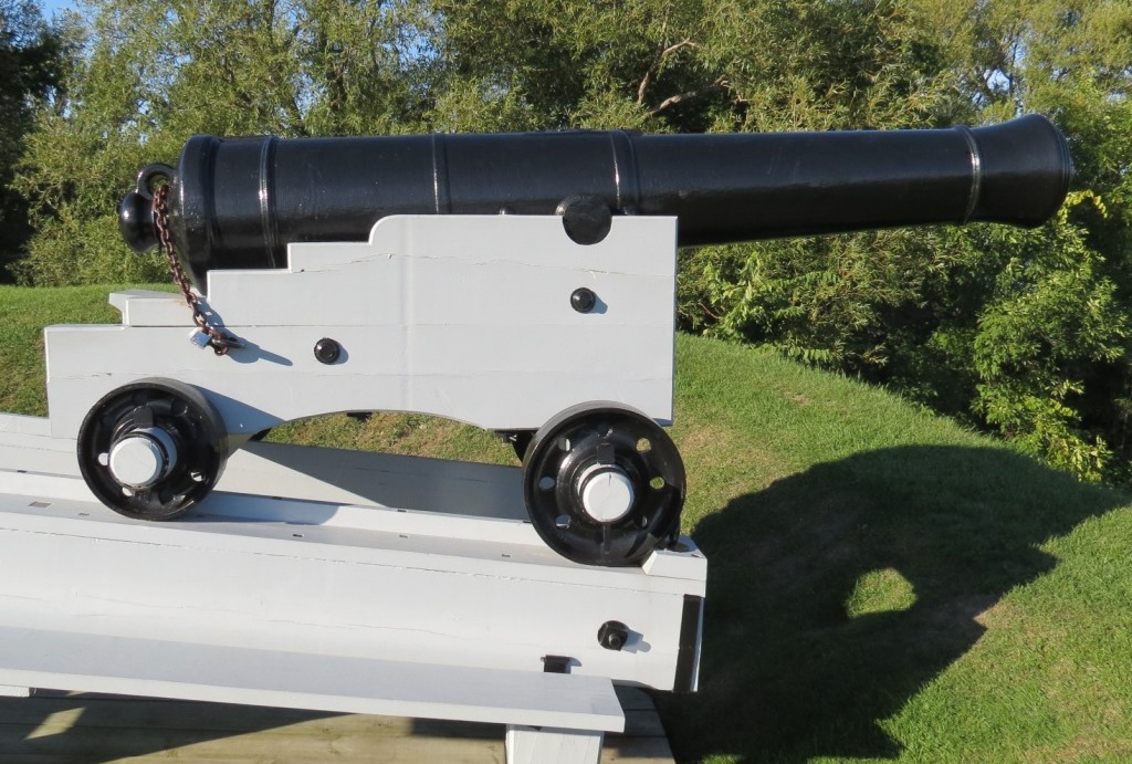 Blomefield Cast Iron 24-pounder Smoothbore Muzzleloading Gun, weight, maker and Serial No. unknown, mounted on a wood naval gun carriage, facing the water. This cannon was recovered from the wreck of the English frigate HMS Penelope.