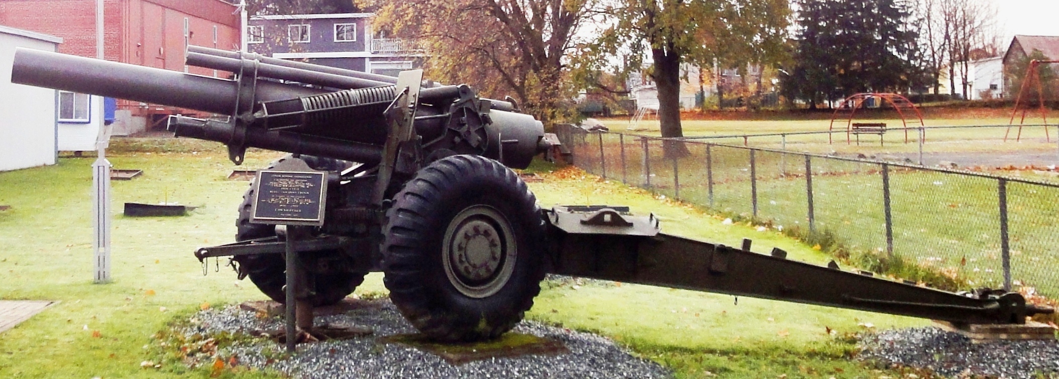 This gun is dedicated in memory of the gunners who served with the 24th and 75th Field Battery RCA and the 2nd Canadian Medium Regiment RCA, and the 27th Field Regiment RCA M, 1936 – 1970, Cowansville.  Plaque dated 11 Nov 2000.   These Gunners served with the 2nd Medium Regiment made up the 1st French Canadian Artillery Unit during the Second World War.