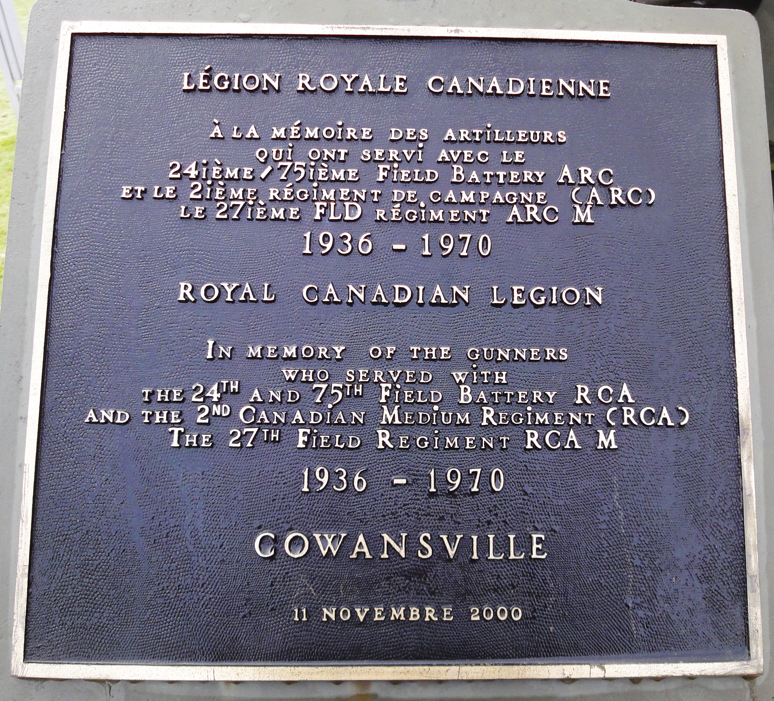 Ce canon est dédié à la mémoire des artilleurs qui ont servi avec la 24e et 75e Batterie de campagne RCA et le 2e Régiment moyen canadien RCA et le 27e Régiment de campagne RCA M, 1936 – 1970, Cowansville. Plaque datée du 11 novembre 2000. Ces artilleurs ont servi dans le 2e régiment moyen de la 1re unité d’artillerie canadienne-française pendant la Seconde Guerre mondiale.