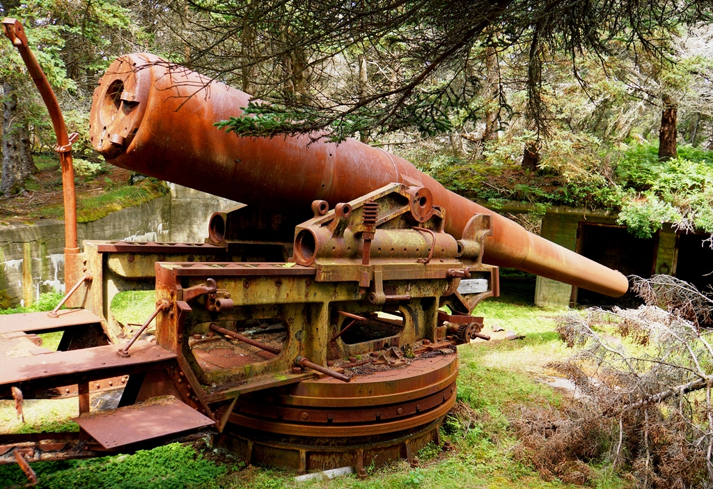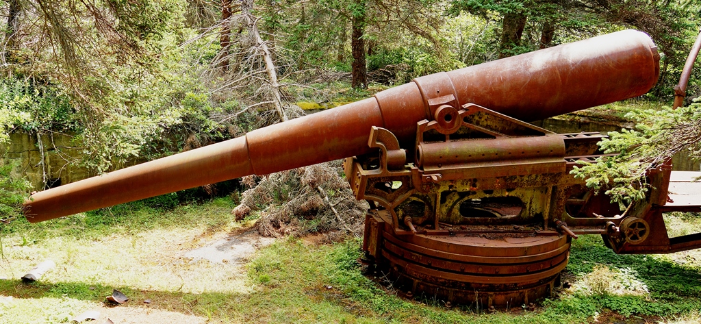 BL 10-inch M1888 Gun, (Serial No. 12 Watervliet), with the barrel mounted on a steel barbette carriage M1893 (Serial No. 11 Watervliet) rotating stand. Dennis Jarvis indicates this gun battery is located near the Cape Roseway Lighthouse on McNutt’s Island. Apparently two American-made BL 10-inch M1888 guns on M1893 barbette carriages were allocated to the site, but only partial remains of (Serial No. 37), carriage (Serial No. 1) may be seen. (A similar gun is preserved at Cape Spear, Newfoundland). The guns had a range of 16 kilometers and were used in Fort Worden, Washington State during the First World War and brought to McNutt’s Island in 1941. The guns were garrisoned by the 104th Coast Artillery Battery. They were part of Fort McNutt because of the threat of German submarine activity. The Port of Shelburne had been designated as an alternate port to Halifax Harbour during the Second World War should Halifax have been rendered unserviceable. The gun in emplacement No. 2 is in fair condition and still on its mount. A total of eight 10-inch American ex-pats were located on the East Coast during the Second World War, including two at Prevel, Quebec, two at Cape Spear and two at Wiseman’s Cove in Newfoundland, and two at Fort McNutt, Shelburne, Nova Scotia.