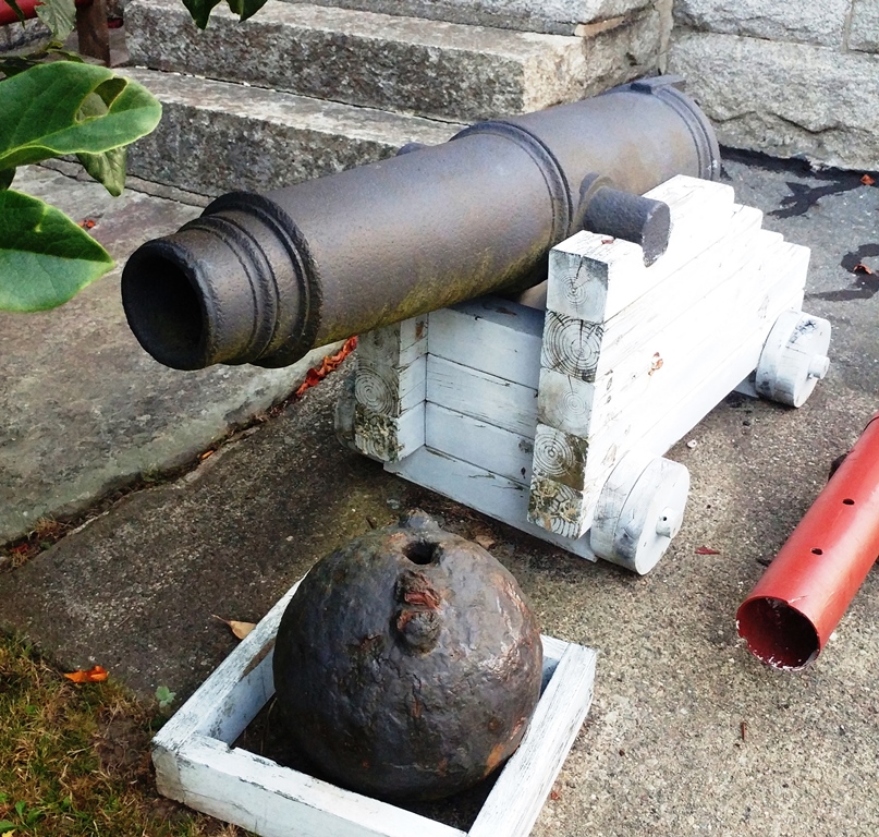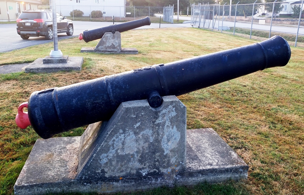 Blomefield Cast Iron 12-pounder 34-cwt Smoothbore Muzzleloading Gun, weight unknown, unmounted, No. 1 of 2 on the ground by the Sambro Island light.