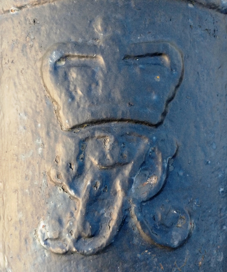 Bronze 6-pounder 6-cwt Smoothbore Muzzleloading Gun, weight unknown, (ca 600 lbs), inscribed TRIA JUNCTA IN UNO (three joined in one), (Serial No. unknown), left and right trunnions blank, Queen Victoria cypher, S. ECCLES 1853, No. 3 on the button. On the chase is the Master General of Ordnance’s (MGO) emblem for Fitzroy James Henry Somerset, the 1st Baron Raglan, MGO in 1852-55. No. 2 of 2 guns stored with the University.