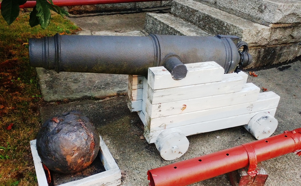 Cast Iron 4-pounder Smoothbore Muzzleloading Gun, (1,400 lbs+), weight 4-1-7 (483 lbs), 4-feet, 6-inches long, ca. 1800 to 1820, No. 1 of 2, East of the blockhouse.