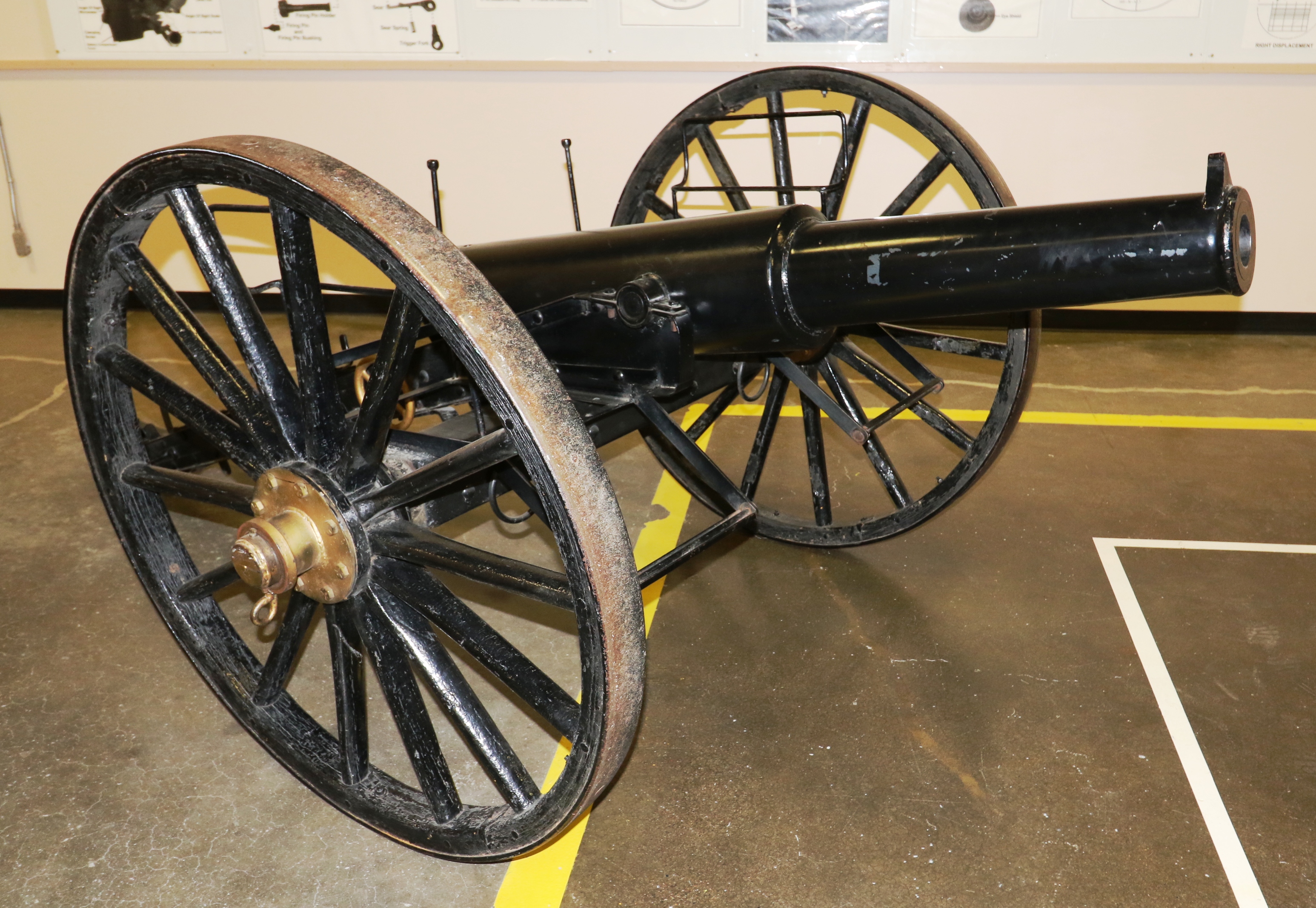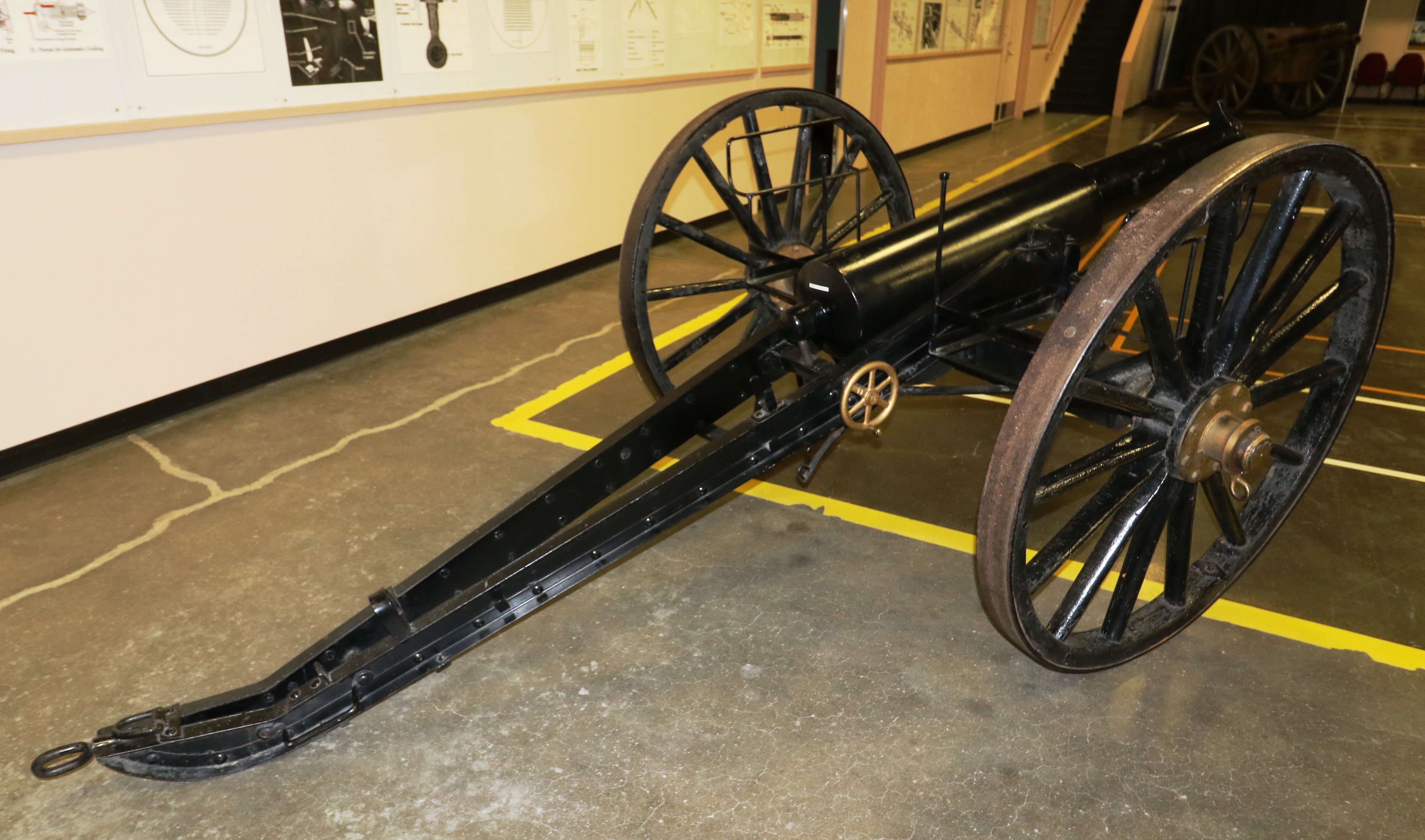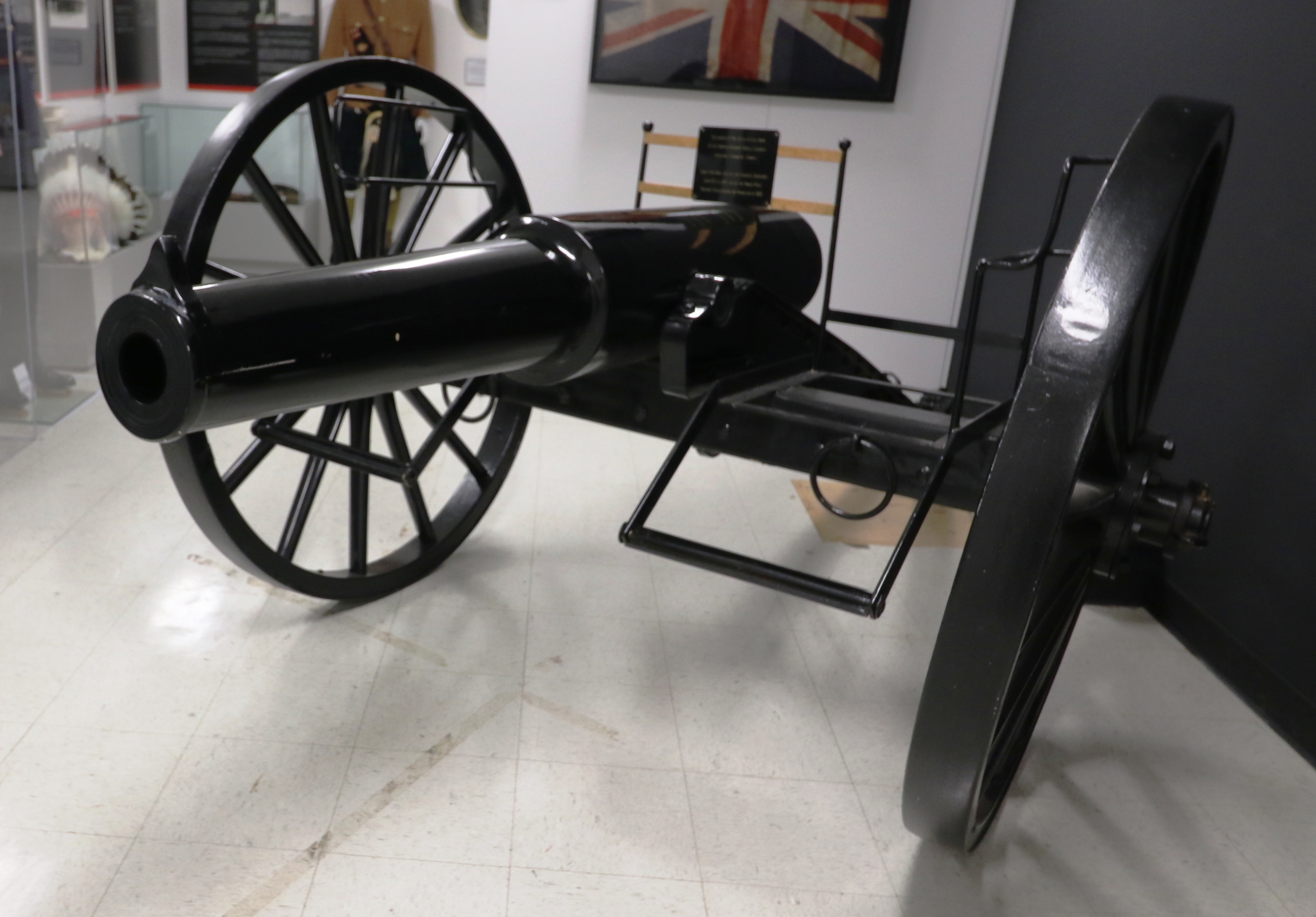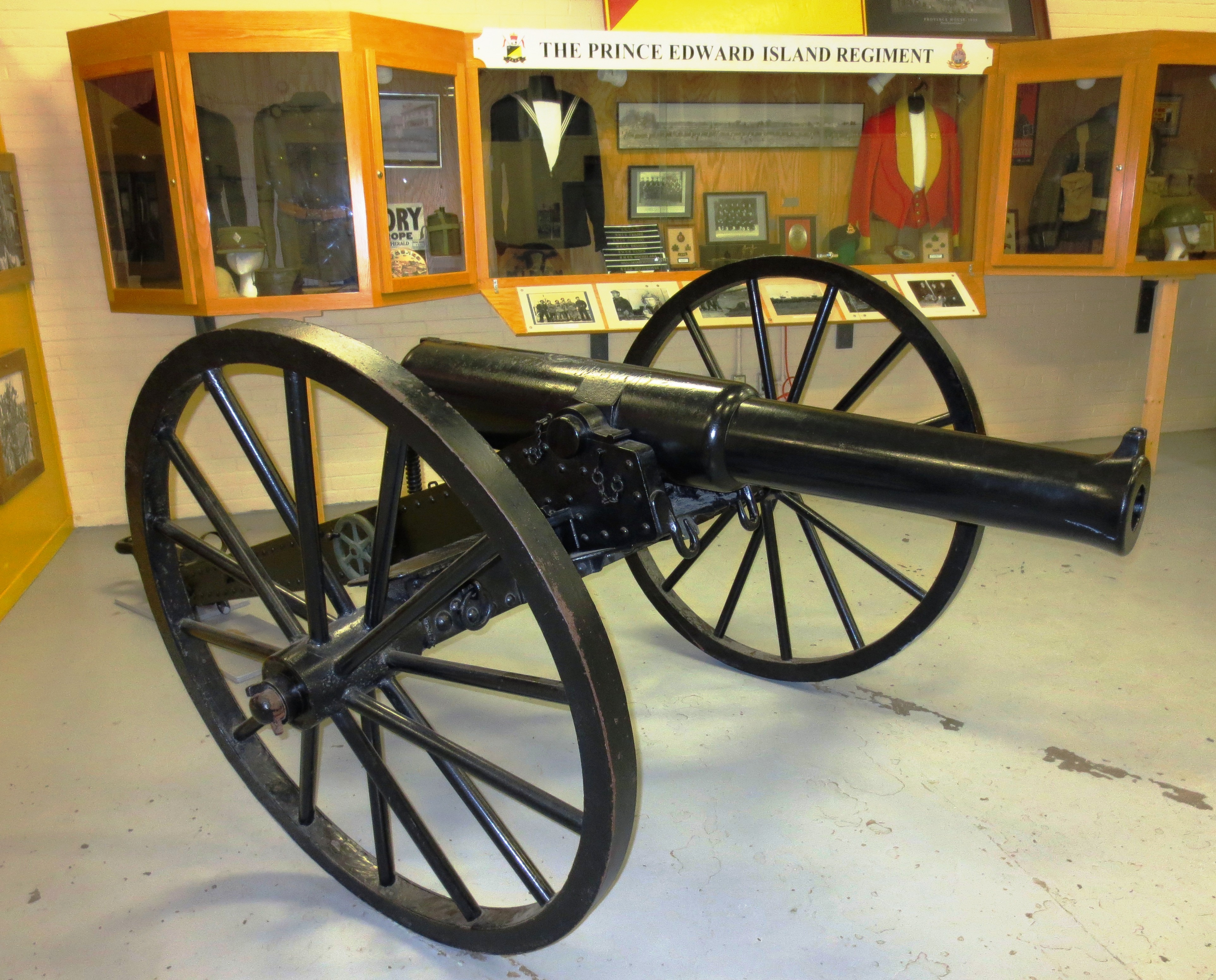 9-pounder 8-cwt Muzzleloading Rifle, weight 8-1-11 (935 lbs), (Reg. No. 606 I 1874) on the right trunnion, Queen Victoria cypher, mounted on a wood wheeled field carriage Reg. No. 40, RGF 1874, Issued to the Welland Field Battery in Ontario in 1893. It is on display inside the museum.