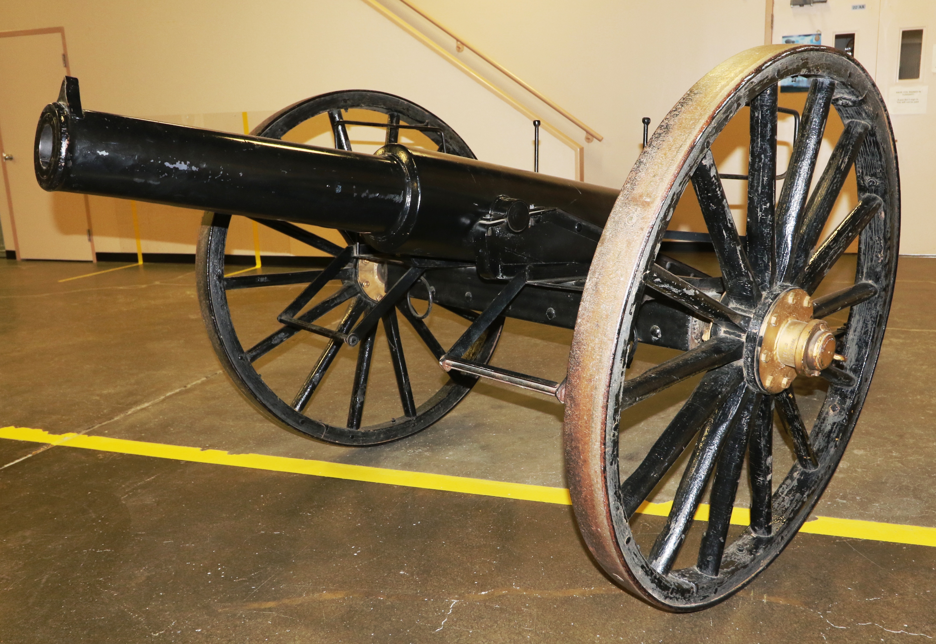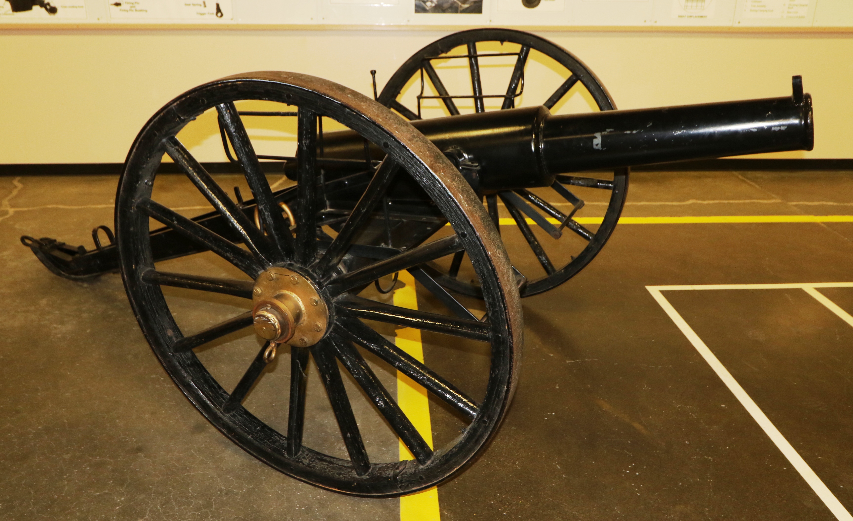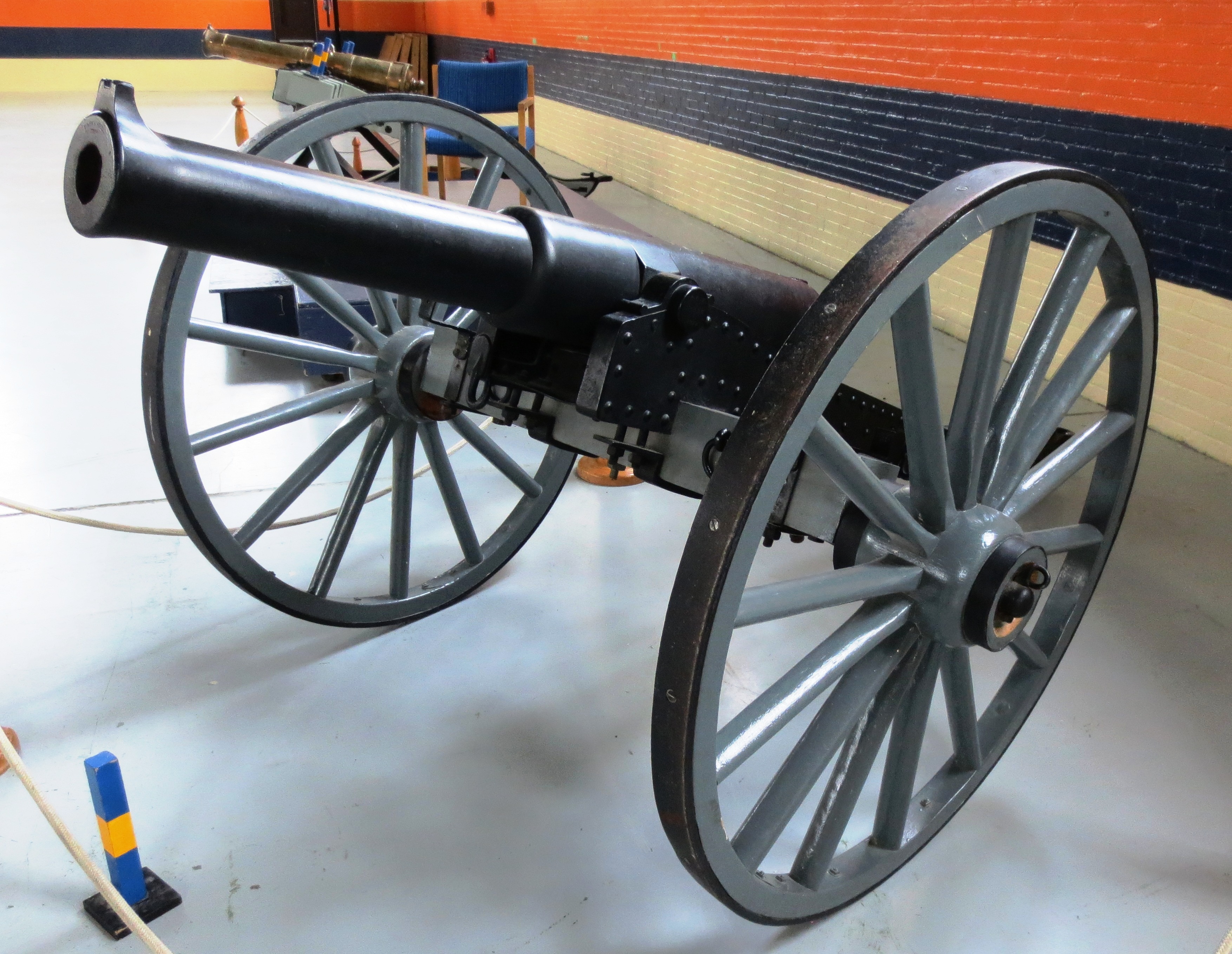 9-pounder 8-cwt Muzzleloading Rifle, weight 8-1-11 (935 lbs), (Reg. No. 606 I 1874) on the right trunnion, Queen Victoria cypher, mounted on a wood wheeled field carriage Reg. No. 40, RGF 1874, Issued to the Welland Field Battery in Ontario in 1893. It is on display inside the museum.