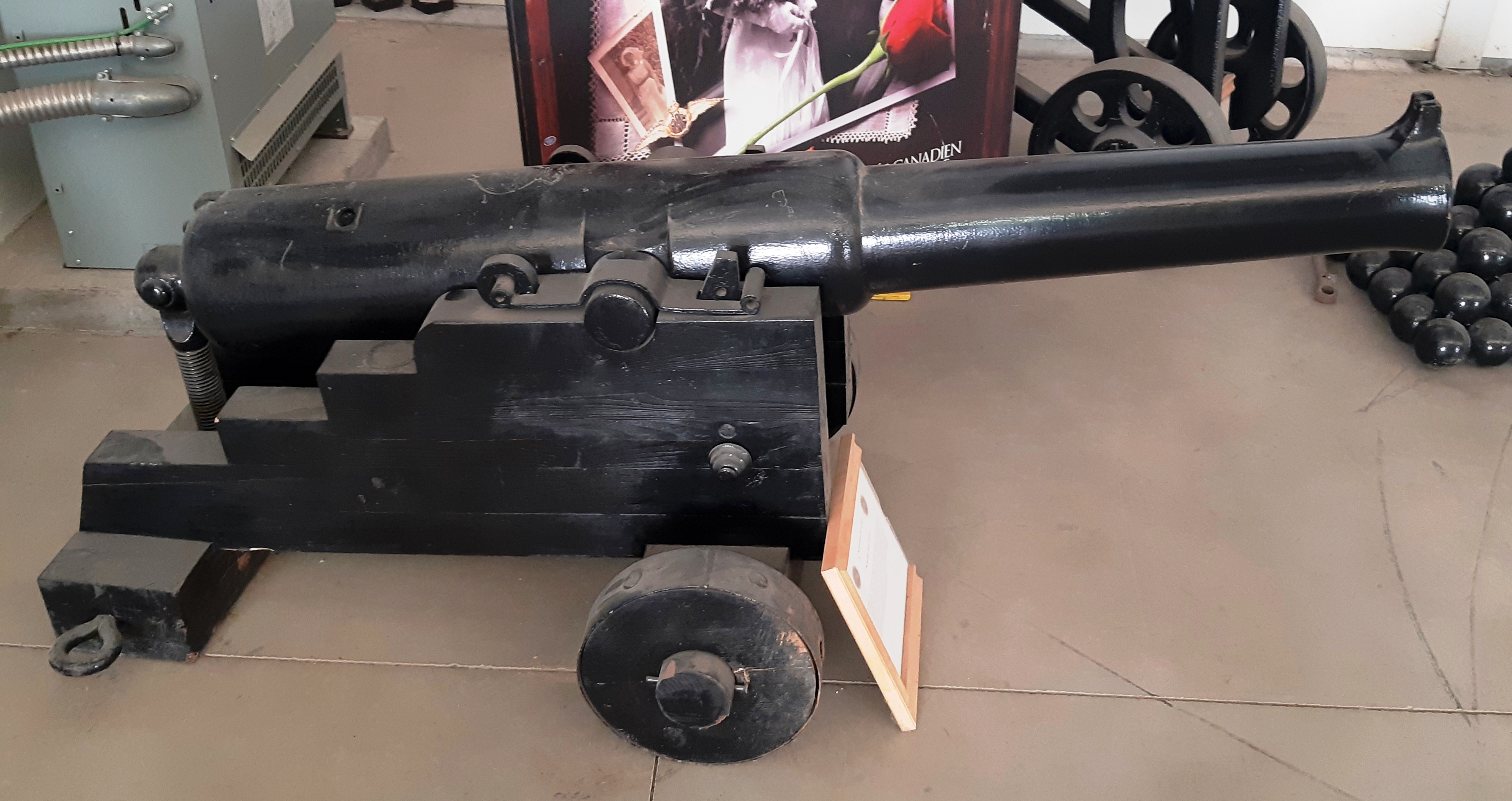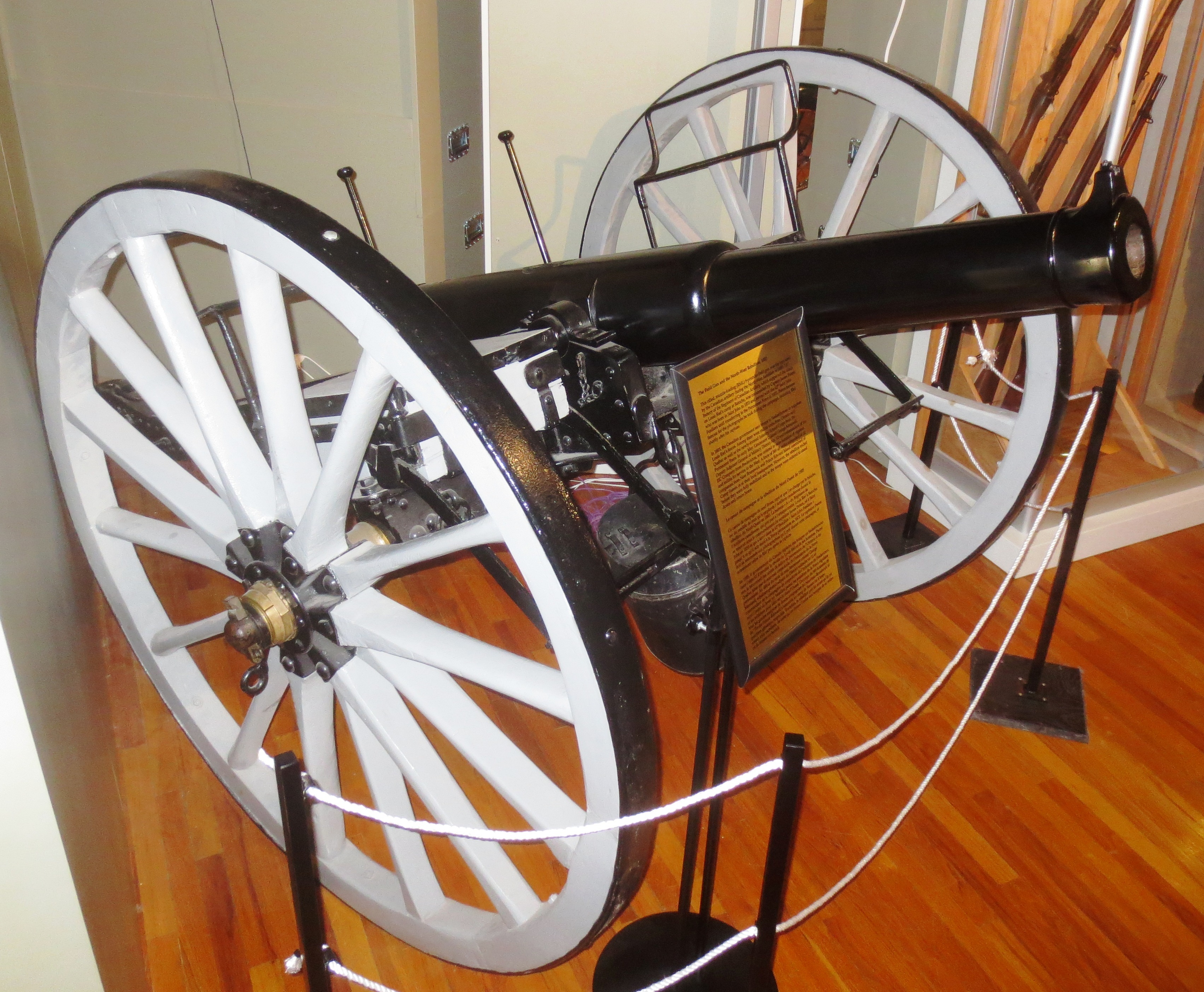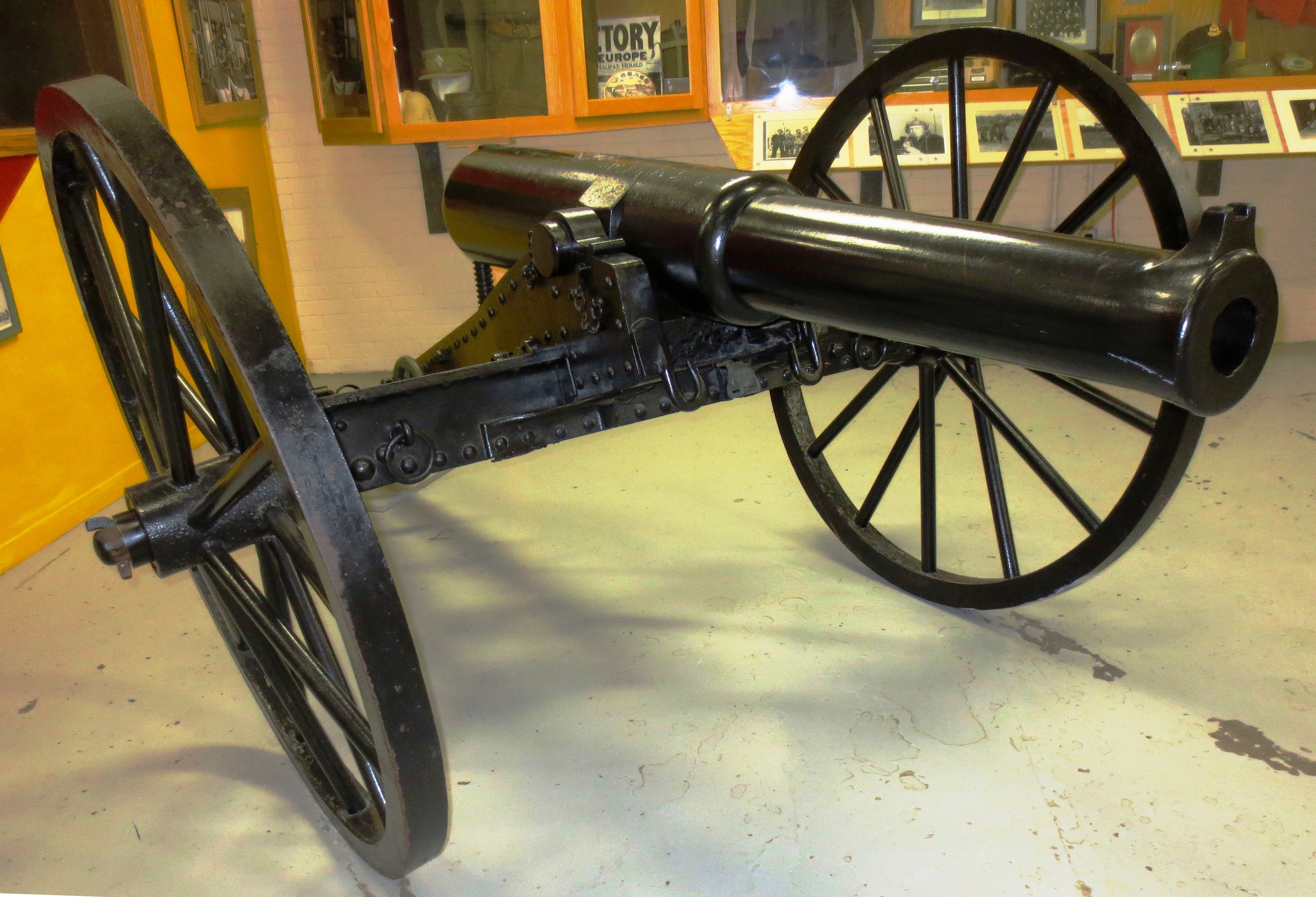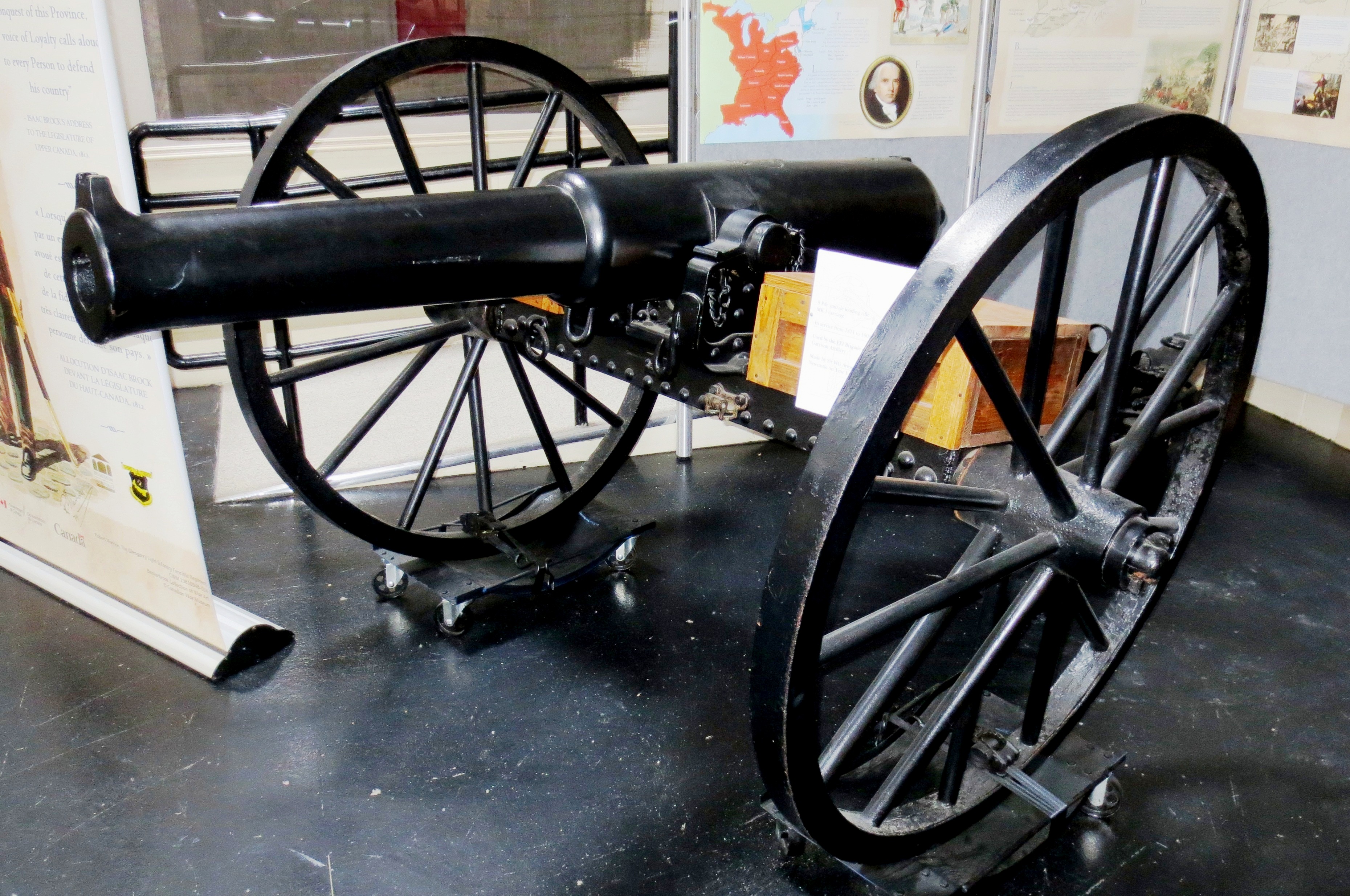 9-pounder 8-cwt Muzzleloading Rifle, weight 8-1-11 (935 lbs), (Reg. No. 606 I 1874) on the right trunnion, Queen Victoria cypher, mounted on a wood wheeled field carriage Reg. No. 40, RGF 1874, Issued to the Welland Field Battery in Ontario in 1893. It is on display inside the museum.