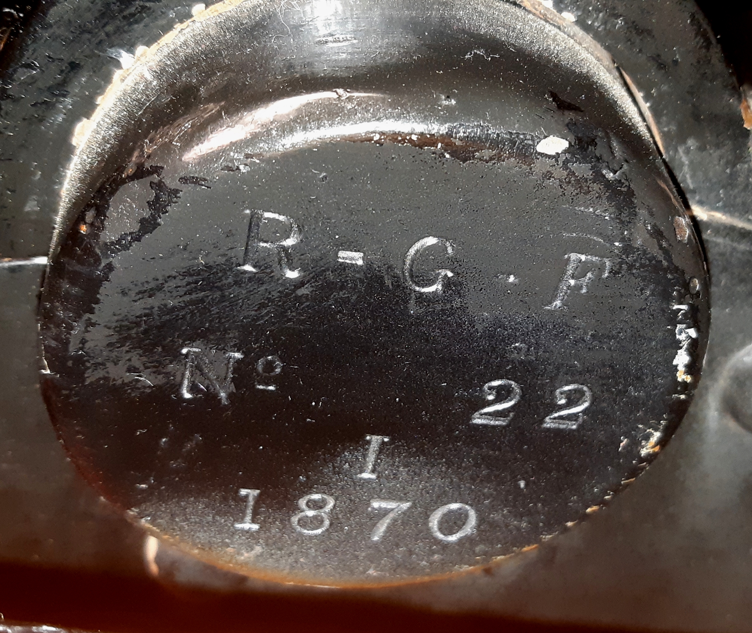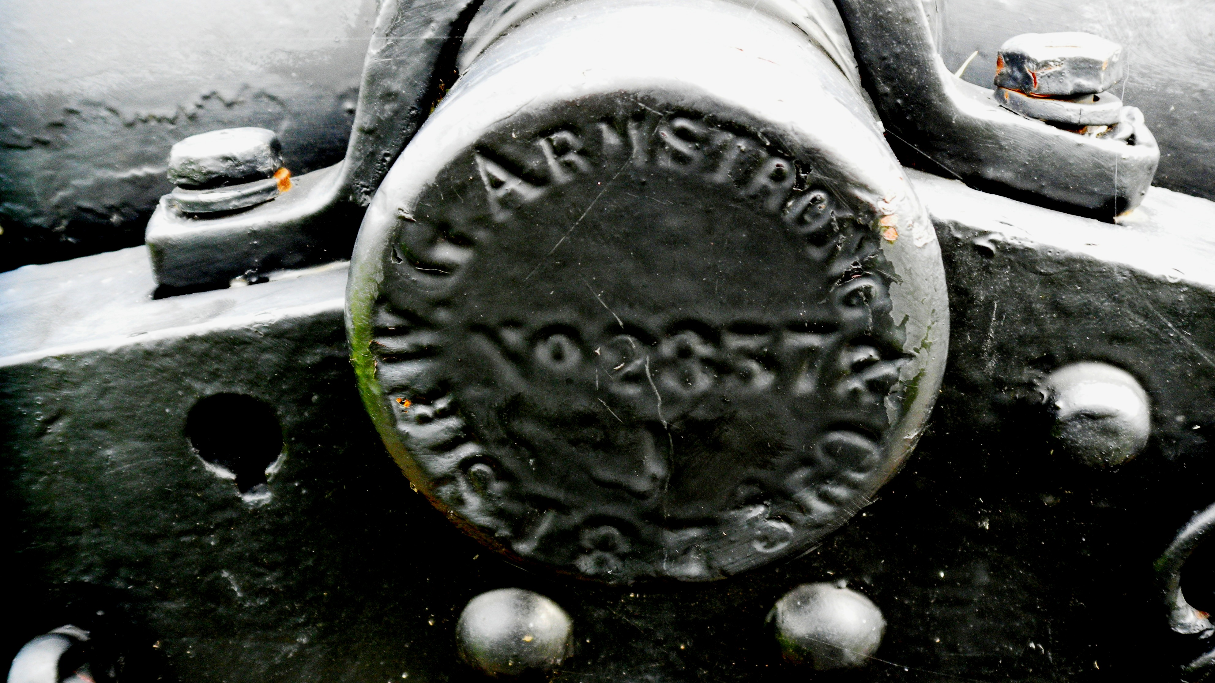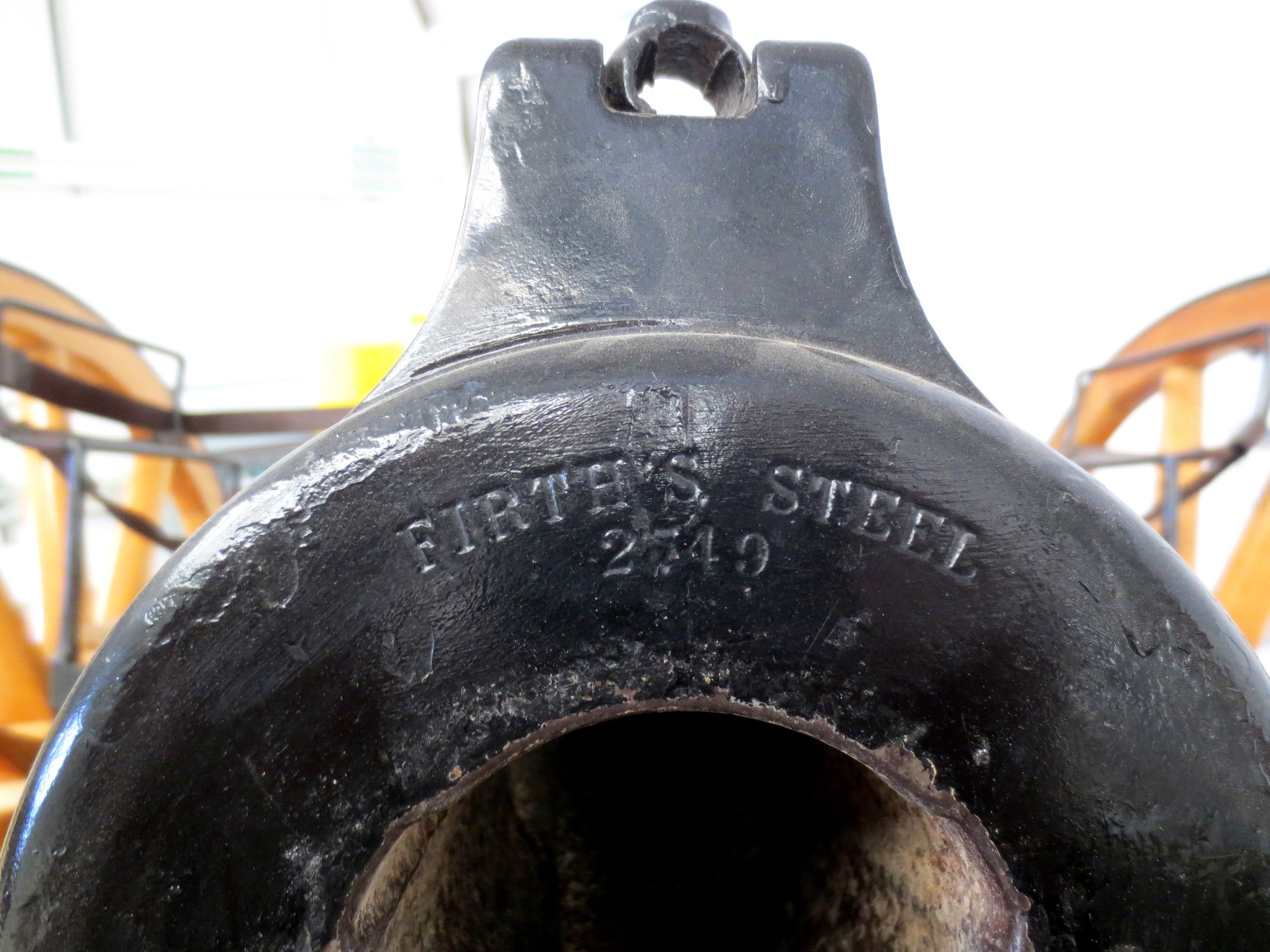 9-pounder 8-cwt Muzzleloading Rifle, weight 8-1-6 (930 lbs), left trunnion (R-G-F No. 274, I, 1872), right trunnion blank, stamped with the King’s Arrow, 30, Firth’s Steel No. 2840 on the muzzle, Queen Victoria cypher on the barrel. The gun is mounted on a wheeled carriage stamped Sir W.G. Armstrong and Co. Newcastle on the Tyne, No. 1455. On display inside the PEIR armoury.