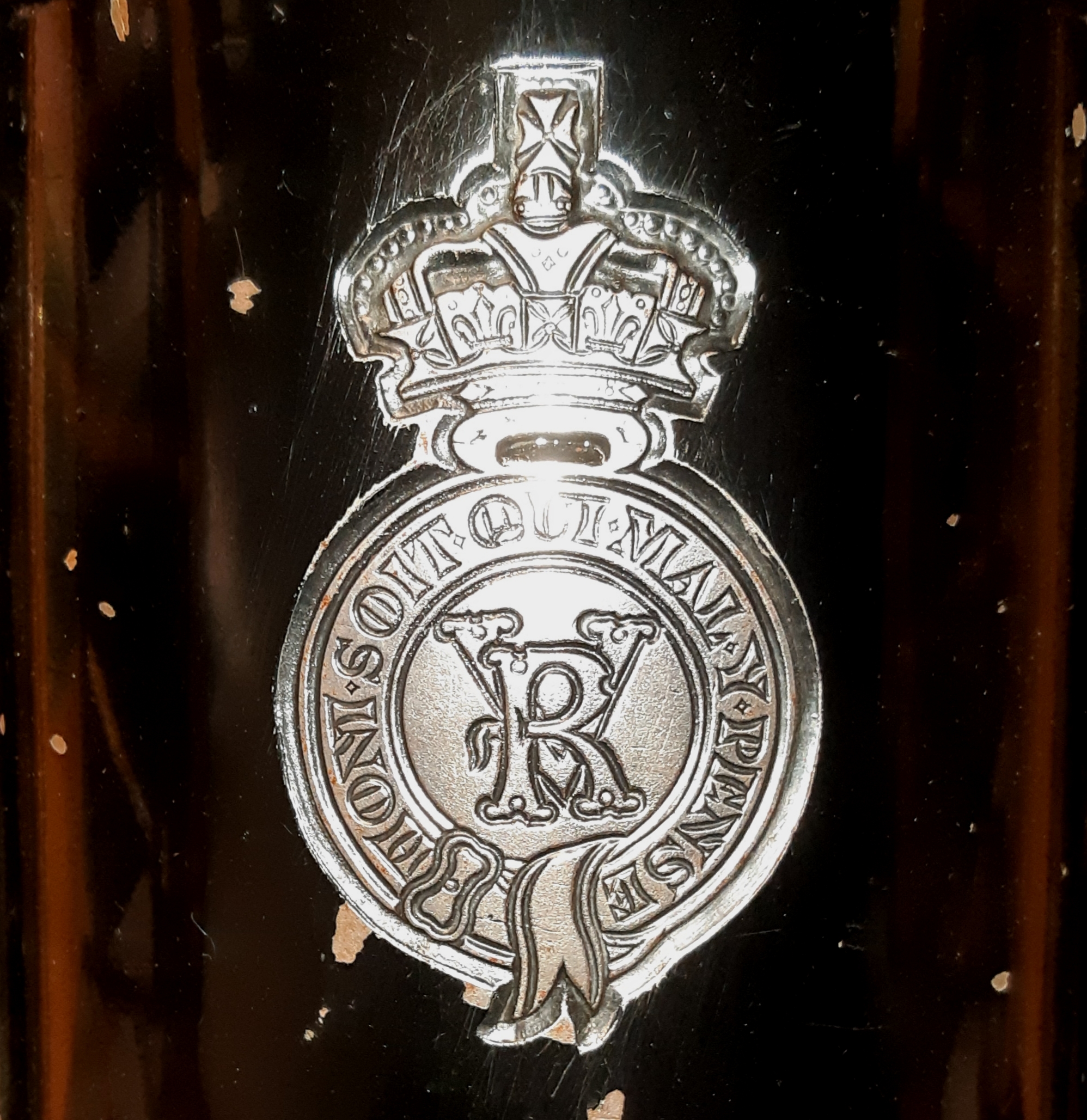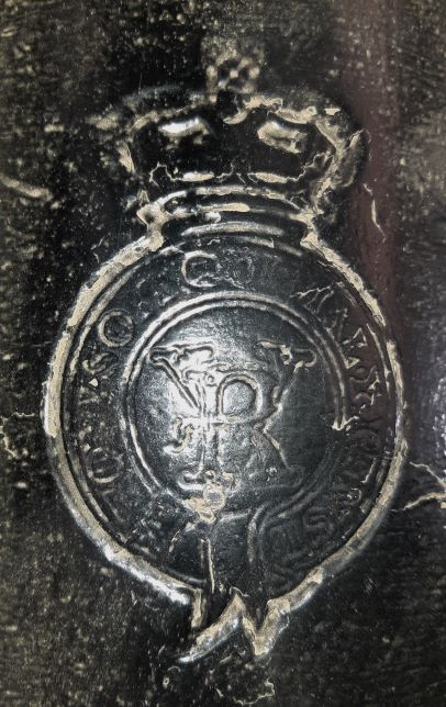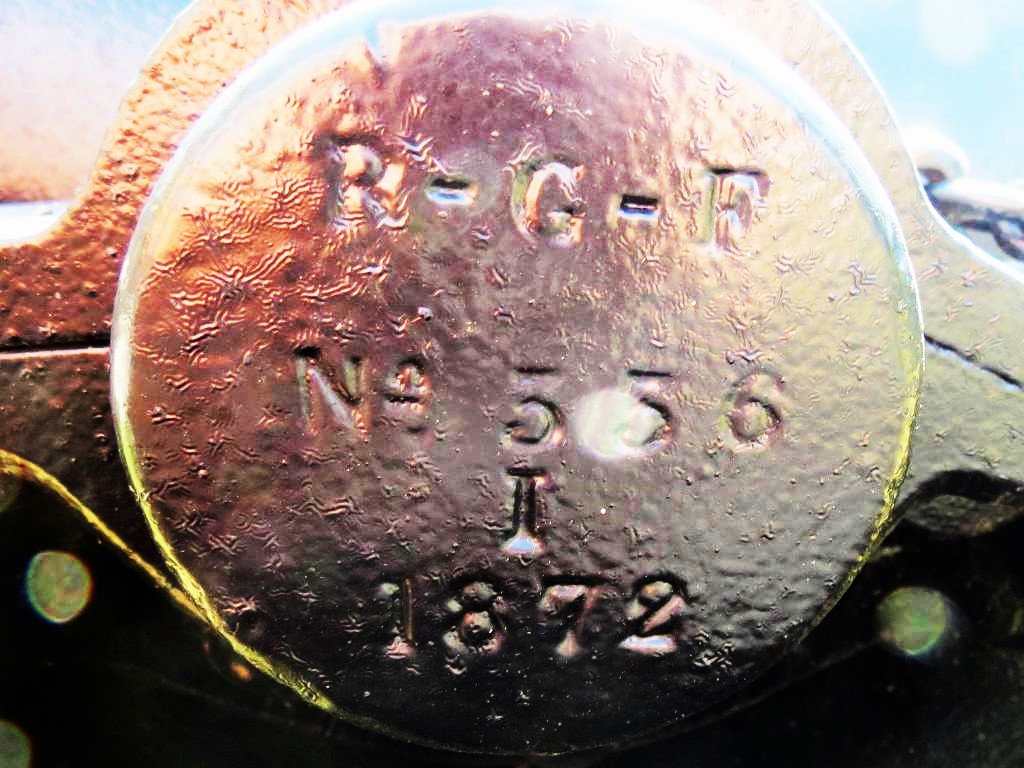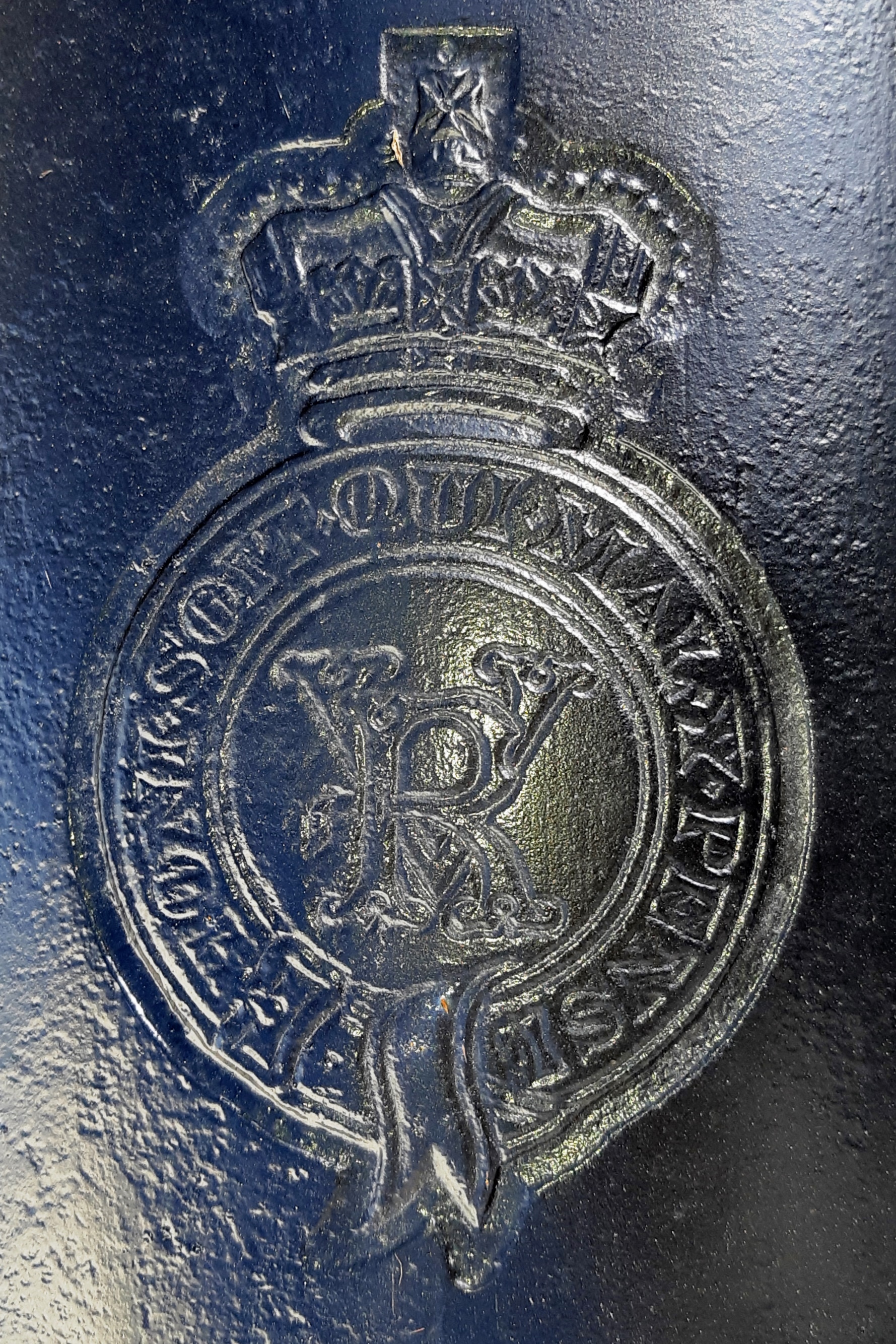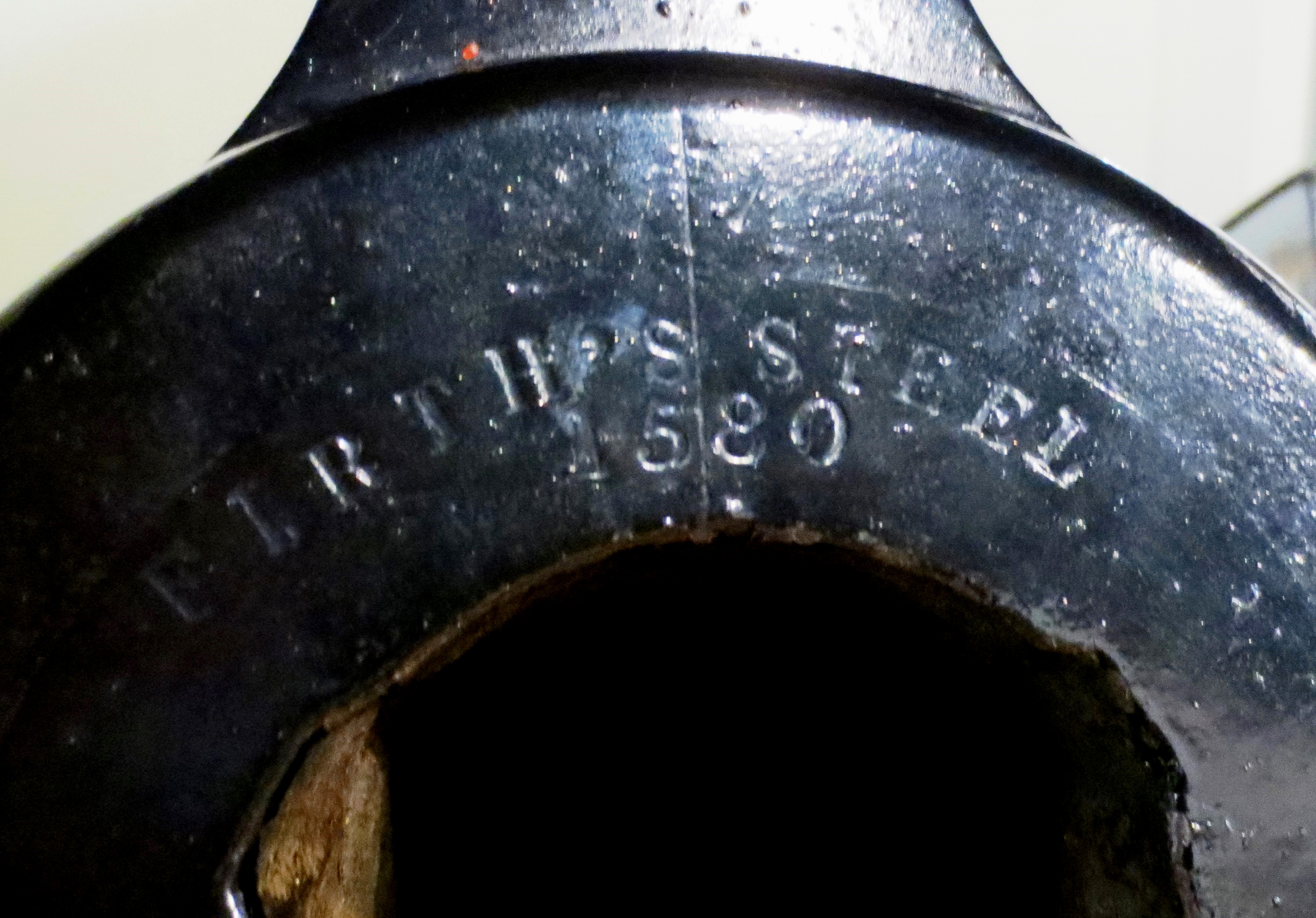 9-pounder 8-cwt Muzzleloading Rifle, weight 8-1-6 (930 lbs), left trunnion (R-G-F No. 274, I, 1872), right trunnion blank, stamped with the King’s Arrow, 30, Firth’s Steel No. 2840 on the muzzle, Queen Victoria cypher on the barrel. The gun is mounted on a wheeled carriage stamped Sir W.G. Armstrong and Co. Newcastle on the Tyne, No. 1455. On display inside the PEIR armoury.