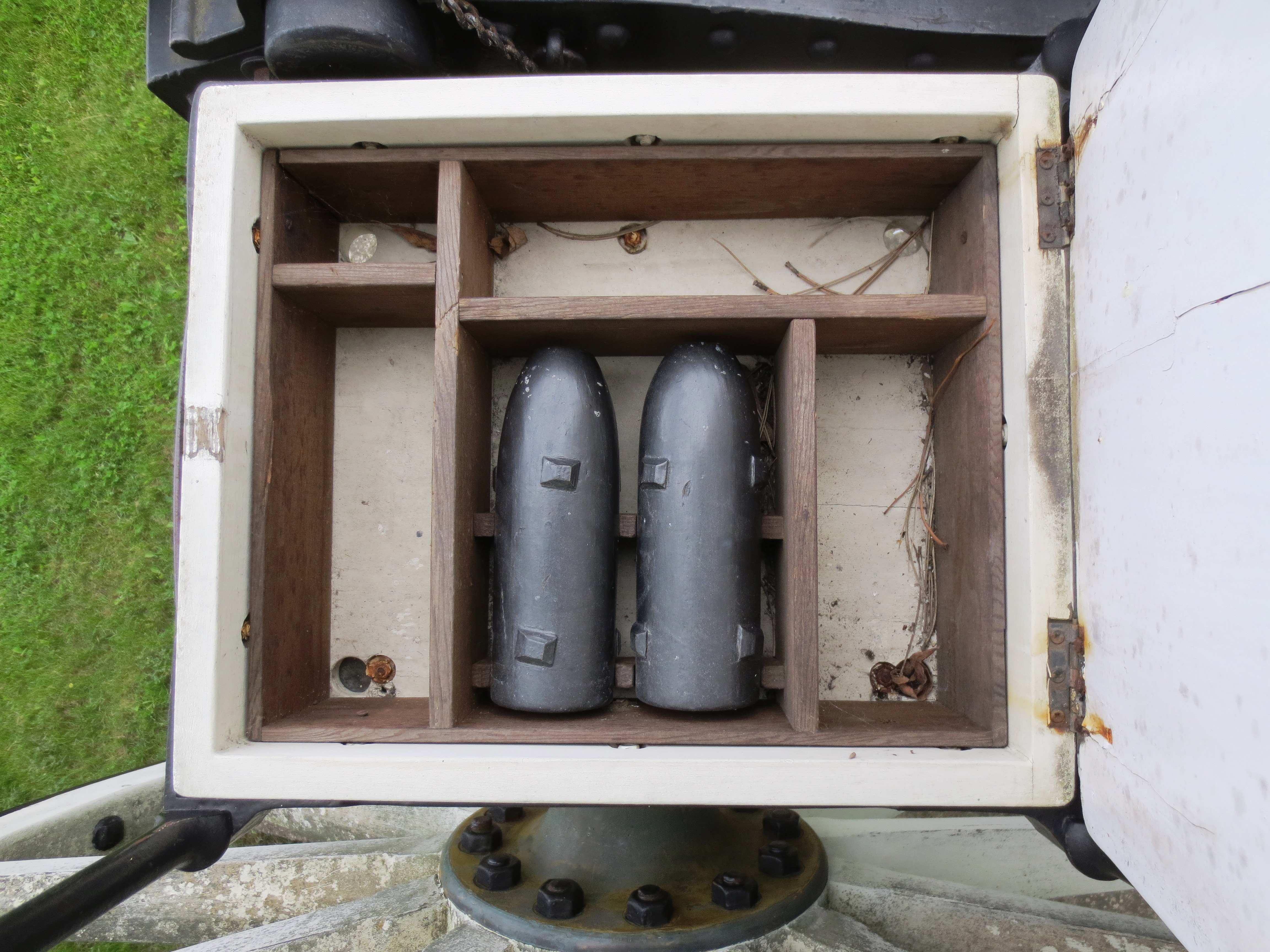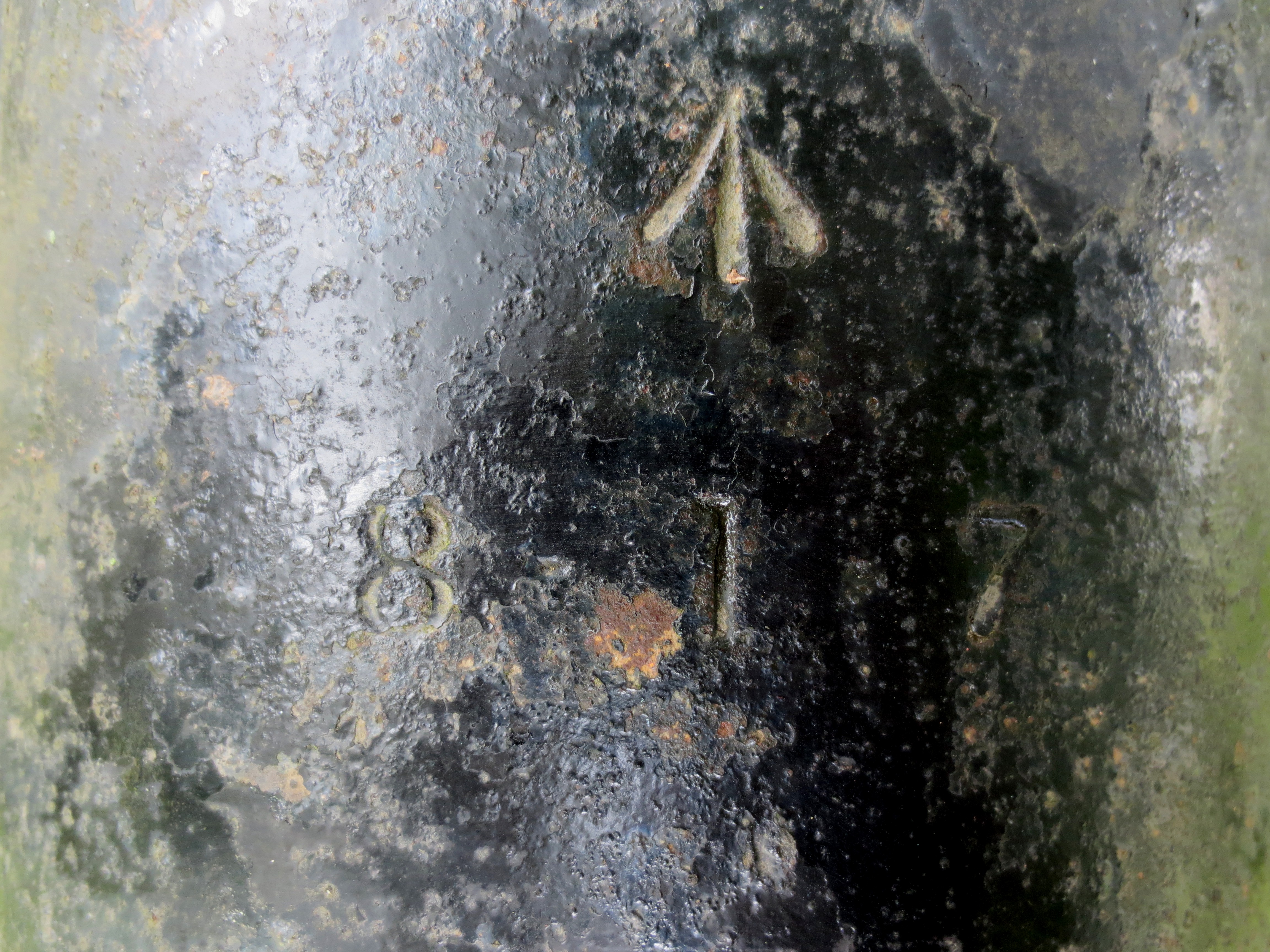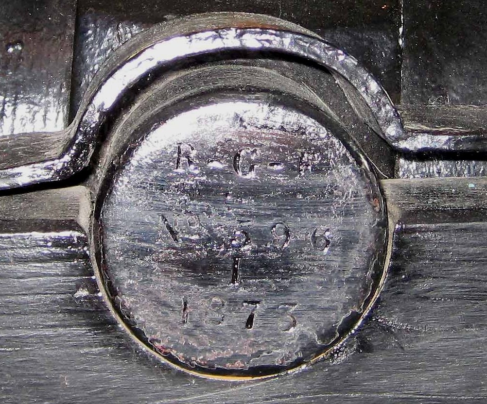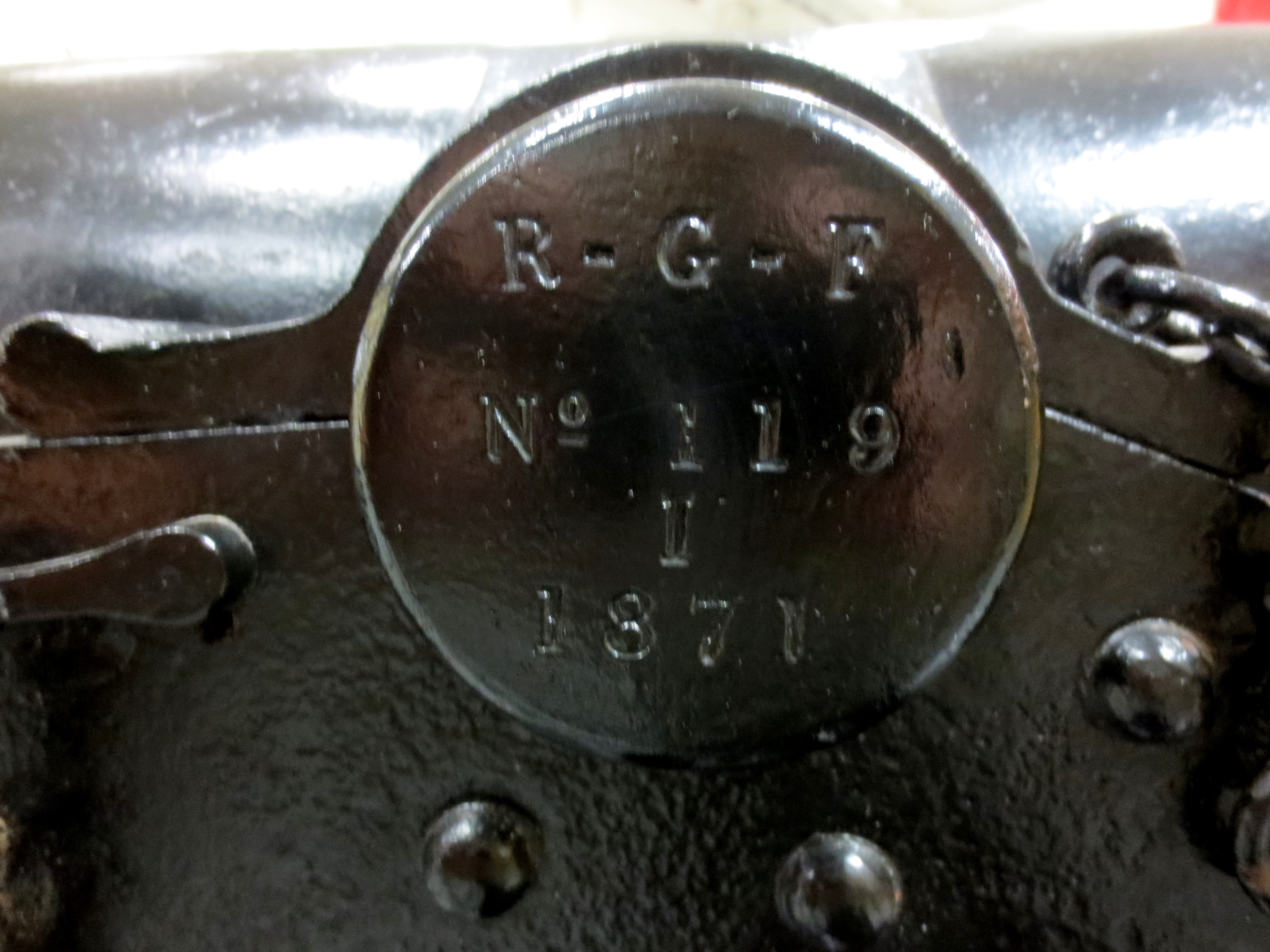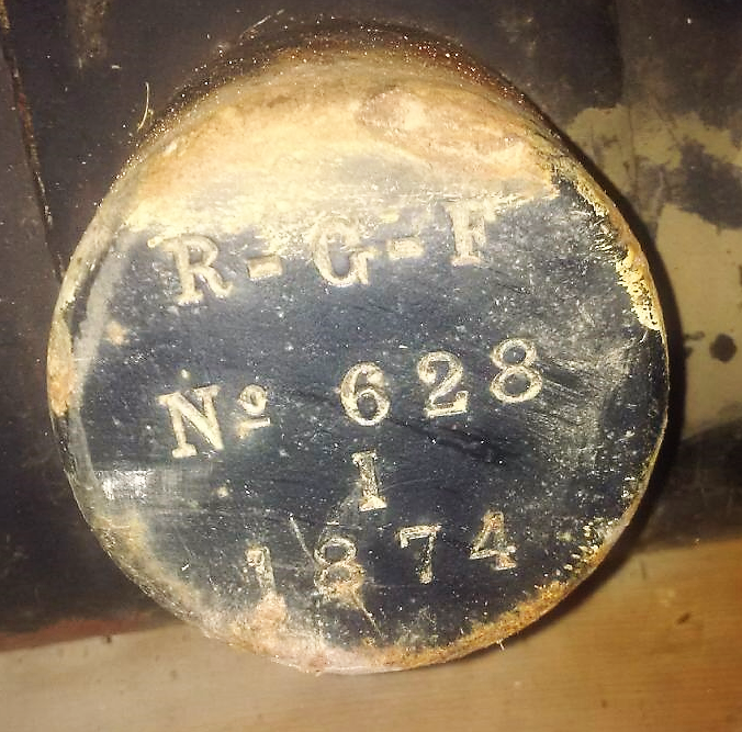 9-pounder 8-cwt Muzzleloading Rifle Mk. 1, weight 8-1-7 (931 lbs), RGF No. 628, I, 1874 on the right trunnion. This MLR is possibly associated with No. 15 Shefford-Granby Battery. This MLR is now in the hands of Les Matross. Its restoration and rehabilitation are in the hands of Normand Roberge and Tony Walsh.