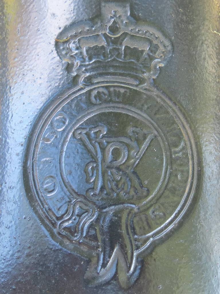9-pounder 8-cwt Muzzleloading Rifle, weight 8-1-4 (928 lbs), (RGF No. 628, I, 1874) on the left trunnion, Queen Victoria cypher, unmounted. Edson Warner.
