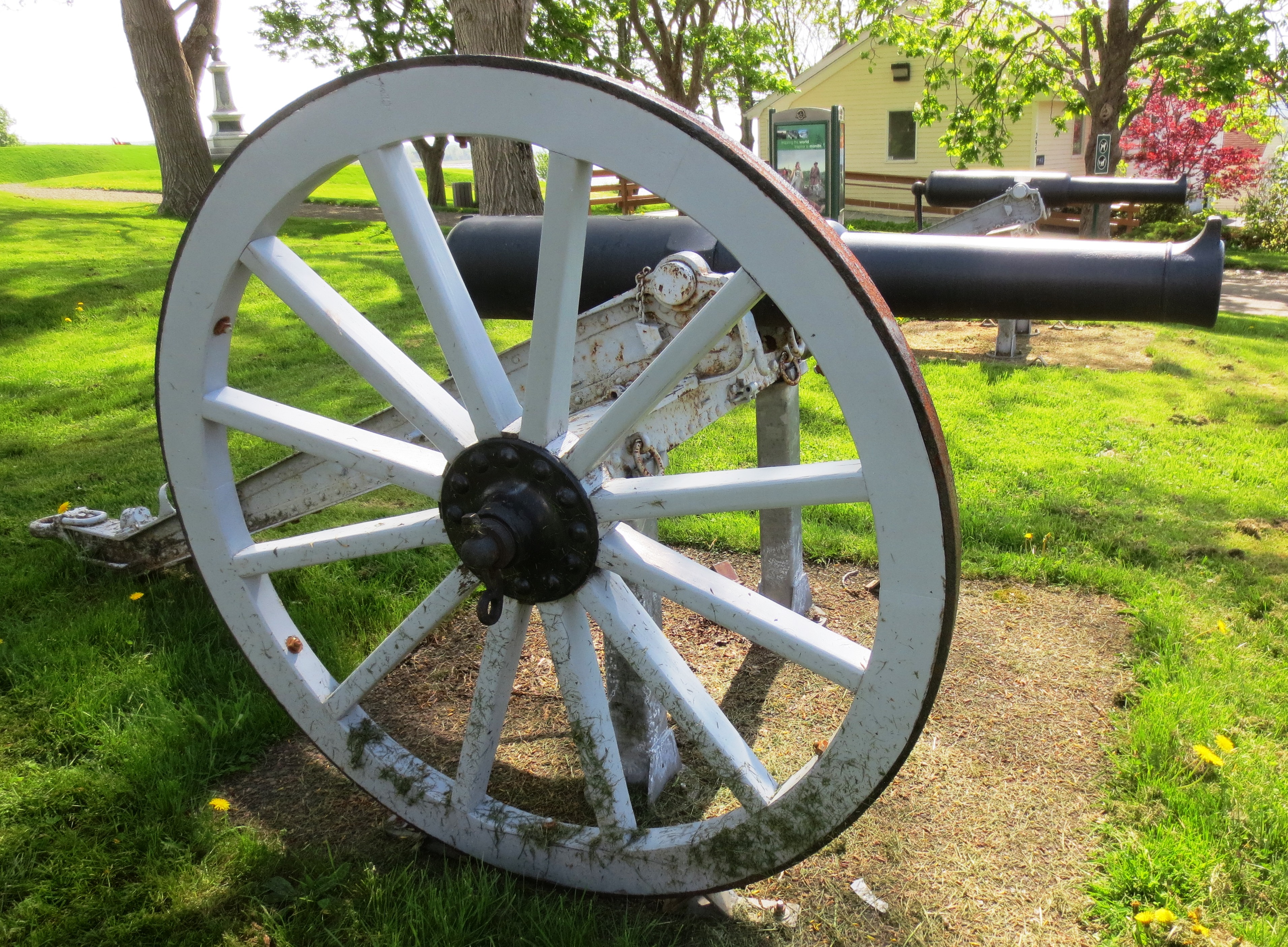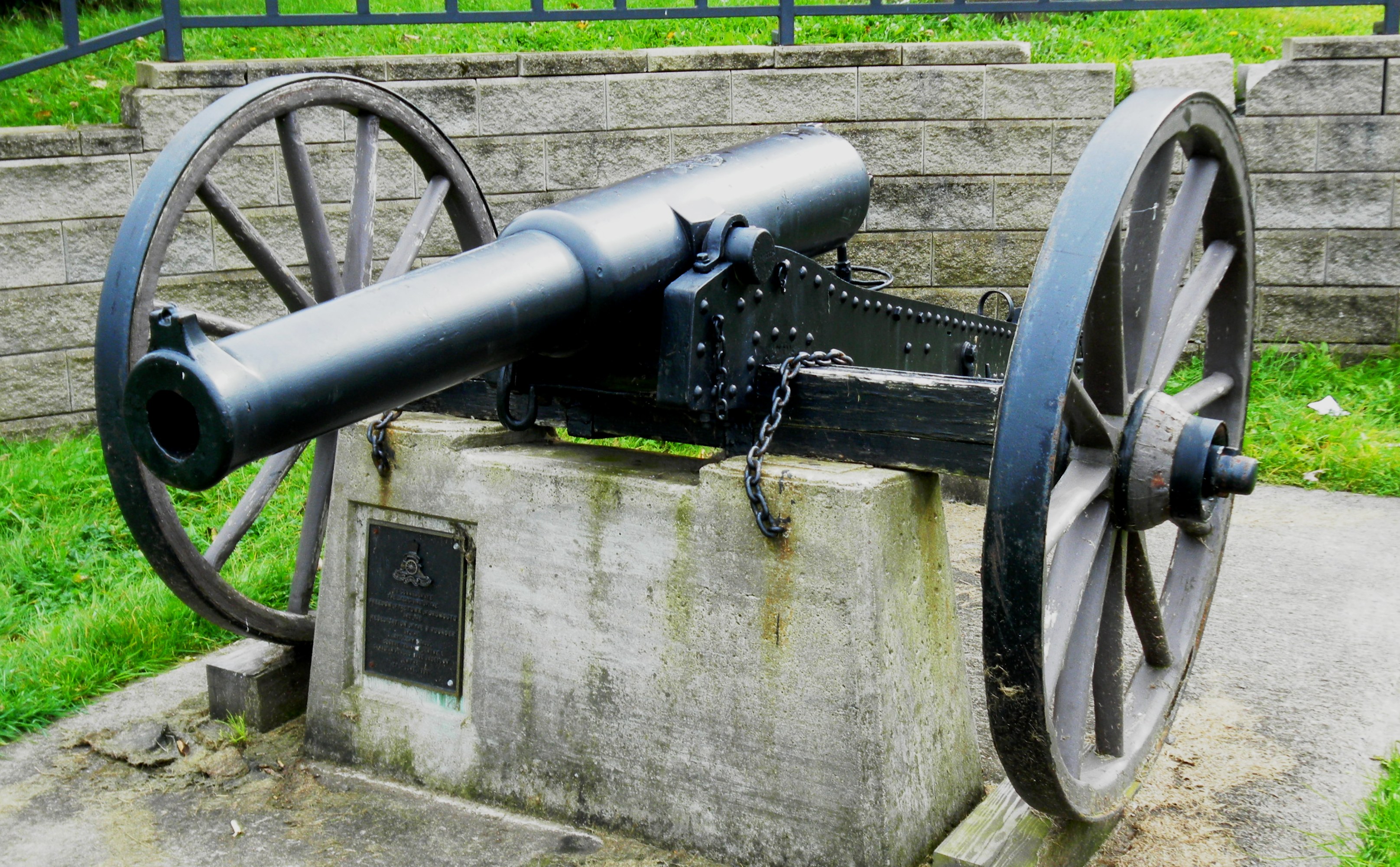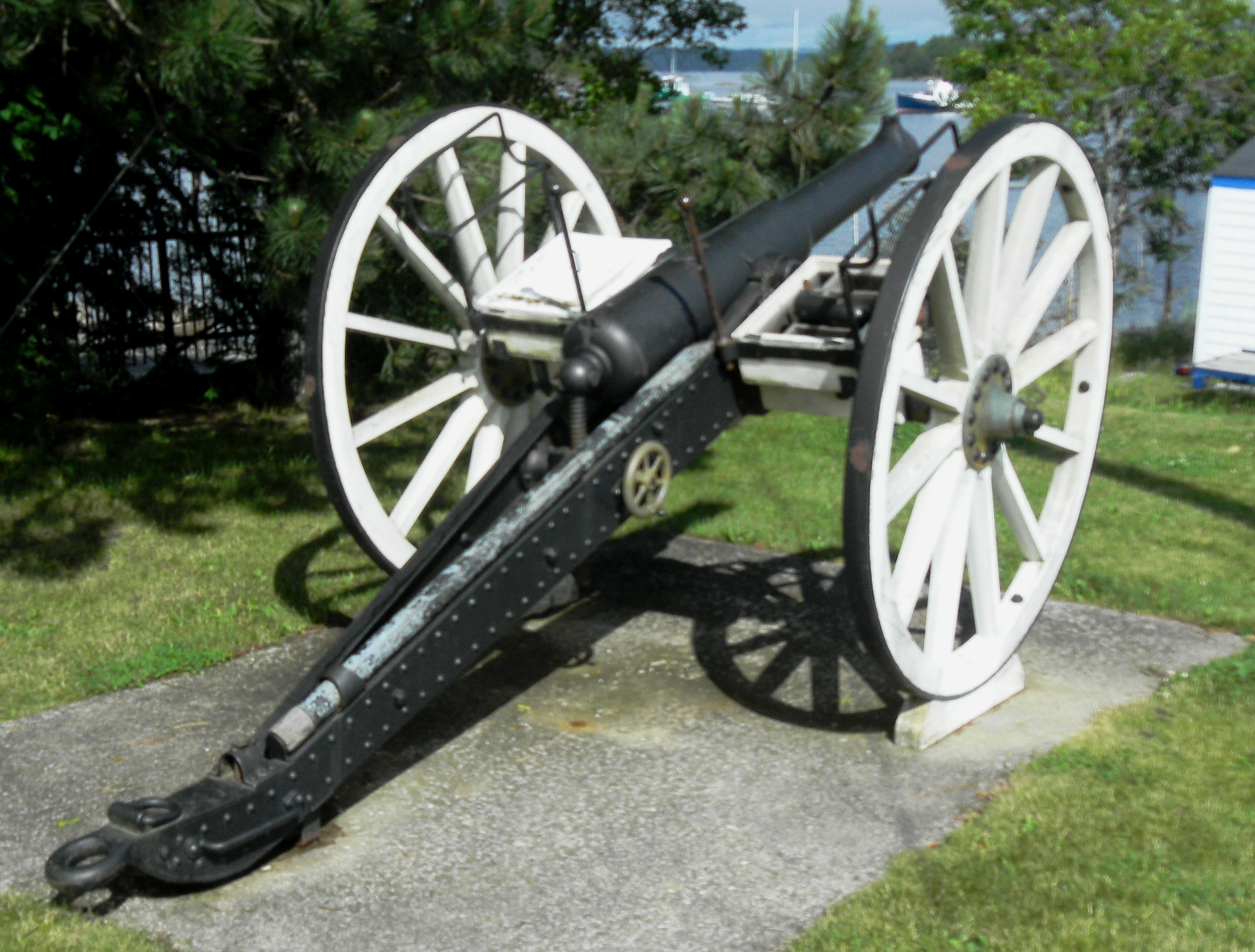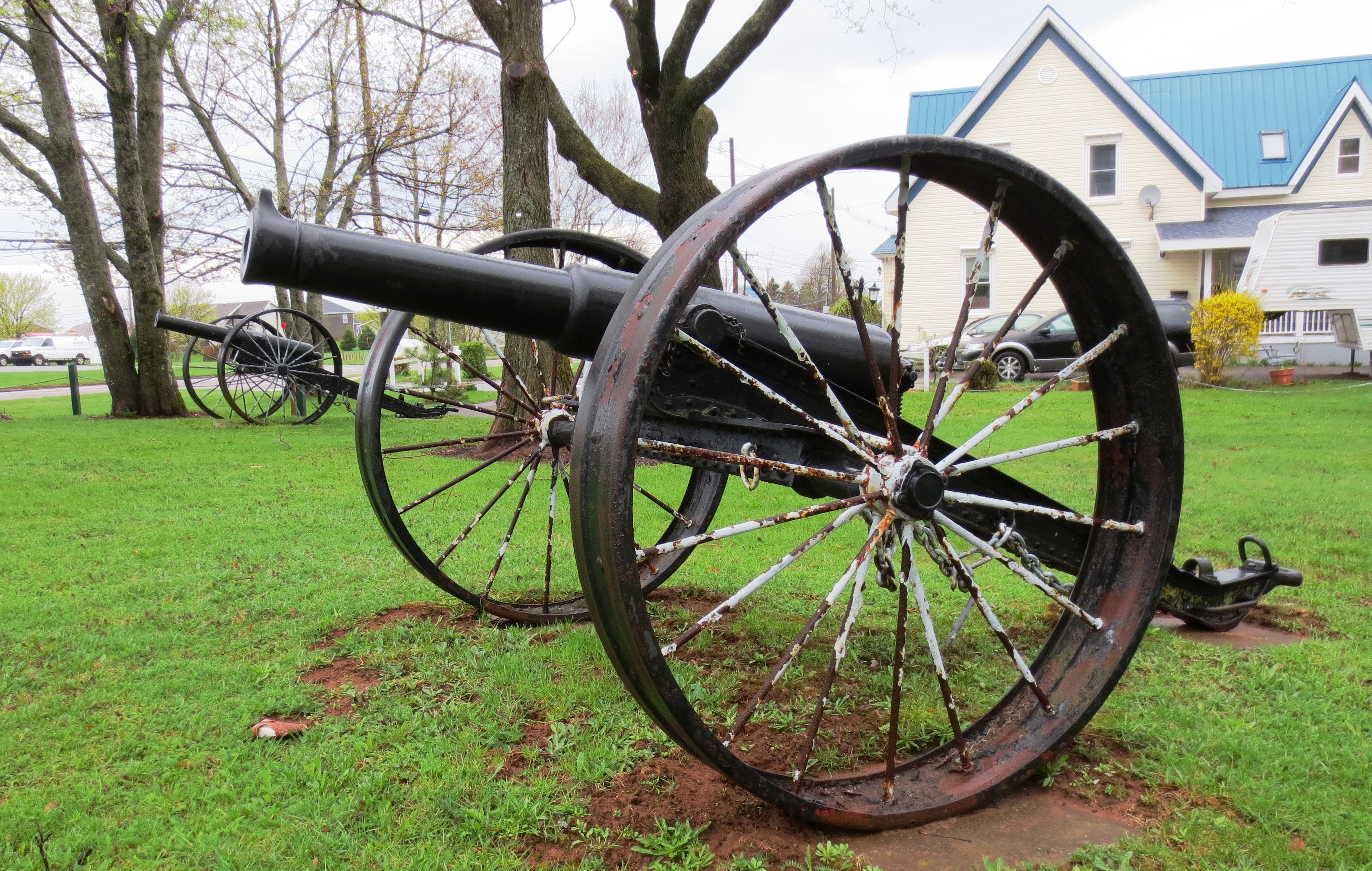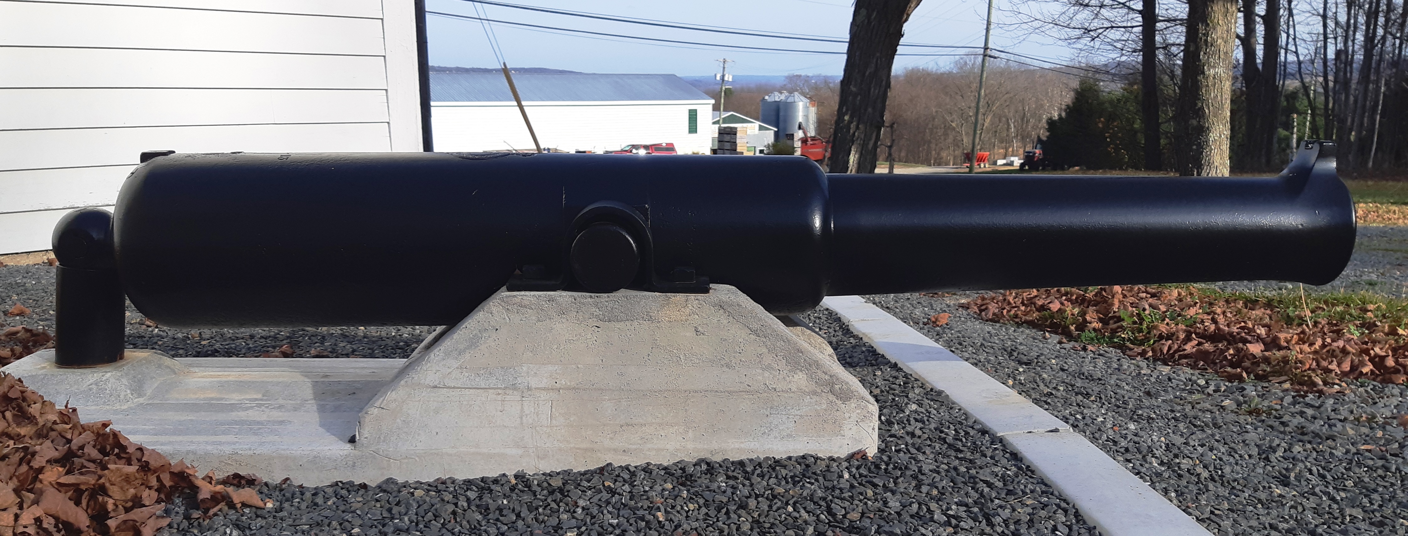 9-pounder 8-cwt Muzzleloading Rifle, weight 8-1-13 (937 lbs), Queen Victoria cypher, Sir W.G. Armstrong and Co., No. 285, Newcastle on the Tyne on the left trunnion. 9-pounders like this gun were used in the North West Rebellion in 1885. This gun was previously located at Maces Bay. It now stands outside the Keswick Ridge Historical Society Museum.