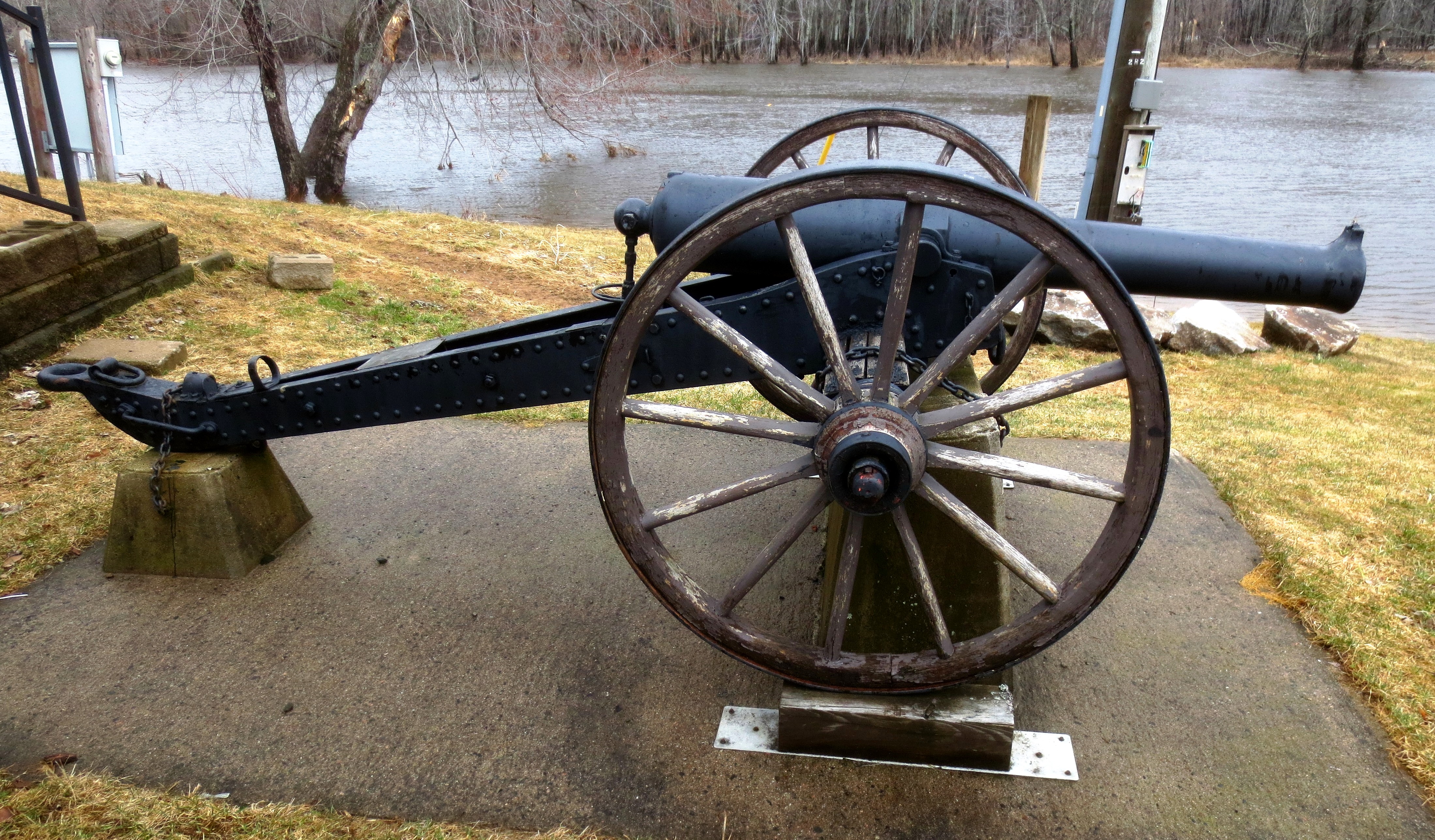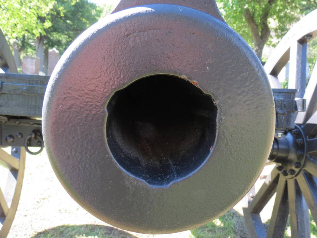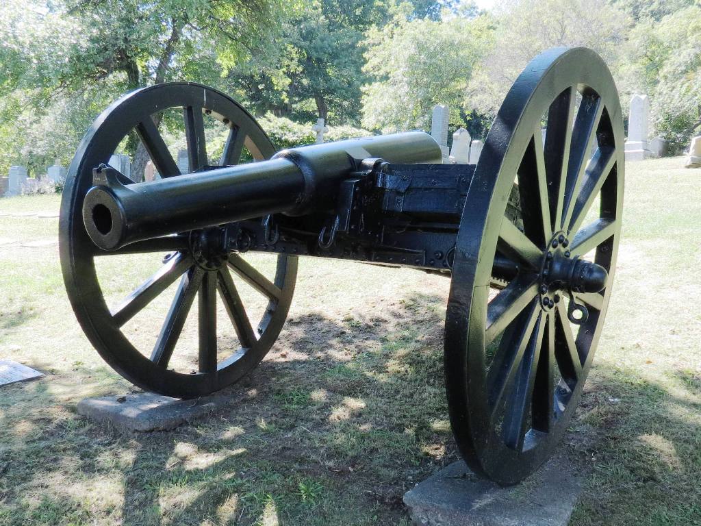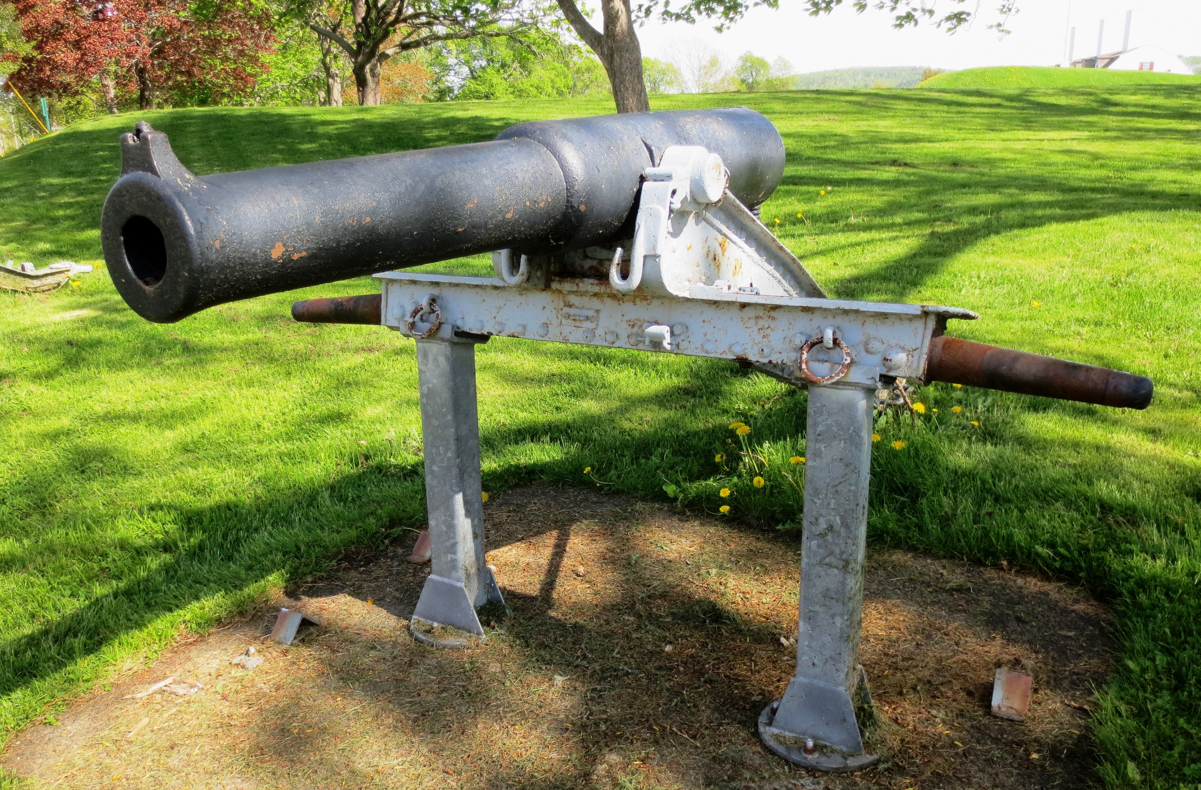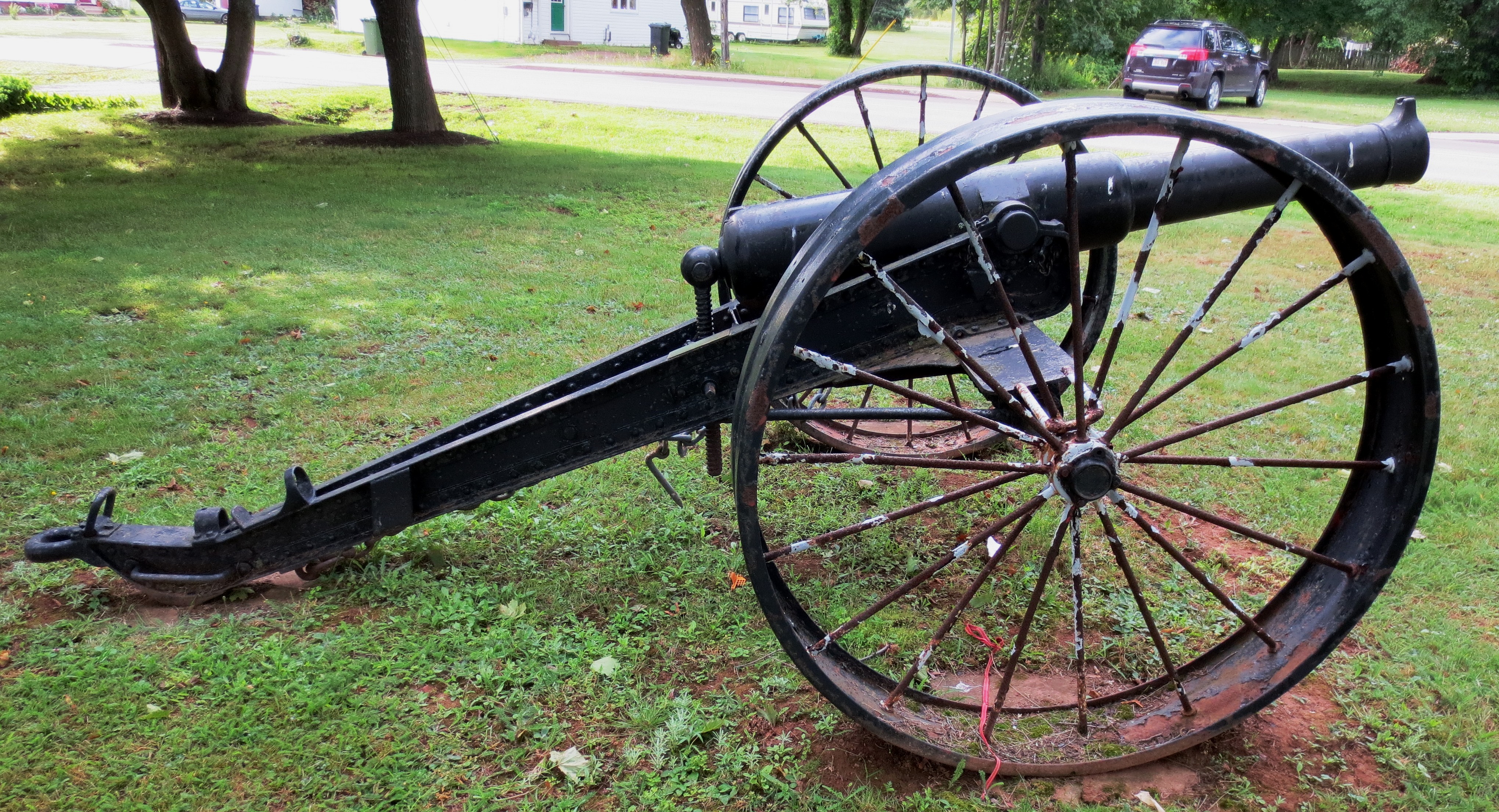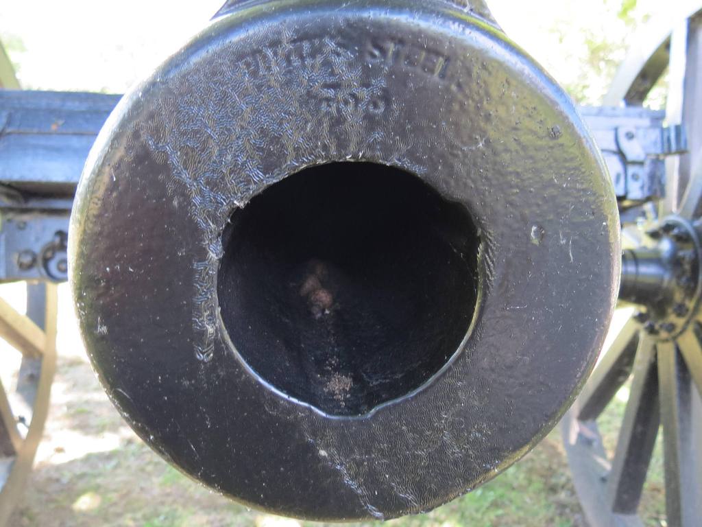 9-pounder 8-cwt Muzzleloading Rifle, weight 8-1-13 (937 lbs), Queen Victoria cypher, Sir W.G. Armstrong and Co., No. 285, Newcastle on the Tyne on the left trunnion. 9-pounders like this gun were used in the North West Rebellion in 1885. This gun was previously located at Maces Bay. It now stands outside the Keswick Ridge Historical Society Museum.