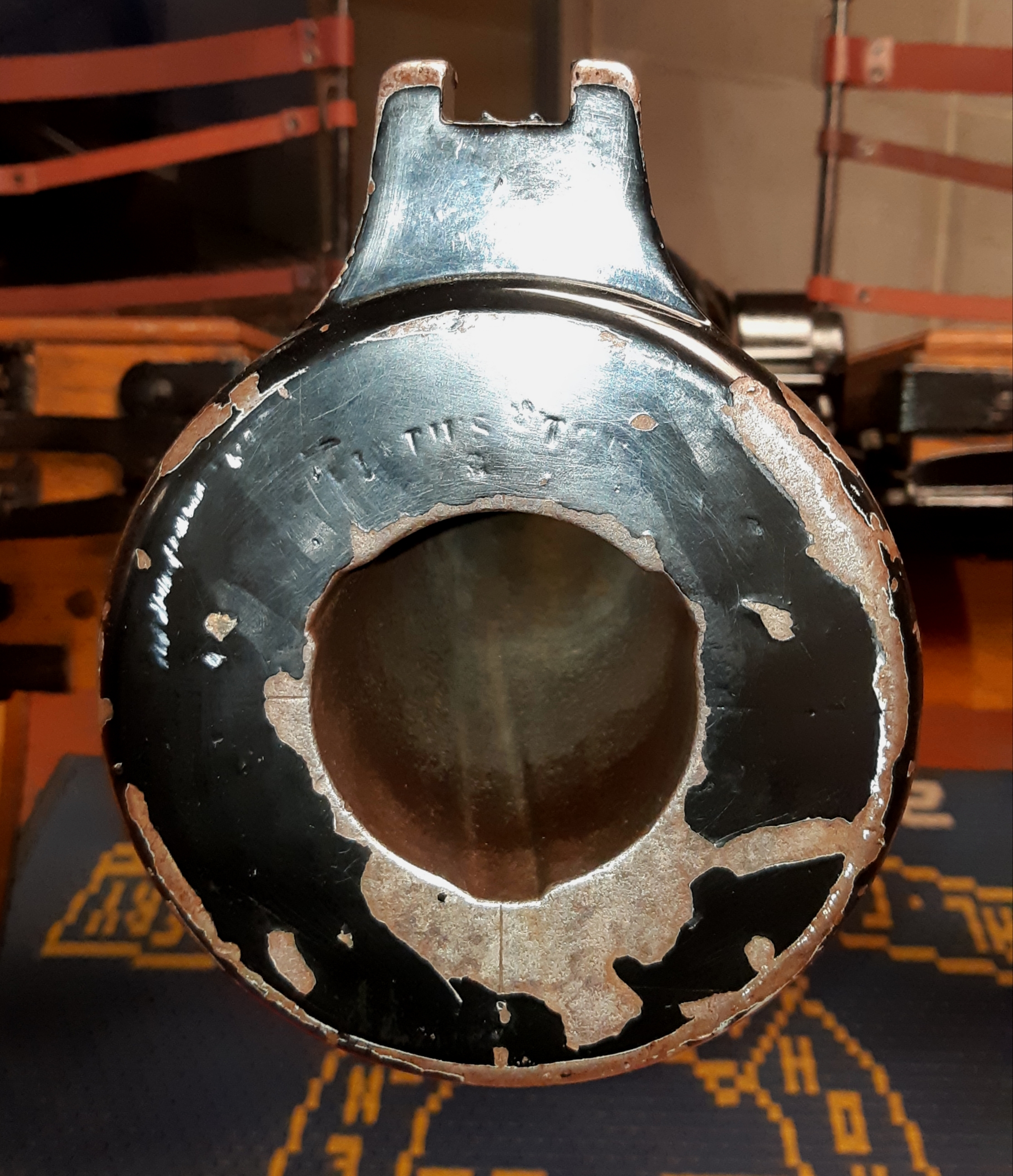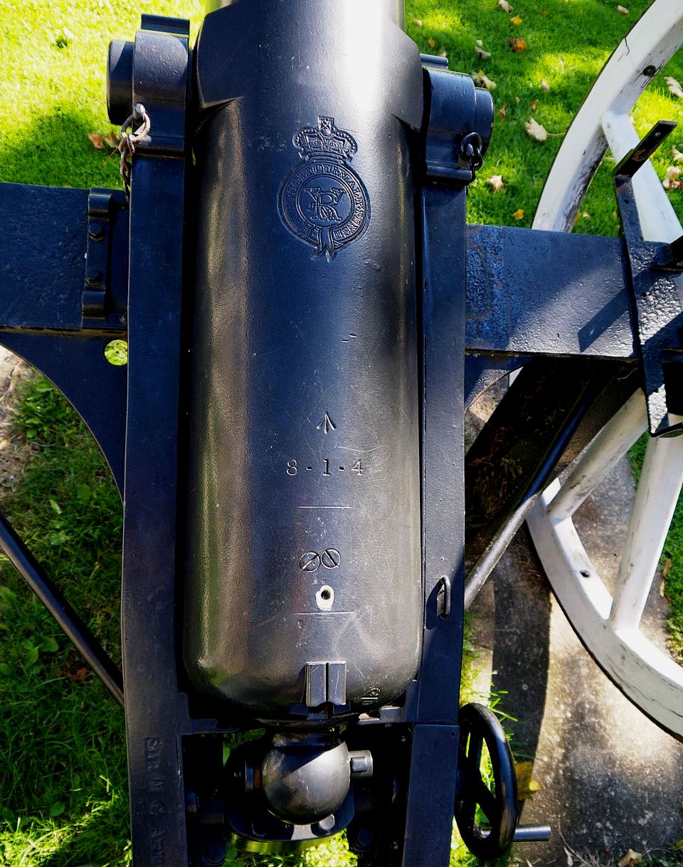 The CWM artefact (serial No. 595) is a Mk. II that was originally intended for sea service. It is on loan to 30th Fd. The carriage is a reproduction of a slide mounting for a traversing carriage, which was used in fortifications. The 9-pounder 6-cwt gun was another version that was intended for field use. The large hole on the top right of the breech is for the gun sight. Brigadier W. W. Turner donated the gun to the museum. It possibly served in a Royal Artillery Battery stationed in the Halifax garrison in the 1870s (1, 2, and 7 Battery, RA, were in Halifax from 1873-1876). CWM 20010245-002. (Doug Knight)