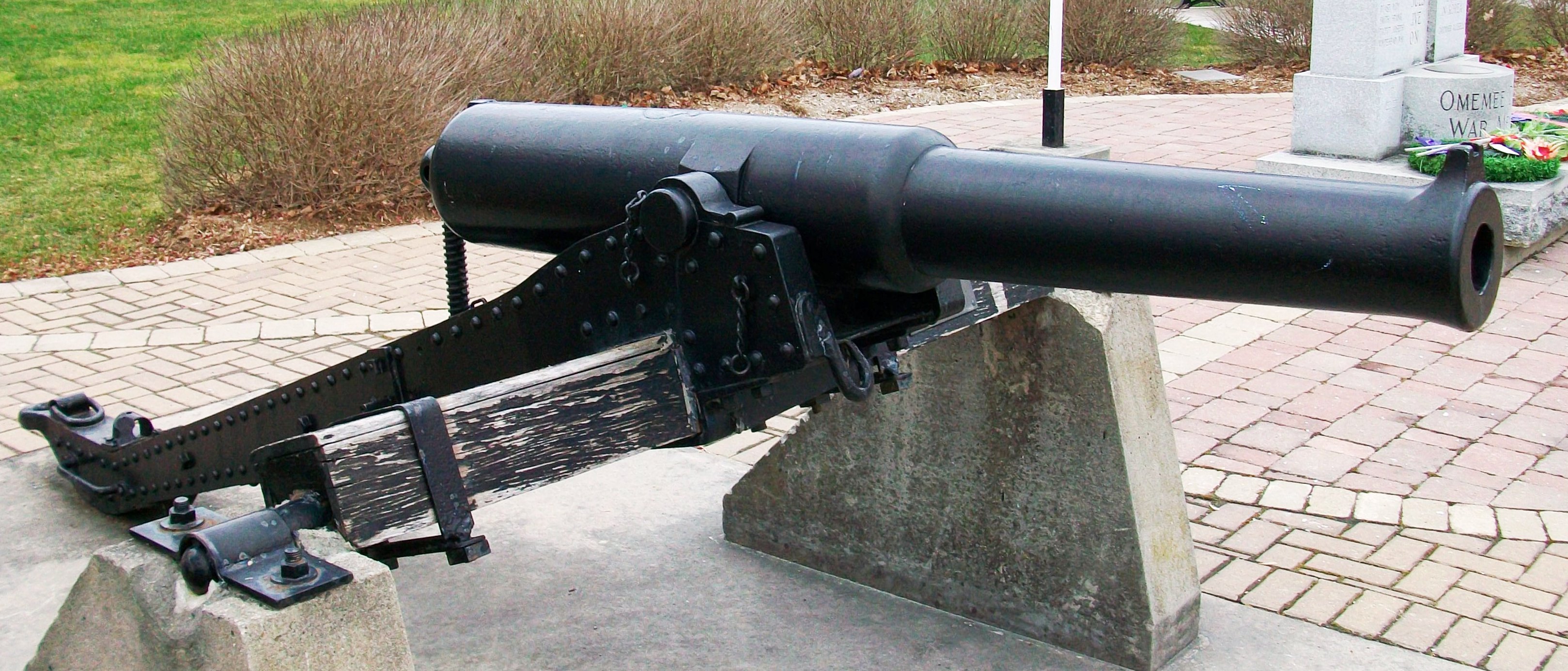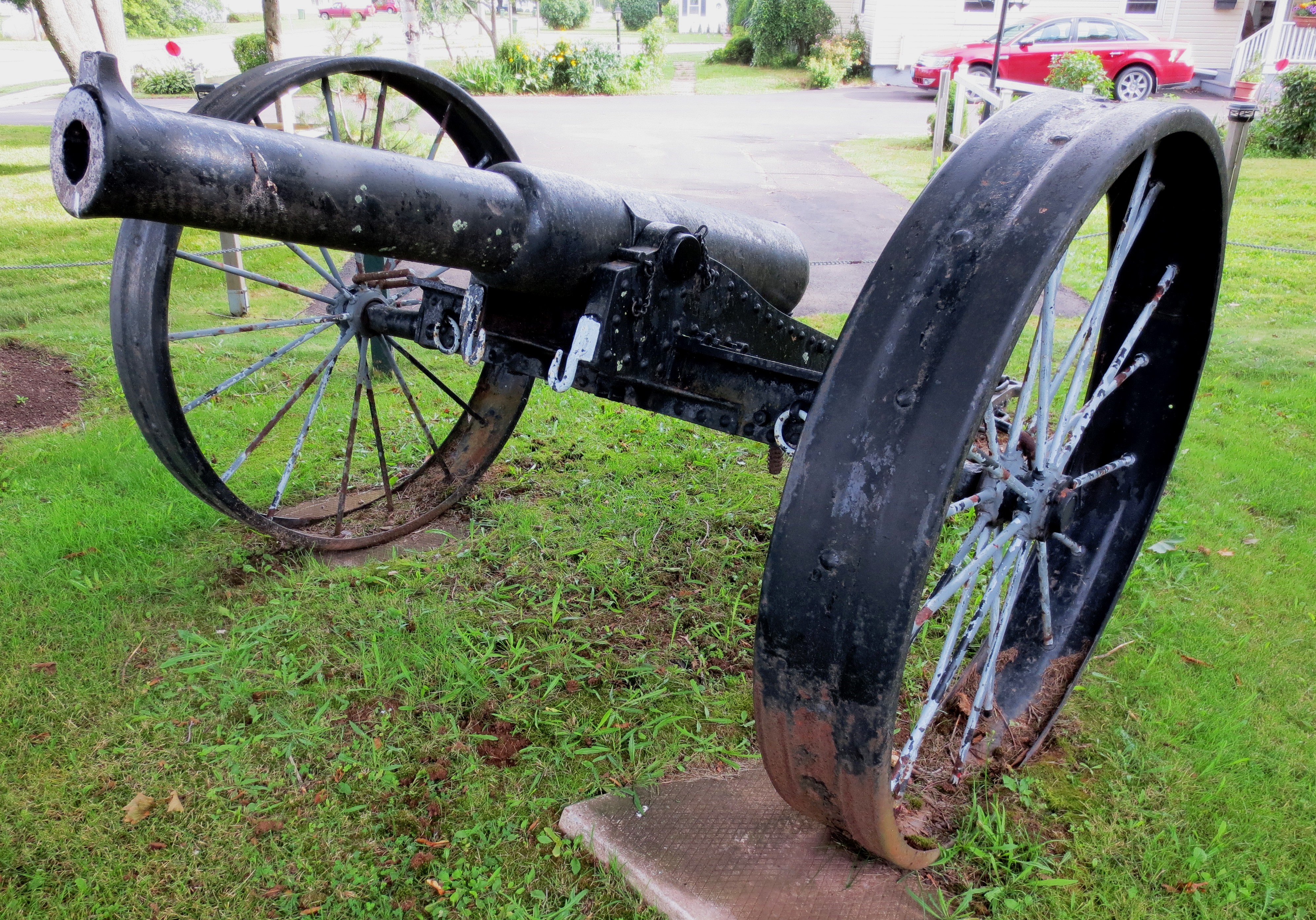 9-pounder 8-cwt Muzzleloading Rifle, weight 8-1-8 (932 lbs), (RGF No. 639, 1871) on the left trunnion. W.G. Armstrong & Co., Newcastle on Tyne(Serial No. 1178) on the trail. The gun’s carriage and axle are in place, but there are no wheels. Queen Victoria cypher. The gun is located beside the War Memorial.