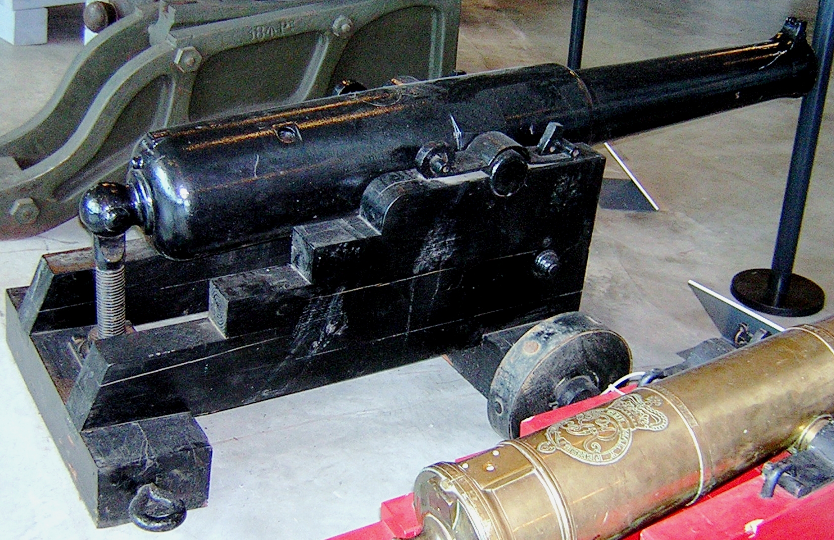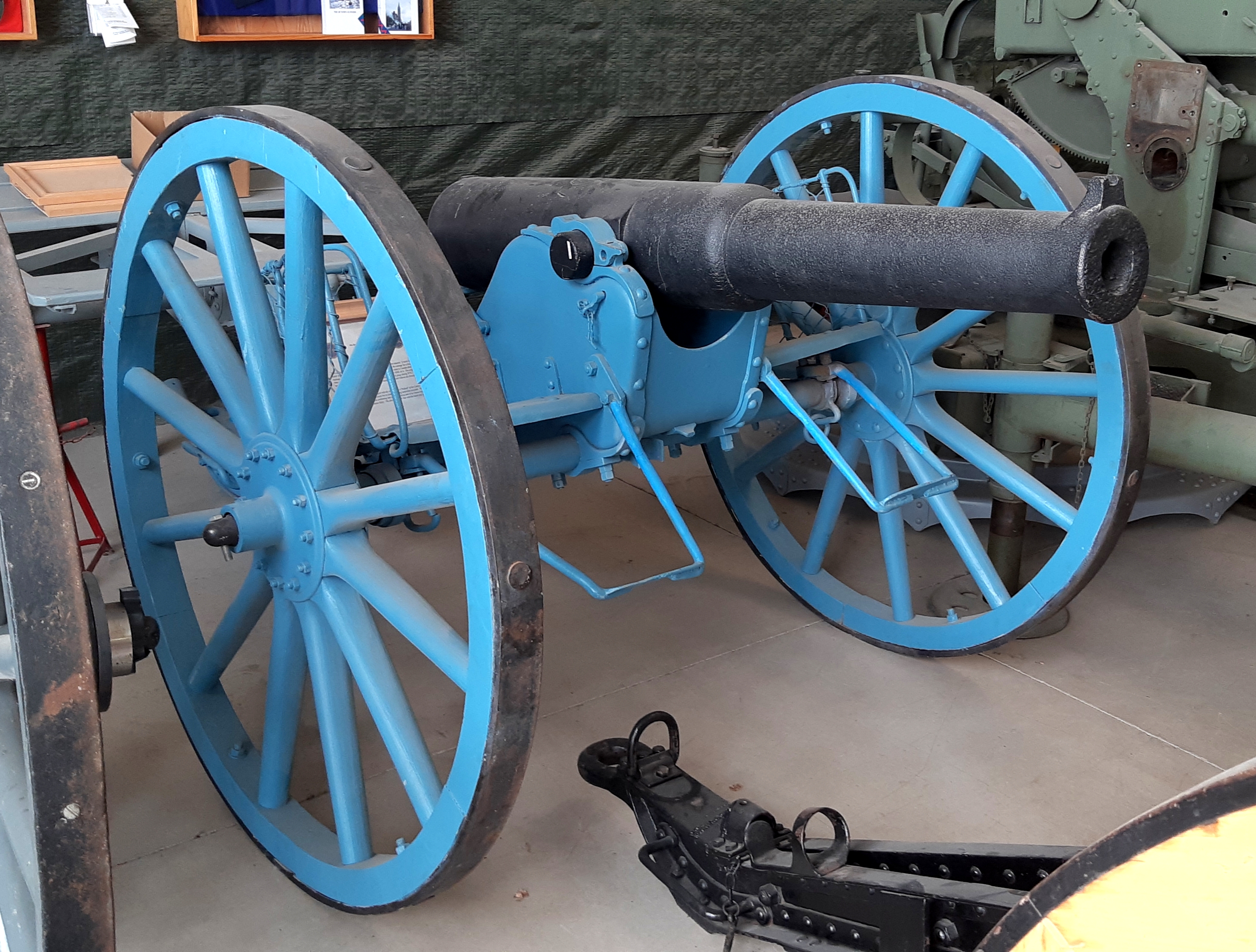 9-pounder 8-cwt Muzzleloading Rifle, weight 8-1-4 (928 lbs), (RGF No. 23, 1870) on the left trunnion, Firth Steel 1580 on the muzzle, Queen Victoria cypher, W arrow D, R.C.D. 1877, No. 459, I, stamped on the iron carriage with wood wheels. Inside the museum.