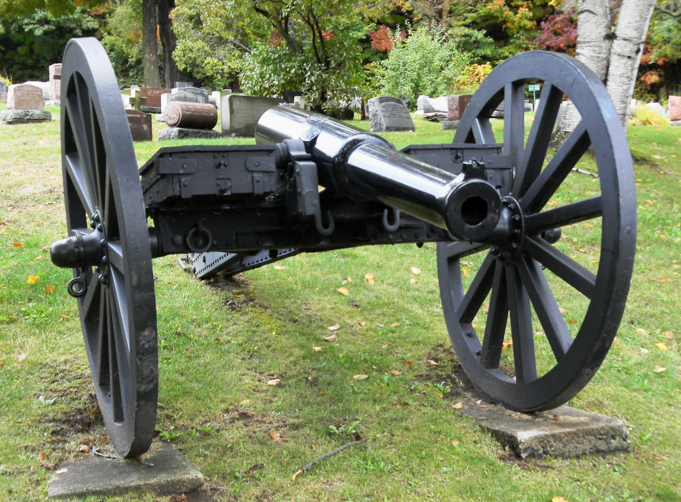 9-pounder 8-cwt Muzzleloading Rifle, weight 8-1-8 (932 lbs), (RGF No. 637, 1874) on the left trunion, mounted on a c1840 field carriage, No. 1 on the North side of the Section Militaire du cimetière Mont-Royal, on a hill overlooking the military gravestones.